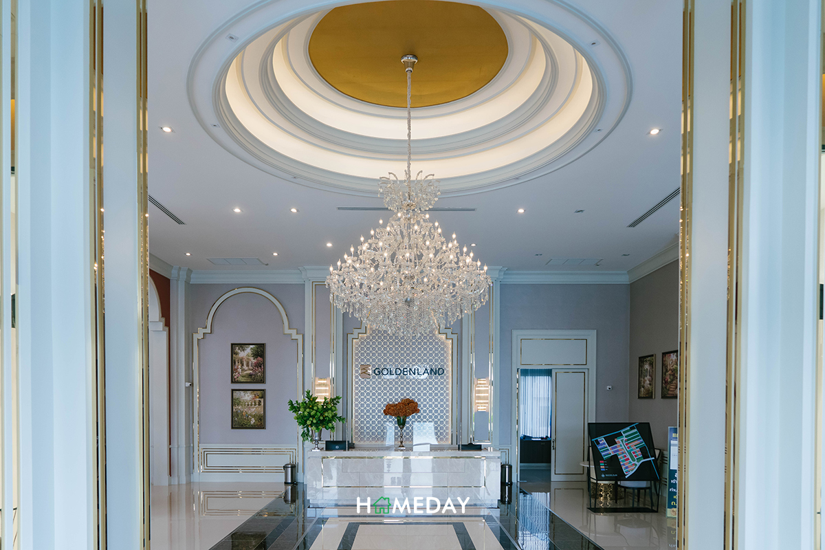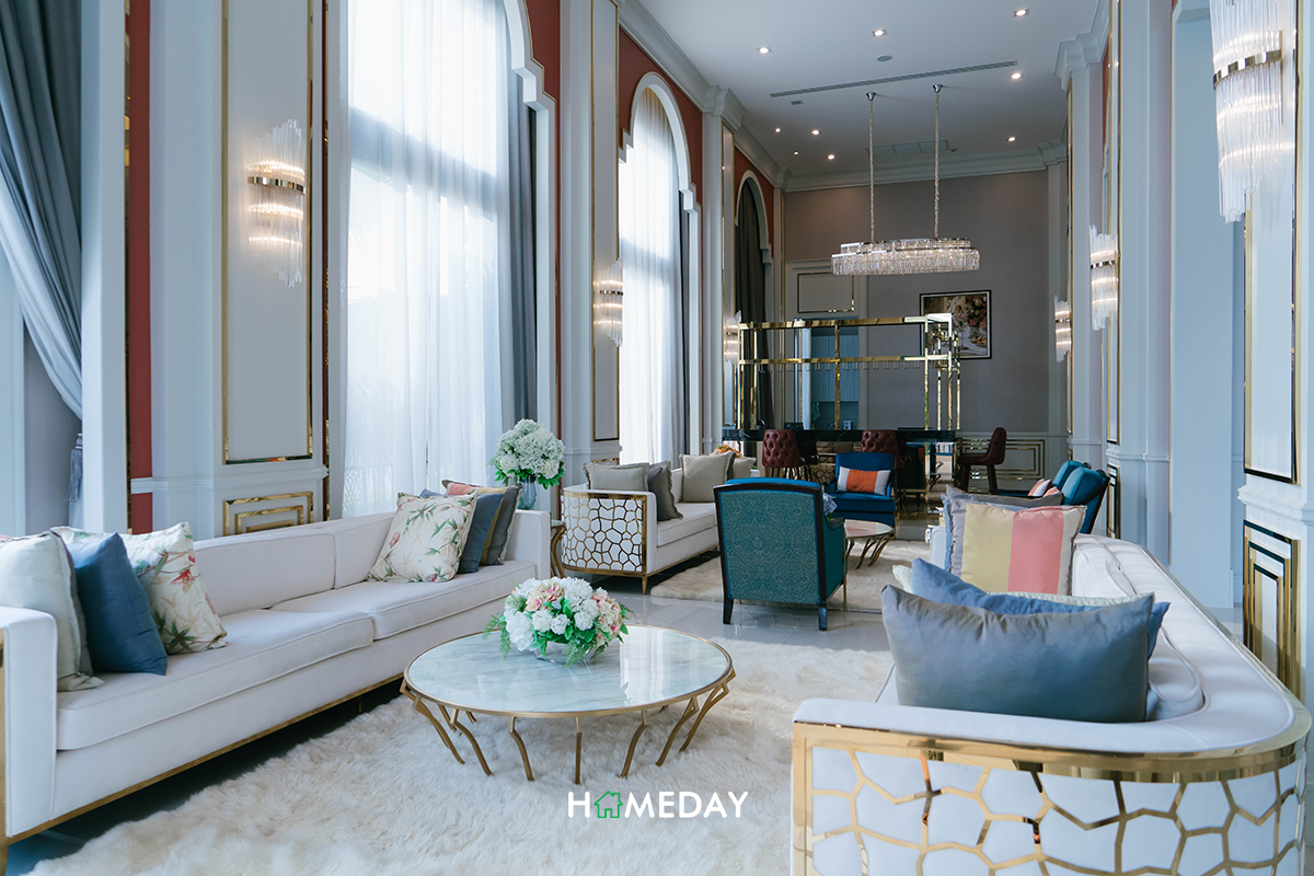 มาดูพื้นที่ในร่มของส่วนอาคาร Clubhouse กันบ้างค่ะ ภายในเมื่อเปิดเข้ามา ก็จะเจอกับห้องโถงที่มีความโอ่อ่า ตกแต่งด้วยแชนเดอร์เลีย ให้ความรู้สึกหรูหรา มีเคาน์เตอร์ต้อนรับอยู่ด้านในค่ะ