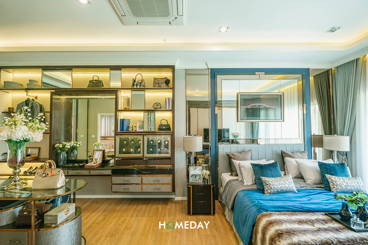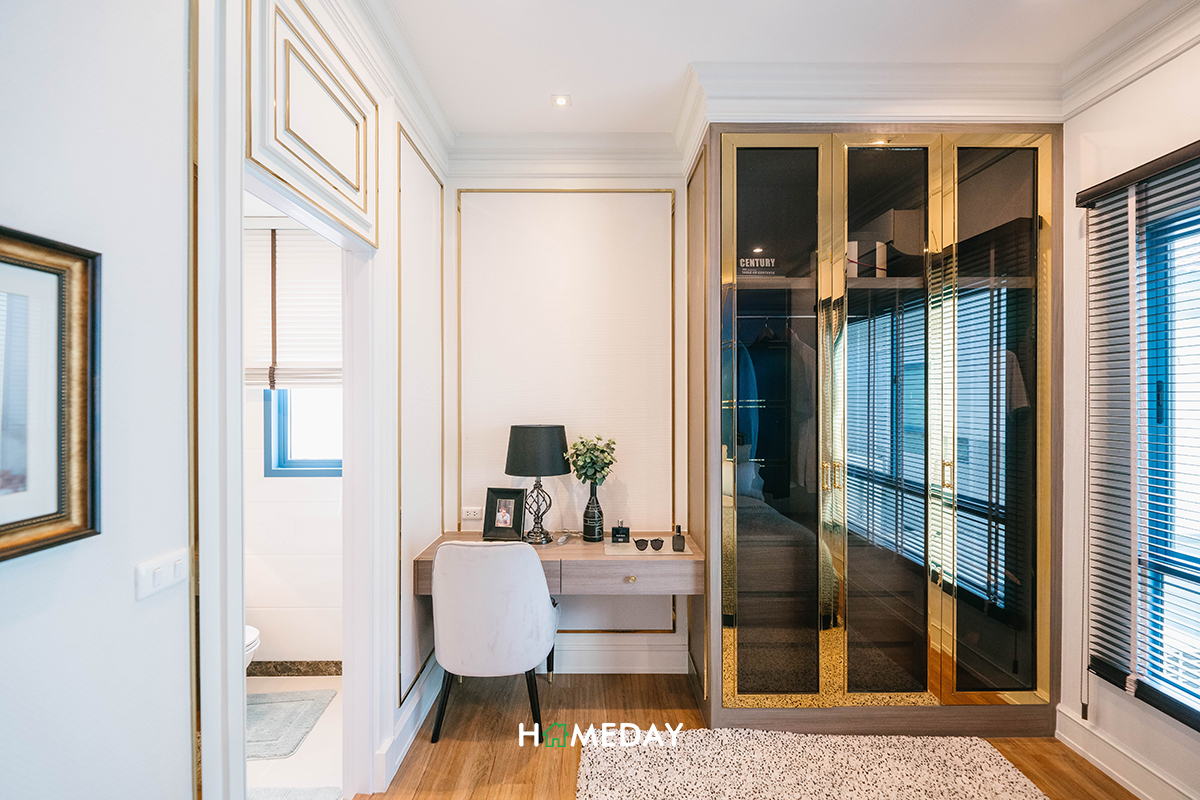 ทางฝั่งส่วนสำหรับใช้งานด้านซ้ายมือ ทางโครงการออกแบบให้ดูเป็นลักษณะของ Walk-in Closet ที่มีการกั้นฉากแยกสัดส่วนในฝั่งของพื้นที่พักผ่อนและห้องน้ำไปในตัวค่ะ ดูลงตัวมาก ๆ อีกทั้งยังสามารถจัดเก็บเสื้อผ้า กระเป๋า และเครื่องประดับต่าง ๆ ได้อย่างเต็มที่อีกด้วย จากด้านหน้าส่วน Walk-in Closet เมื่อเดินไปจนสุดทางก็จะเจอกับห้องน้ำส่วนตัวภายในห้องพอดี การออกแบบลักษณะนี้ทำให้ได้ความเป็นส่วนตัวมากขึ้นด้วยค่ะ