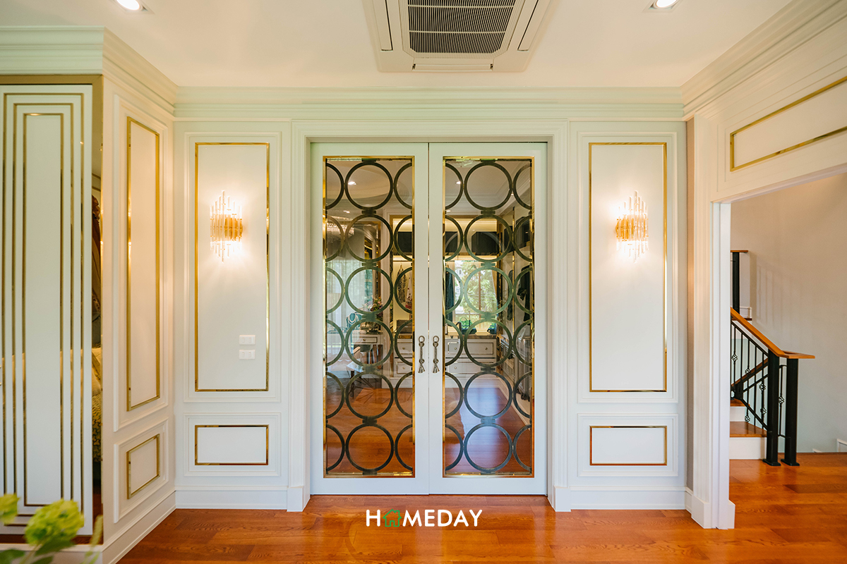 ทางด้านของประตูทางเข้าหลัก มีความแตกต่างไปจากแบบบ้านก่อนหน้านี้ทั้งหมดเลยค่ะ บานประตูเปลี่ยนมาเป็นแบบบานเปิดคู่ มีลูกฟักกระจกด้านข้าง 2 บาน ซึ่งก็ดูดีไปอีกแบบค่ะ พื้นที่ Living Area ยังคงความกว้าง ได้พื้นที่ใช้สอยมาแบบจัดเต็ม จะวางทั้งชุดโซฟาขนาดใหญ่ พร้อมเก้าอี้นวดอีกสัก 2 ตัว ก็ไม่มีปัญหา ยังเหลือพื้นที่ให้วางได้ทั้งโต๊ะกลางและชั้นวางทีวีค่ะ ไม่ต้องกลัวว่าจะเดินเข้า-ออกไม่สะดวกเลย