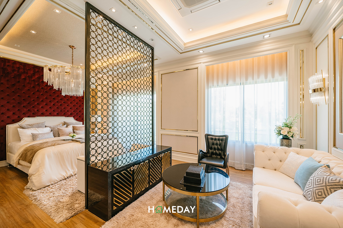 พื้นที่ในฝั่งพักผ่อนค่อนข้างใหญ่มาก เราสามารถกั้นฉาก แบ่งสัดส่วนของพื้นที่พักผ่อนส่วนนี้เพิ่มเติมแบบในบ้านตัวอย่างได้เลยนะคะ อย่างห้องตัวอย่างนี้ก็จะแบ่งออกเป็นมุมเตียงนอนและมุมโซฟานั่งพักผ่อน กั้นกลางด้วยฉาก ก็จะช่วยเพิ่มสัดส่วนให้เป็นระเบียบเรียบร้อยได้มากขึ้นค่ะ