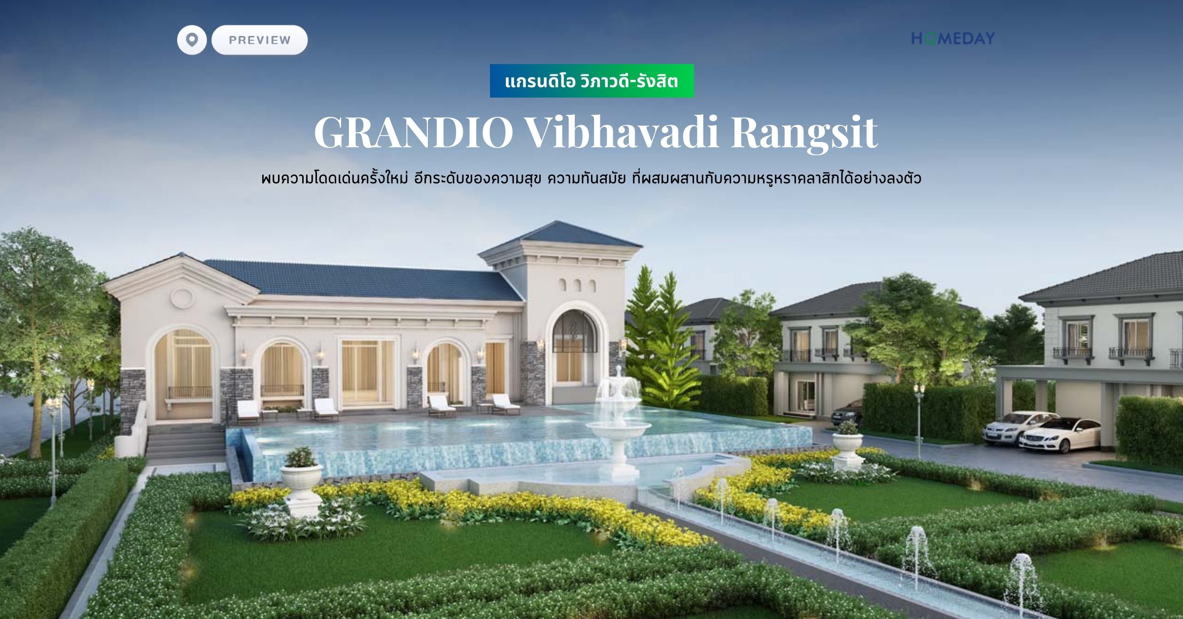 "โครงการ แกรนดิโอ วิภาวดี-รังสิต (GRANDIO Vibhavadi Rangsit) บ้านหรูที่ใคร ๆ ก็ปรารถนา จากแรงบันดาลใจของงานออกแบบสถาปัตยกรรมแบบ Classic ทางฝั่ง Mediterranean ผสมผสานกับงานออกแบบยุคใหม่ เกิดเป็น Modren Classic Style ที่แตกต่างอย่างโดดเด่น พร้อมฟังก์ชั่นเพื่อการอยู่อาศัยที่มากกว่าและคุ้มกว่าใคร"