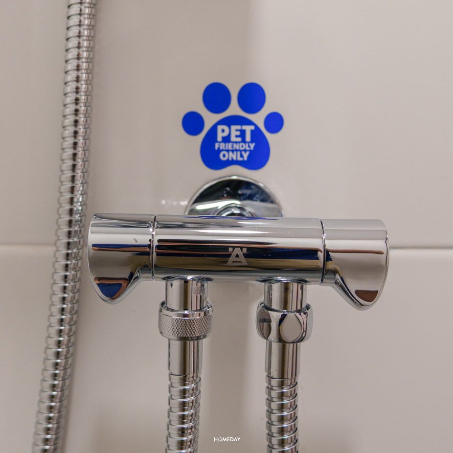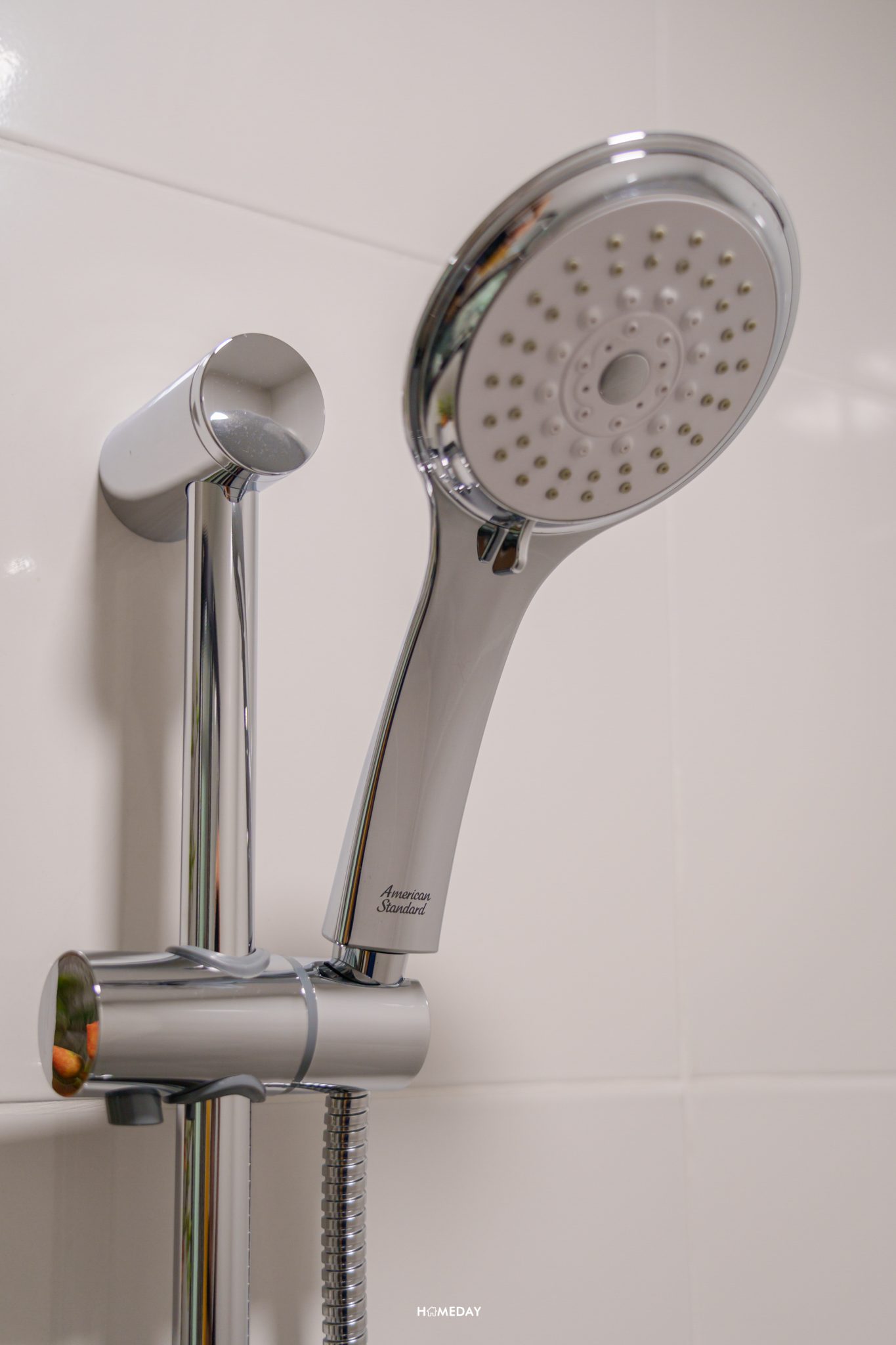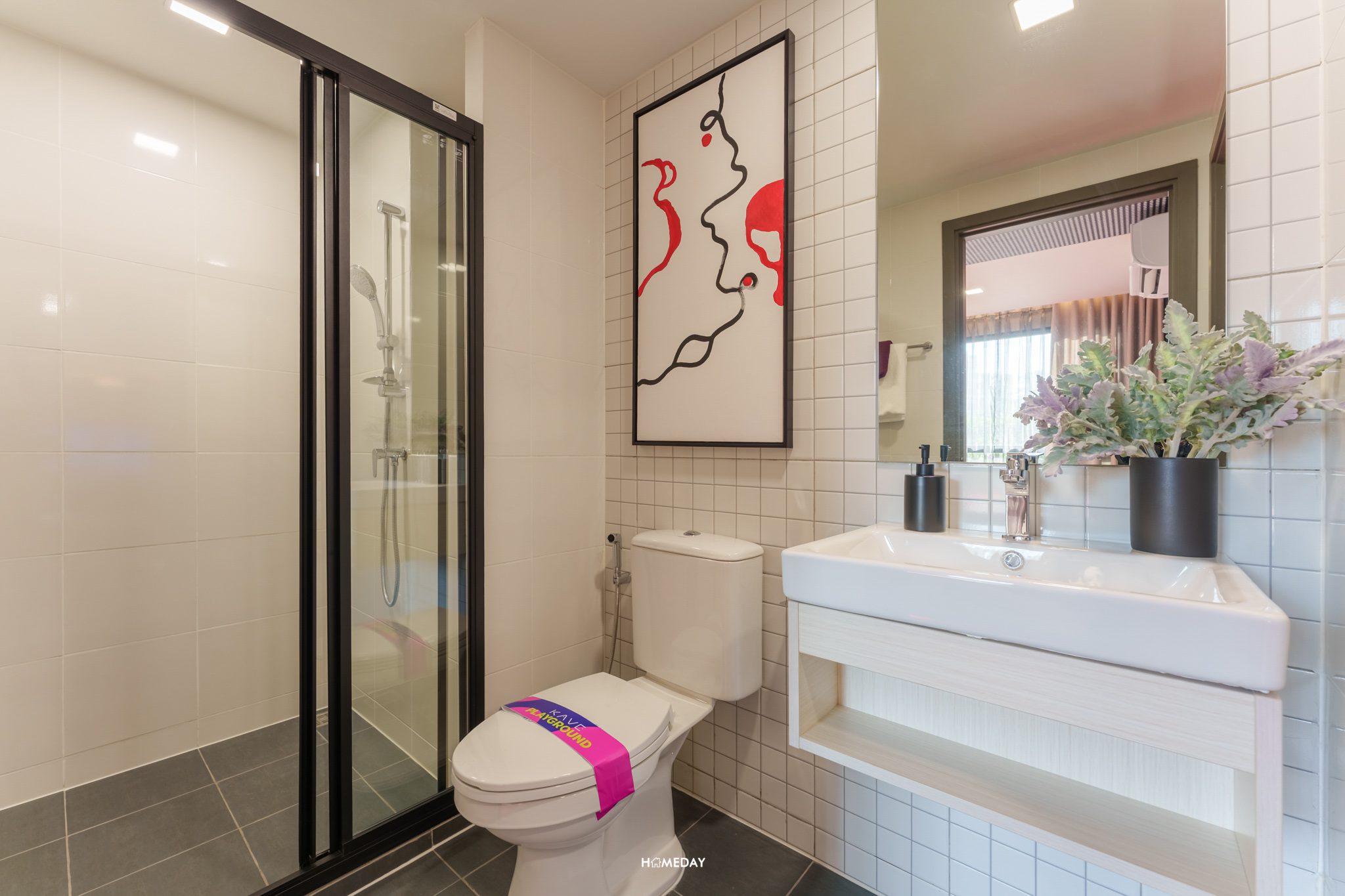 ภายในห้องน้ำ แบ่งโซนเปียกและแห้งชัดเจน พร้อมติดตั้ง ฉากกั้นกระจกมาให้เรียบร้อย และที่น่าสนใจคือ ด้านในมีก๊อกน้ำแบบ 2 วาล์ว แยกหัวฝักบัวสำหรับเจ้าของห้องและสำหรับน้องหมาน้องแมวโดยเฉพาะ ใช้งานง่าย สะดวกแน่นอน ในส่วนของชุดสุขภัณฑ์และอุปกรณ์ภายในห้องน้ำ ก็ให้มาตามมาตรฐานโครงการ พร้อมเดินระบบรองรับการติดตั้งเครื่องทำน้ำอุ่นไว้ให้เรียบร้อยแล้วครับ เรียกได้ว่าครบ พร้อมใช้งานจริงทั้งคนและน้องสัตว์เลี้ยงเลยครับ