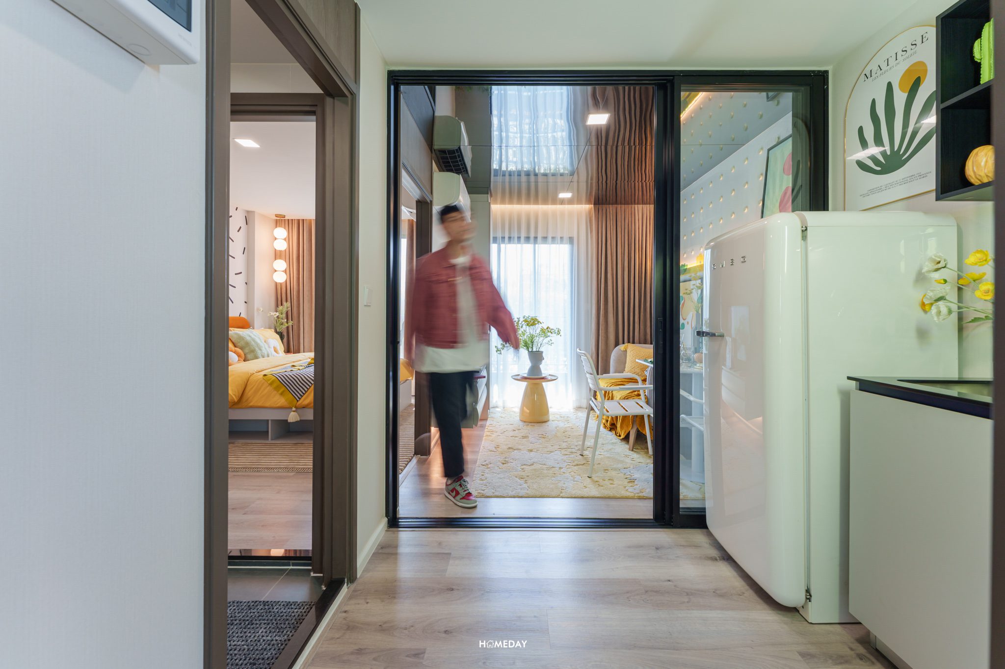 ครัวของห้องนี้เป็นแบบปิด ซึ่งถือว่าใช้งานได้จริงและเป็นสัดส่วนดีทีเดียวครับ มี ประตูกระจกบานเลื่อน กั้นระหว่างครัวกับพื้นที่นั่งเล่น ทำให้กลิ่นและควันจากการทำอาหารไม่ไปรบกวนส่วนอื่น ๆ ของห้อง เหมาะมากสำหรับคนที่ทำอาหารเบา ๆ เป็นครั้งคราวแต่ก็ยังอยากให้ห้องดูเรียบร้อย เมื่อเดินเข้ามาจะเจอกับเคาน์เตอร์ครัวที่ Built-in มาให้จากโครงการ วางชิดผนังฝั่งหนึ่ง พร้อมเว้นพื้นที่สำหรับวางตู้เย็นไว้อย่างลงตัว พื้นที่ทางเดินในครัวถือว่าพอเหมาะ เดินเข้า-ออก หรือยืนทำครัวก็สะดวกไม่อึดอัด