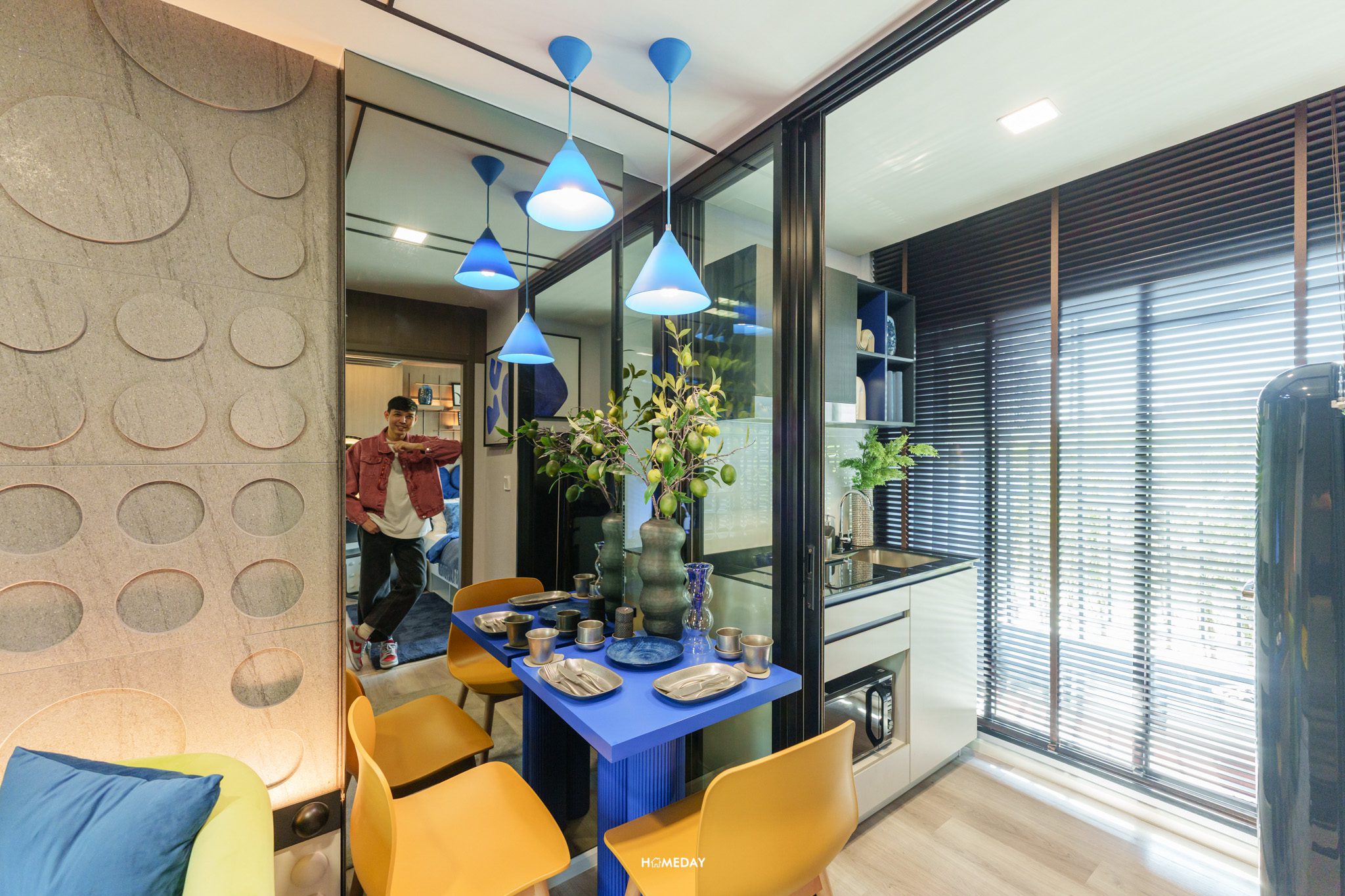 เมื่อเปิดเข้ามาในห้อง จะเจอกับโซนนั่งเล่น และพื้นที่สำหรับวางโต๊ะทานอาหารขนาด 2 ที่นั่งอยู่ด้านหน้า ส่วนครัวจะอยู่ด้านในสุดติดกับระเบียง บรรยากาศของห้องโดยรวมดูสว่างพอสมควรครับ เพราะแม้ห้องนั่งเล่นจะไม่ได้อยู่ติดหน้าต่างโดยตรง แต่ก็ได้แสงธรรมชาติที่ส่องเข้ามาผ่านห้องนอน ช่วยให้ห้องดูไม่ทึบจนเกินไป