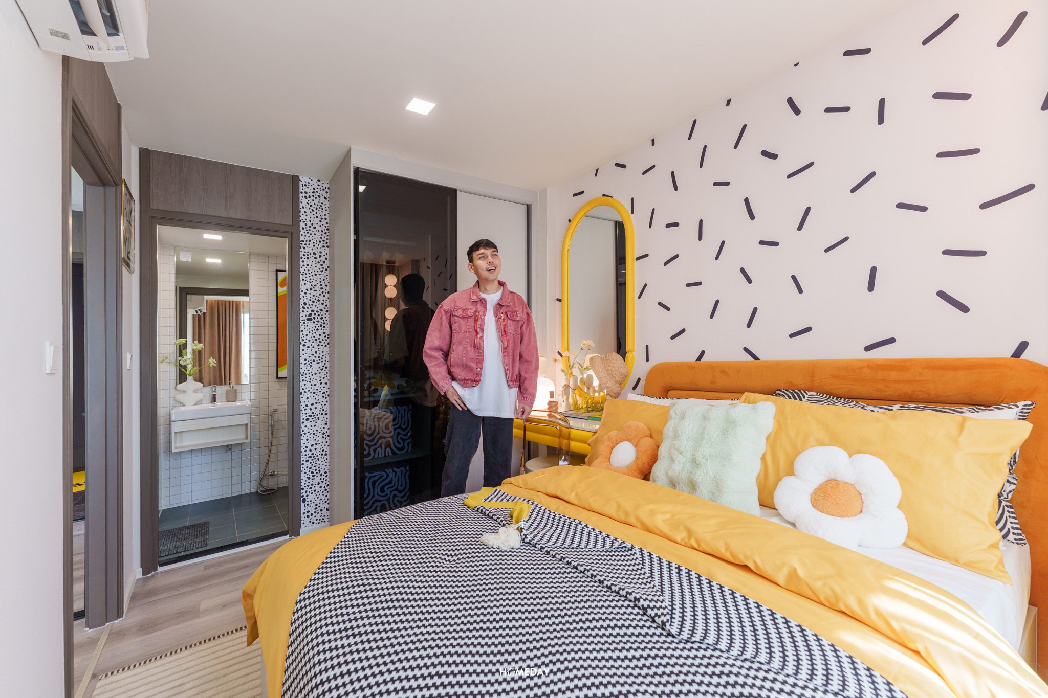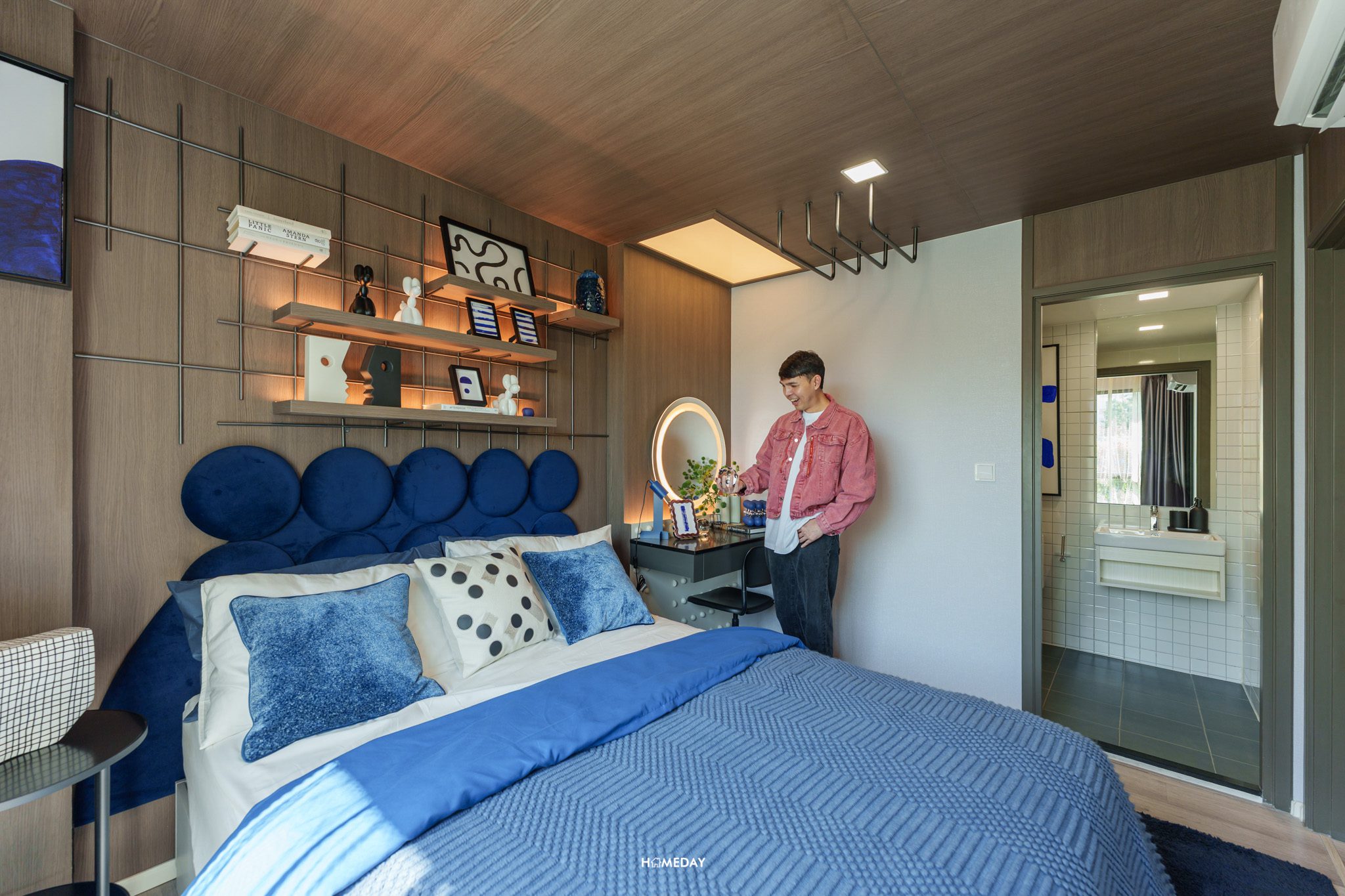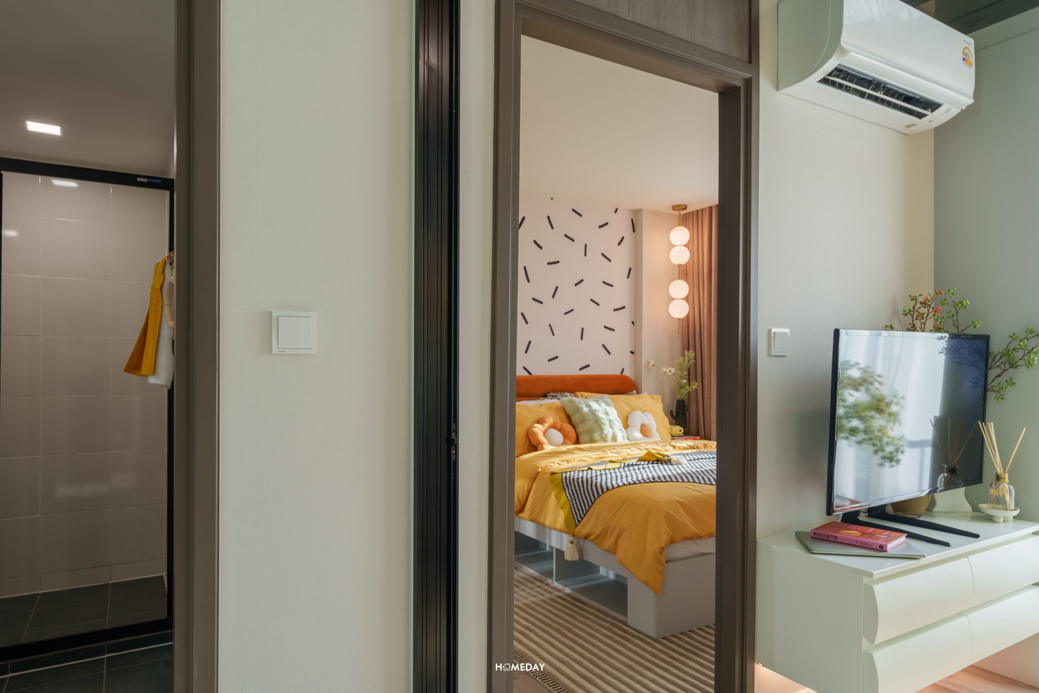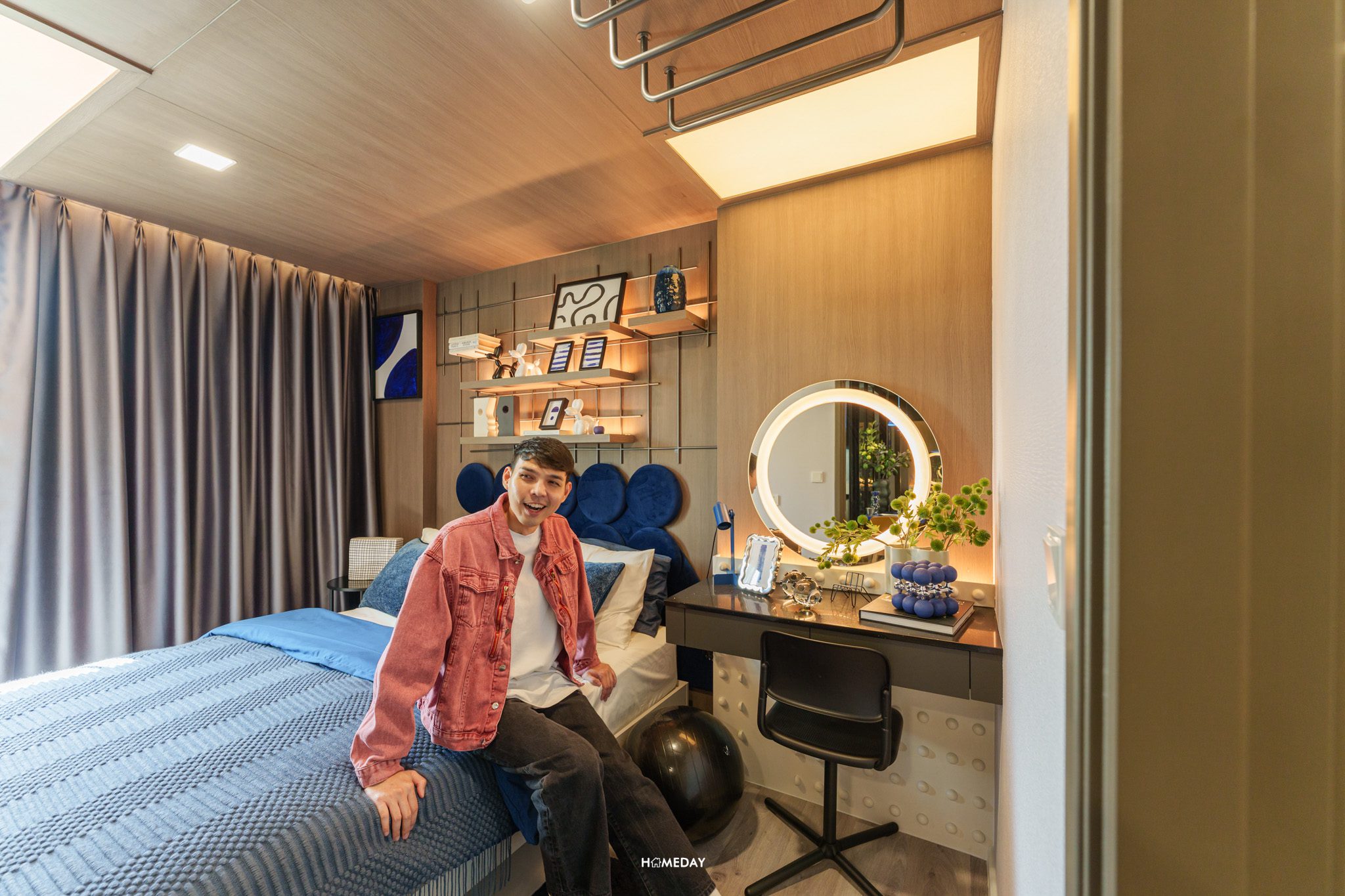 ห้องนอนของไทป์นี้ มาพร้อมประตูบานทึบอีกเช่นเคย จึงช่วยเพิ่มความเป็นส่วนตัวมากกว่าการกั้นด้วยกระจก ทำให้ใช้งานได้เต็มฟังก์ชันทั้งในเรื่องการพักผ่อนและการจัดวางเฟอร์นิเจอร์ เดี๋ยวเราเข้าไปดูภายในห้องนอนกันต่อครับ