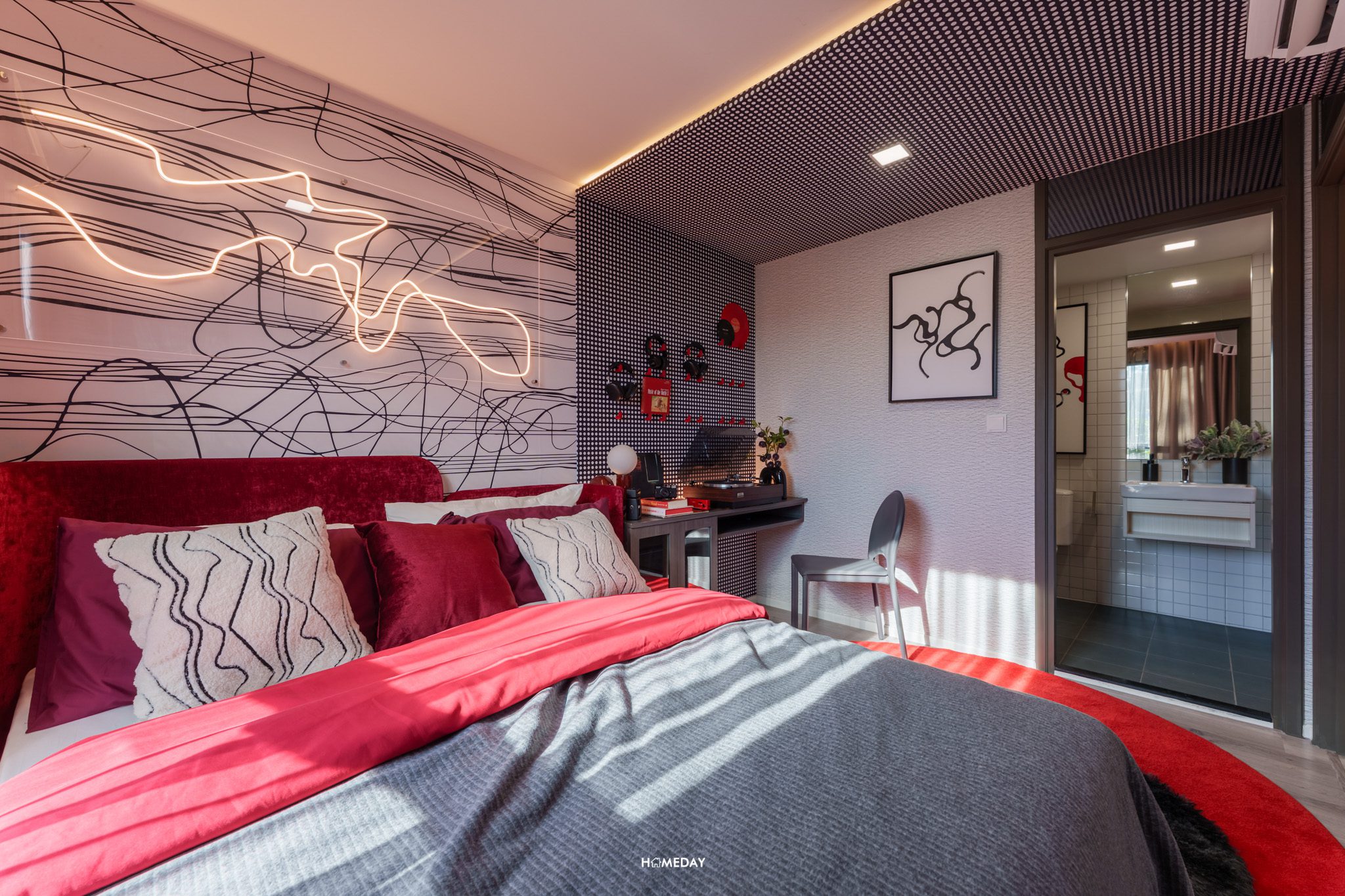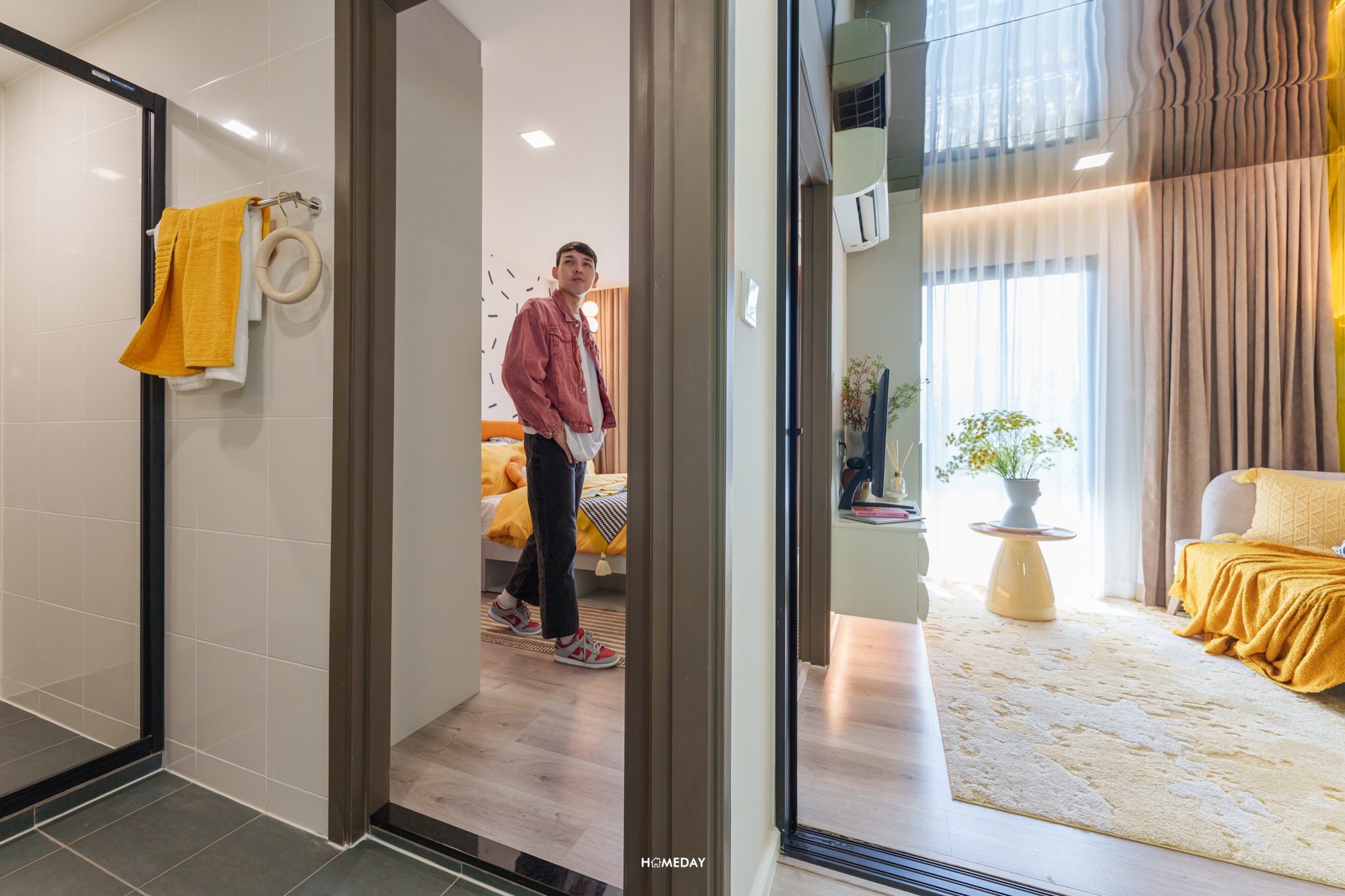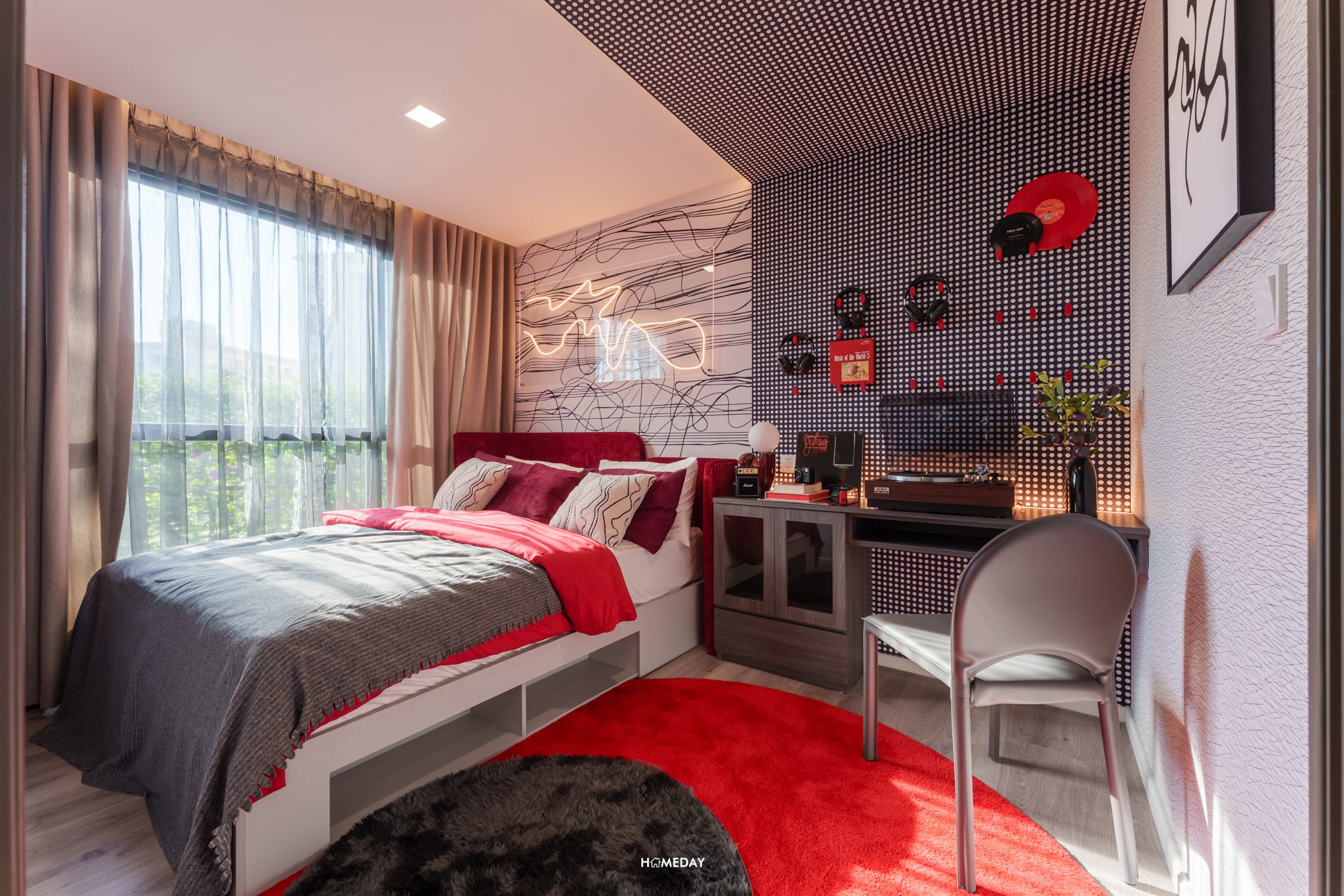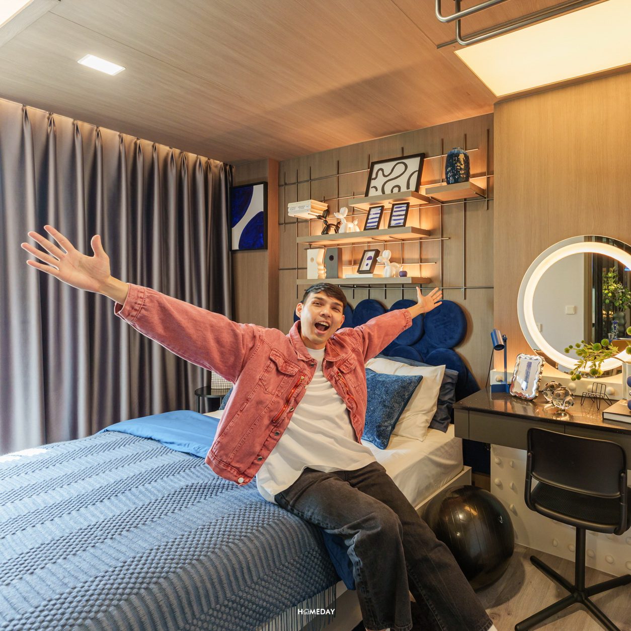 ห้องนอนของไทป์นี้ มาพร้อมประตูบานทึบอีกเช่นเคย จึงช่วยเพิ่มความเป็นส่วนตัวมากกว่าการกั้นด้วยกระจก ทำให้ใช้งานได้เต็มฟังก์ชันทั้งในเรื่องการพักผ่อนและการจัดวางเฟอร์นิเจอร์ เดี๋ยวเราเข้าไปดูภายในห้องนอนกันต่อครับ
