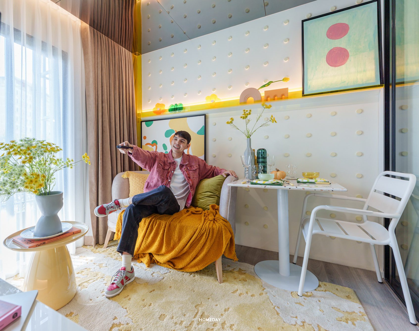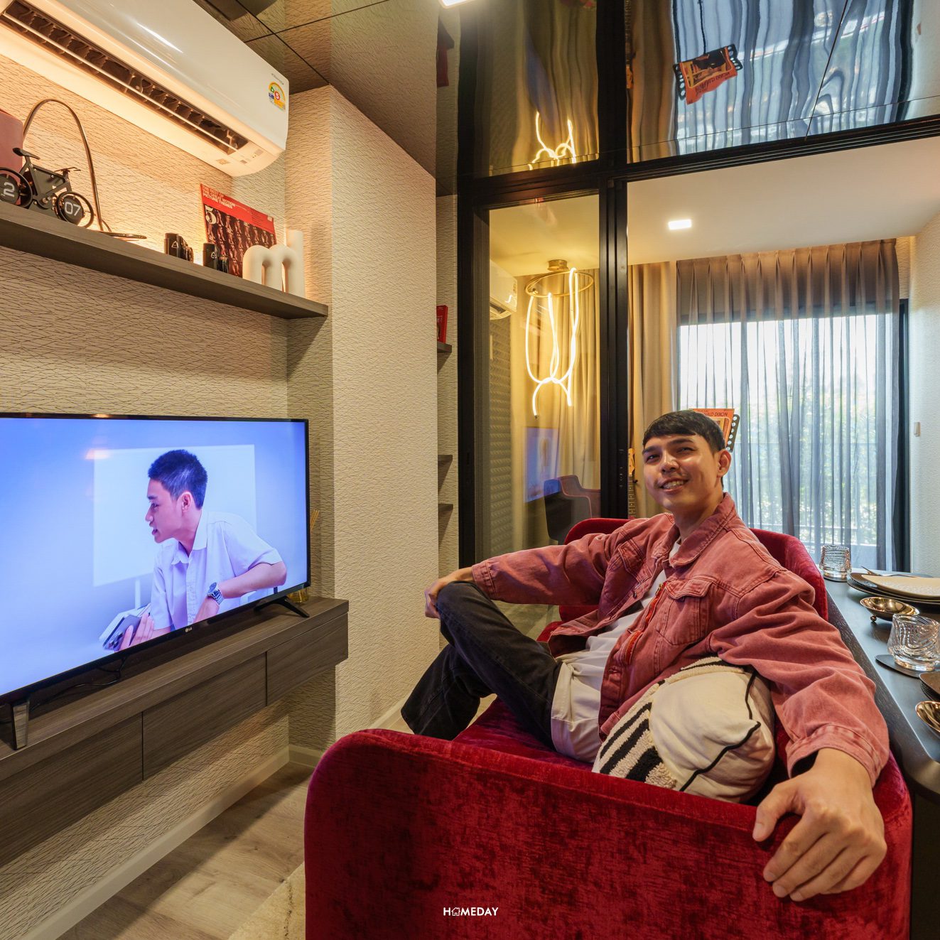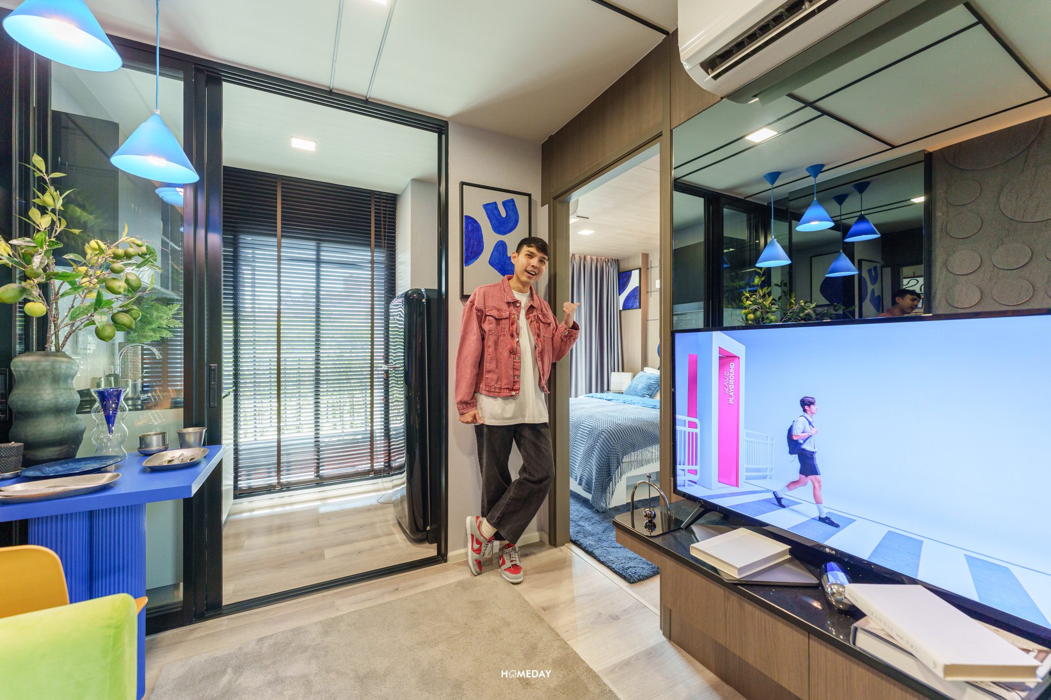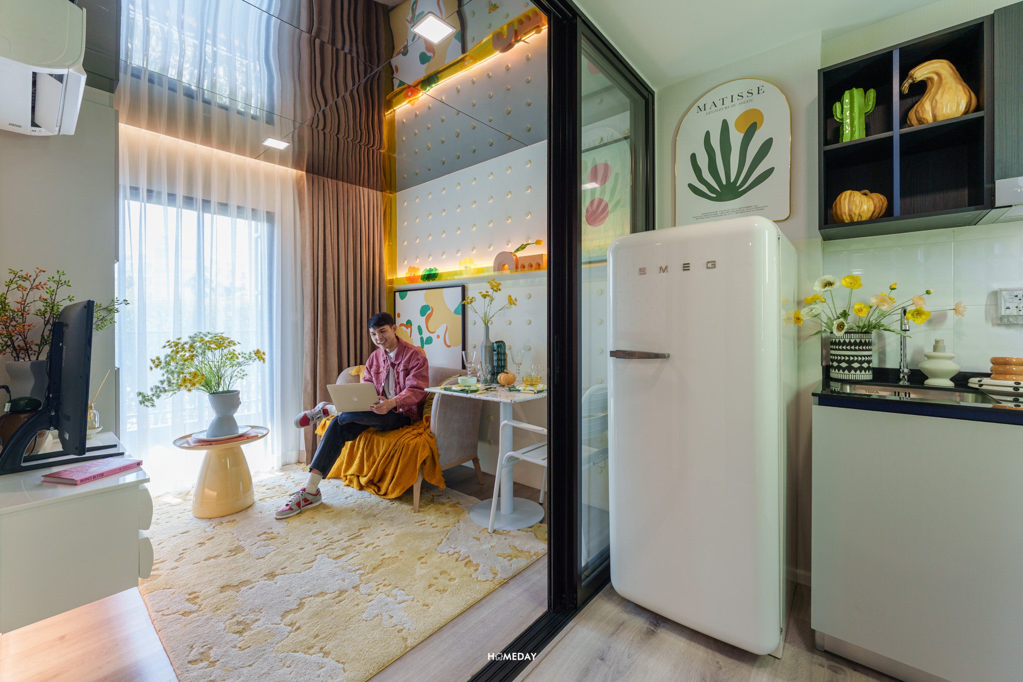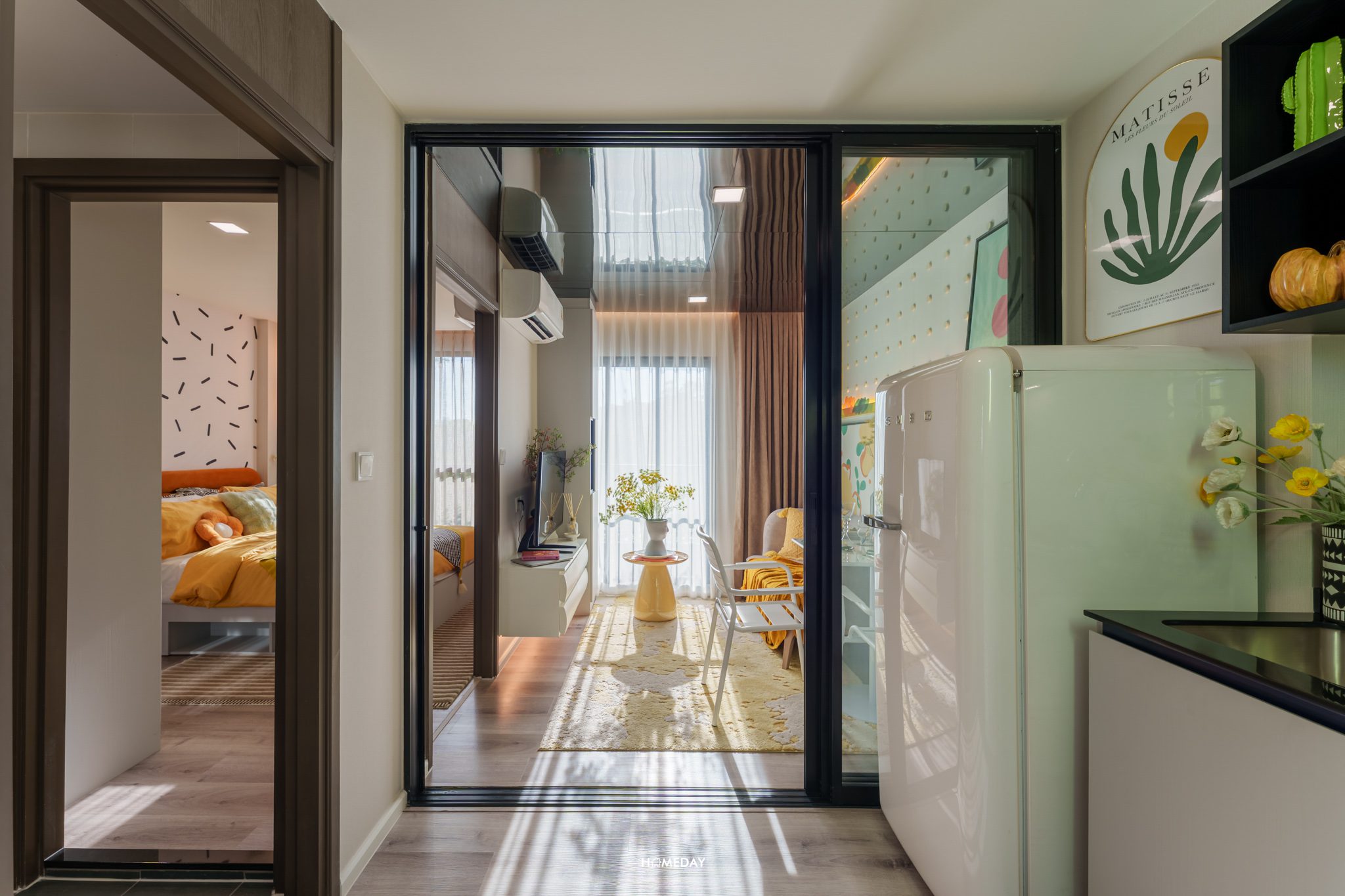เดินผ่านโซนครัวเข้ามาด้านใน จะพบกับห้องนั่งเล่นที่เชื่อมต่อกับระเบียง ทำให้บรรยากาศภายในห้องดูโปร่ง สว่าง และมีลมพัดผ่านตลอดวัน แสงธรรมชาติช่วยให้ห้องดูมีชีวิตชีวาแบบไม่ต้องเปิดไฟทั้งวันก็ยังไหว สำหรับพื้นที่ห้องนั่งเล่นจัดวางได้ลงตัว รองรับโซฟาขนาด 2 ที่นั่ง พร้อมวางโต๊ะทานอาหารขนาดเล็กสำหรับ 2 คนได้สบาย ๆ ระยะห่างจากทีวีพอดีสำหรับการใช้งานประจำวัน และดูซีรีส์ชิล ๆ ในวันหยุด ทางโครงการให้โซฟาขนาด 2 ที่นั่งมาด้วยในชุดมาตรฐาน (แนะนำให้สอบถามแบบจริงอีกทีตอนเลือกห้อง) ส่วนโต๊ะทานอาหาร เราสามารถเลือกแบบกะทัดรัดมาตกแต่งเพิ่มเติมได้ตามสไตล์ที่ชอบเลยครับ ห้องนี้ตกแต่งมาได้สดใสมาก ๆ เลยครับ