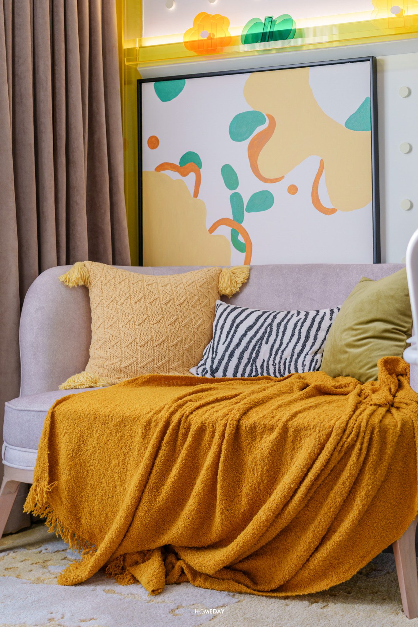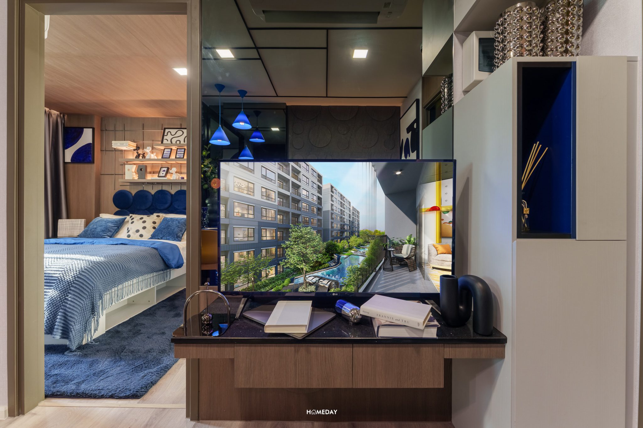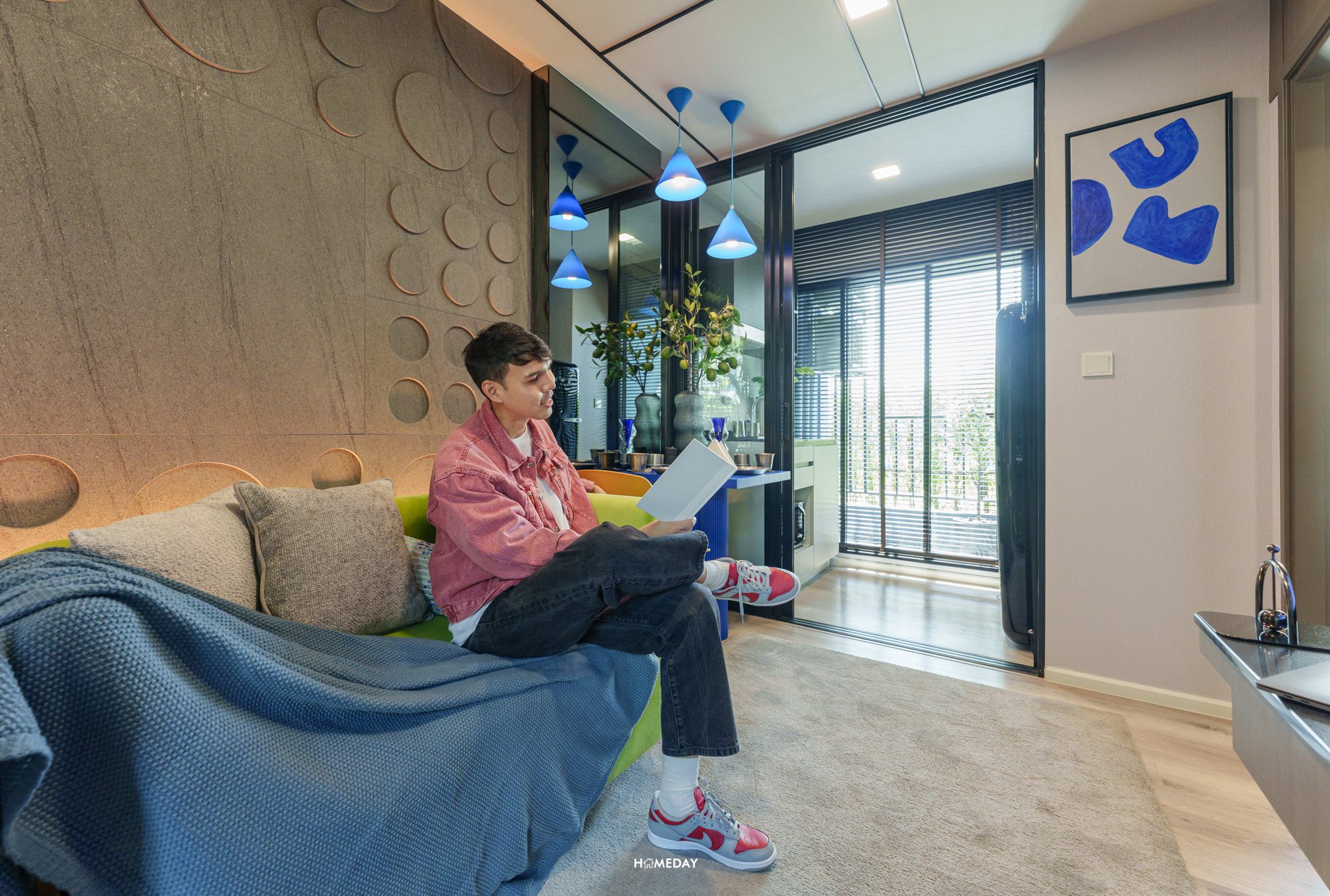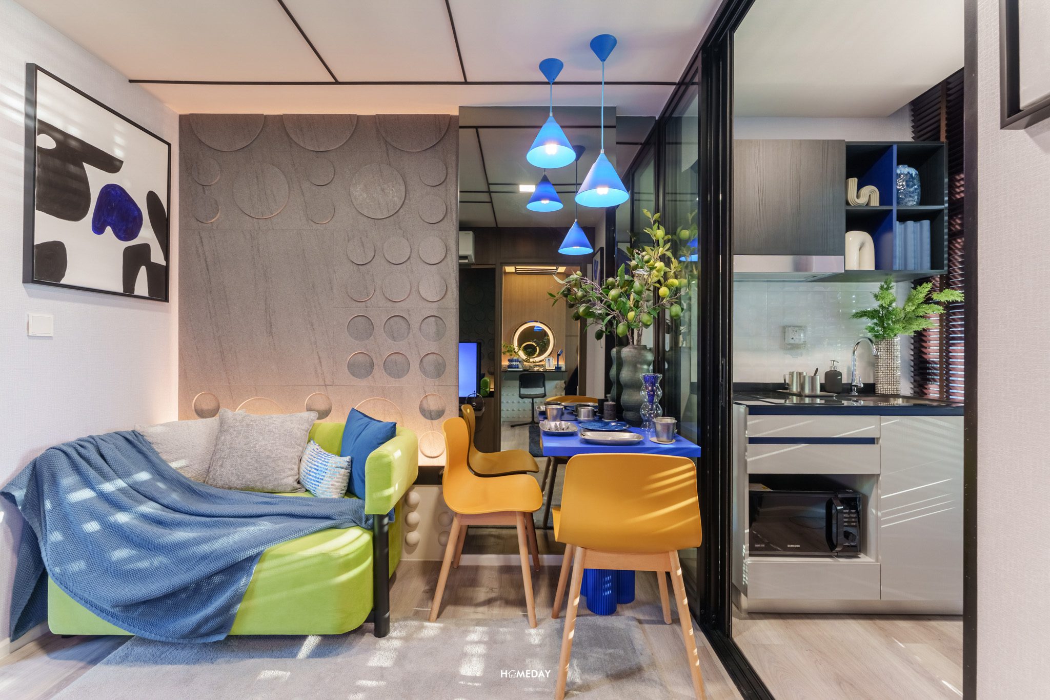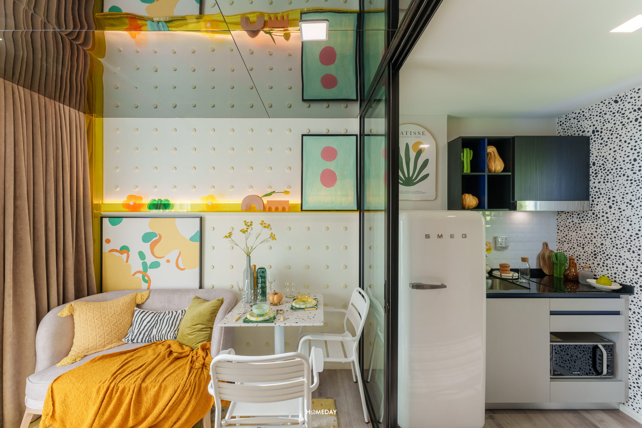 เดินผ่านโซนครัวเข้ามาด้านใน จะพบกับห้องนั่งเล่นที่เชื่อมต่อกับระเบียง ทำให้บรรยากาศภายในห้องดูโปร่ง สว่าง และมีลมพัดผ่านตลอดวัน แสงธรรมชาติช่วยให้ห้องดูมีชีวิตชีวาแบบไม่ต้องเปิดไฟทั้งวันก็ยังไหว สำหรับพื้นที่ห้องนั่งเล่นจัดวางได้ลงตัว รองรับโซฟาขนาด 2 ที่นั่ง พร้อมวางโต๊ะทานอาหารขนาดเล็กสำหรับ 2 คนได้สบาย ๆ ระยะห่างจากทีวีพอดีสำหรับการใช้งานประจำวัน และดูซีรีส์ชิล ๆ ในวันหยุด ทางโครงการให้โซฟาขนาด 2 ที่นั่งมาด้วยในชุดมาตรฐาน (แนะนำให้สอบถามแบบจริงอีกทีตอนเลือกห้อง) ส่วนโต๊ะทานอาหาร เราสามารถเลือกแบบกะทัดรัดมาตกแต่งเพิ่มเติมได้ตามสไตล์ที่ชอบเลยครับ ห้องนี้ตกแต่งมาได้สดใสมาก ๆ เลยครับ