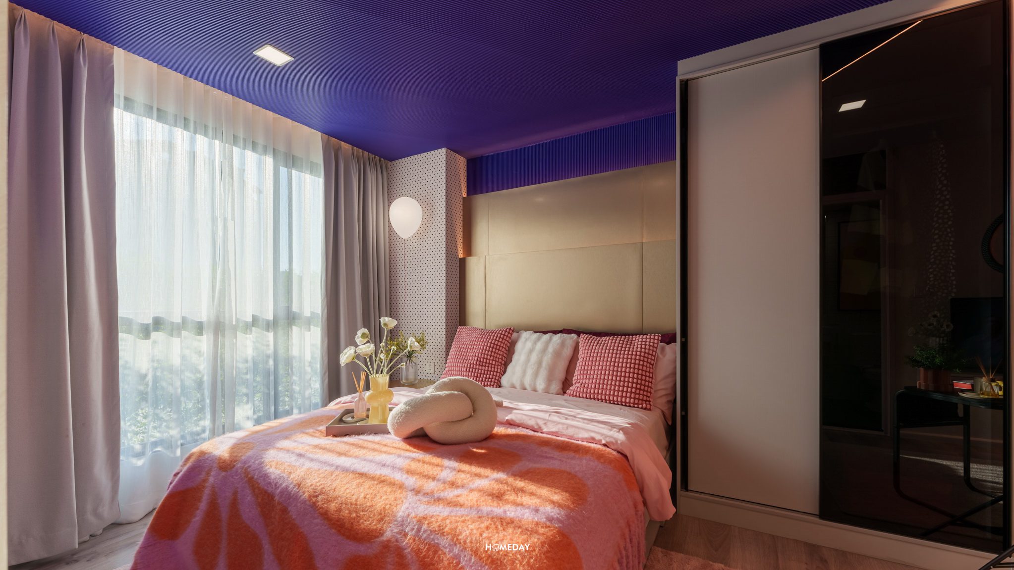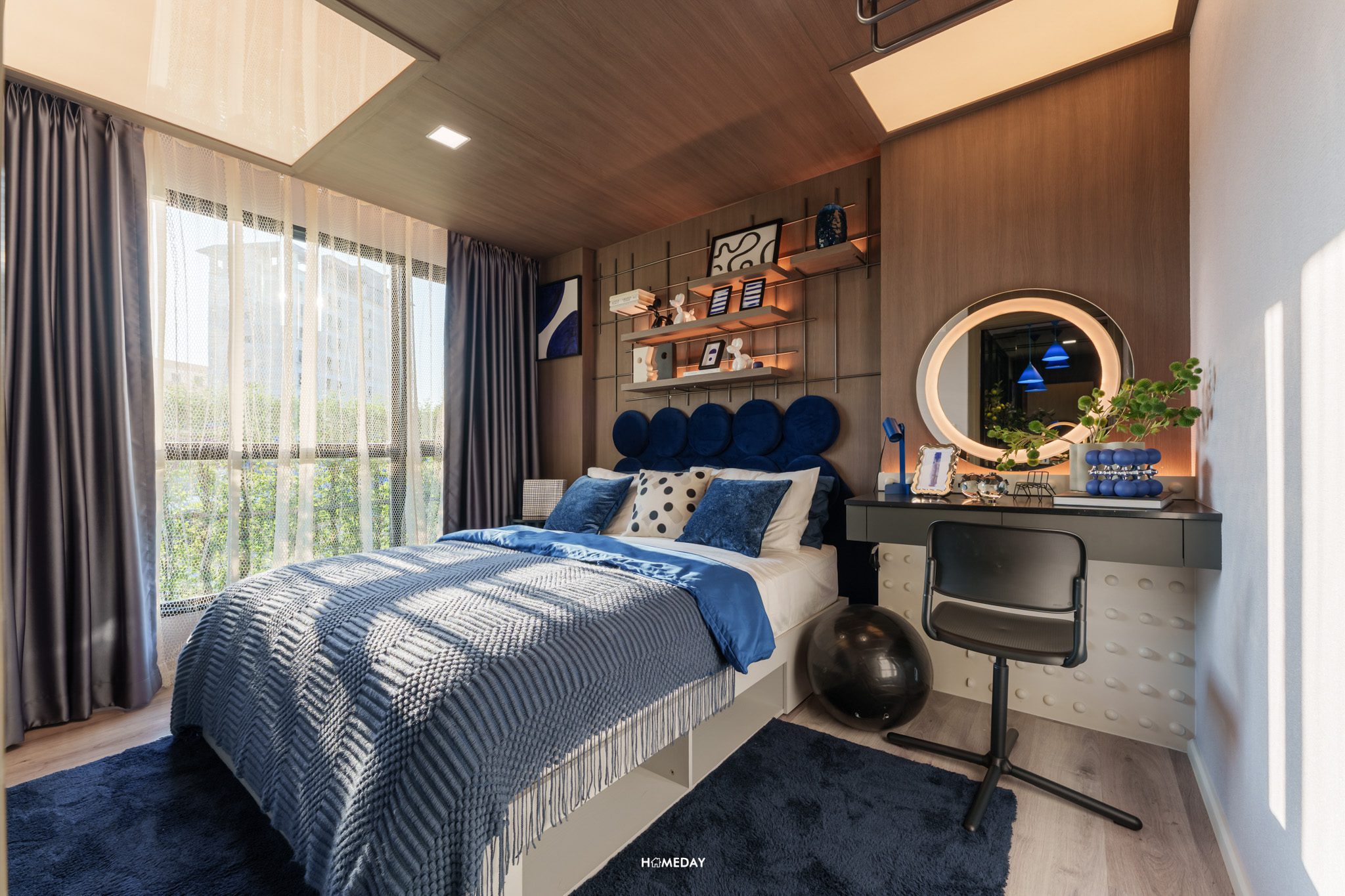 ภายในห้องนอน จะได้ ฐานเตียงขนาด 5 ฟุต และ ตู้เสื้อผ้า Built-in มาให้เป็นมาตรฐานของโครงการ ข้างเตียงทั้งสองฝั่งยังเหลือพื้นที่พอสำหรับวาง โต๊ะหัวเตียง หรือจะจัดเป็น มุมโต๊ะเครื่องแป้ง ก็ทำได้ไม่อึดอัด