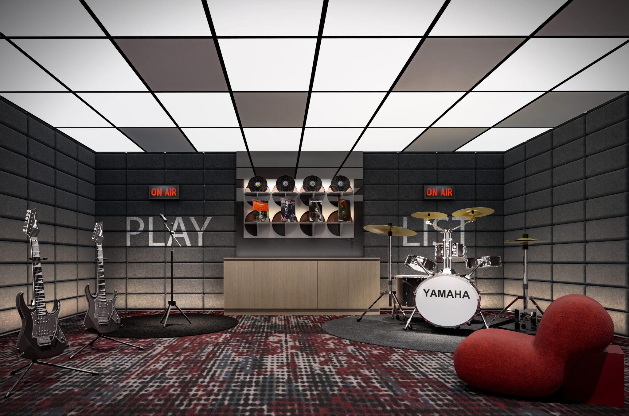 ภาพจำลองบรรยากาศของ The Beat Lab ห้องซ้อมดนตรีที่ครบเครื่อง จะเล่นคนเดียว หรือจะซ้อมทั้งวงก็ได้เต็มที่ แถมมุมในห้องยังเหมาะกับการตั้งกล้อง Live หรือถ่ายคลิปโชว์ฝีมืออีกด้วย สตูดิโอสวย สว่าง โปร ไม่แพ้ใครแน่นอนครับ ใครมีวงอยู่แล้วคือสะดวกมาก เพราะอยู่ใกล้โรงเรียนแบบเดินมาได้เลย