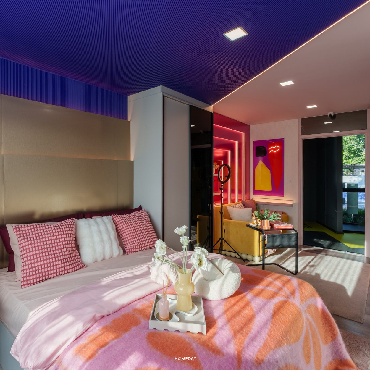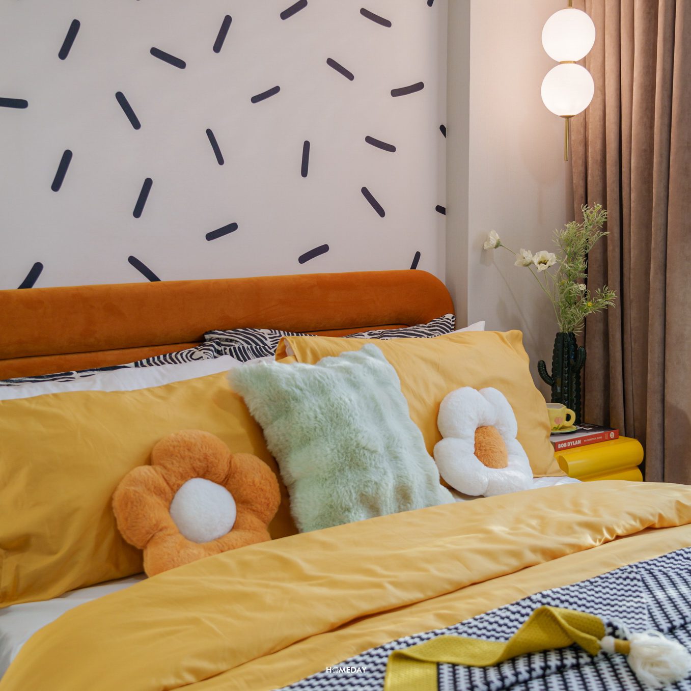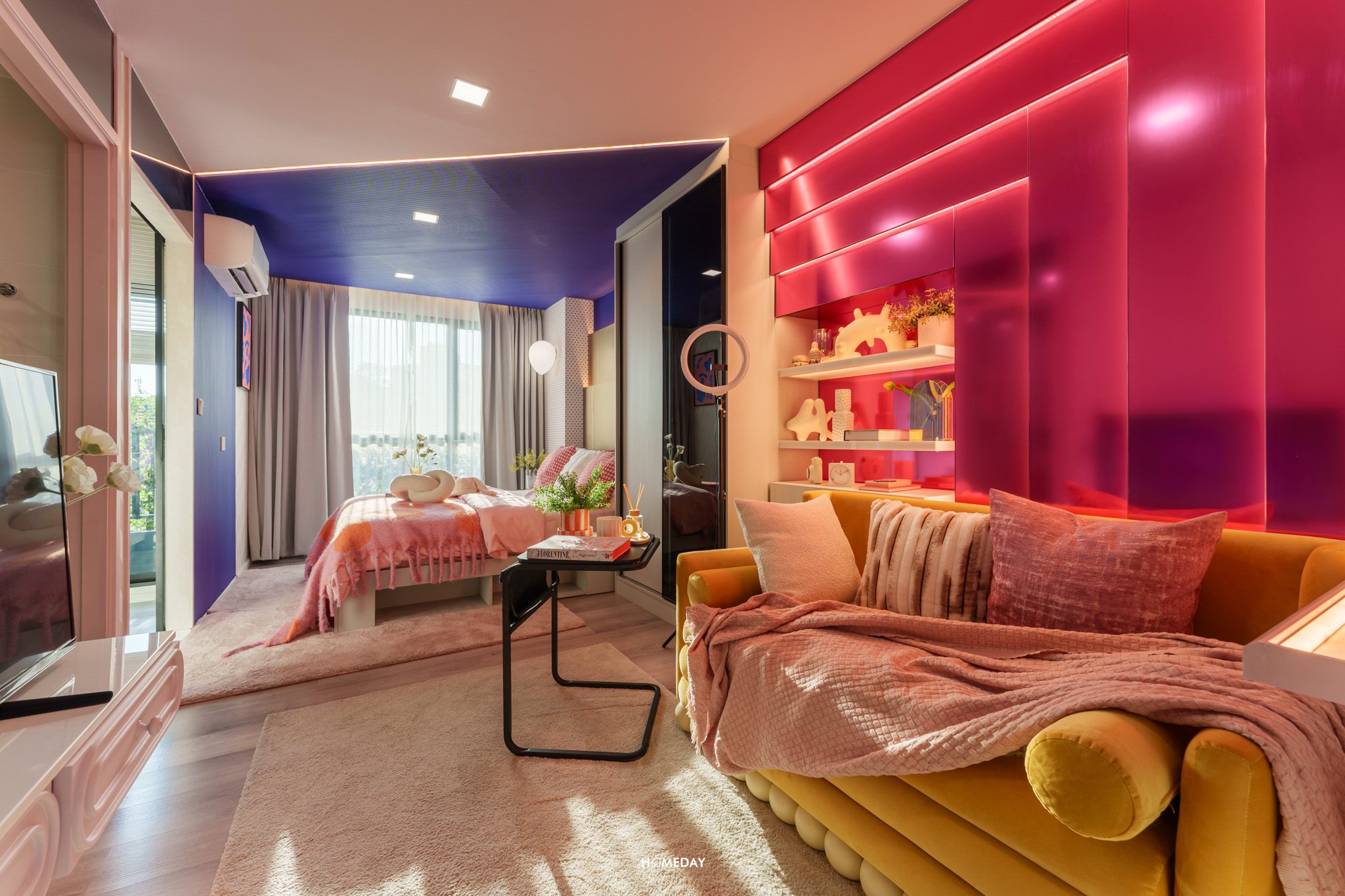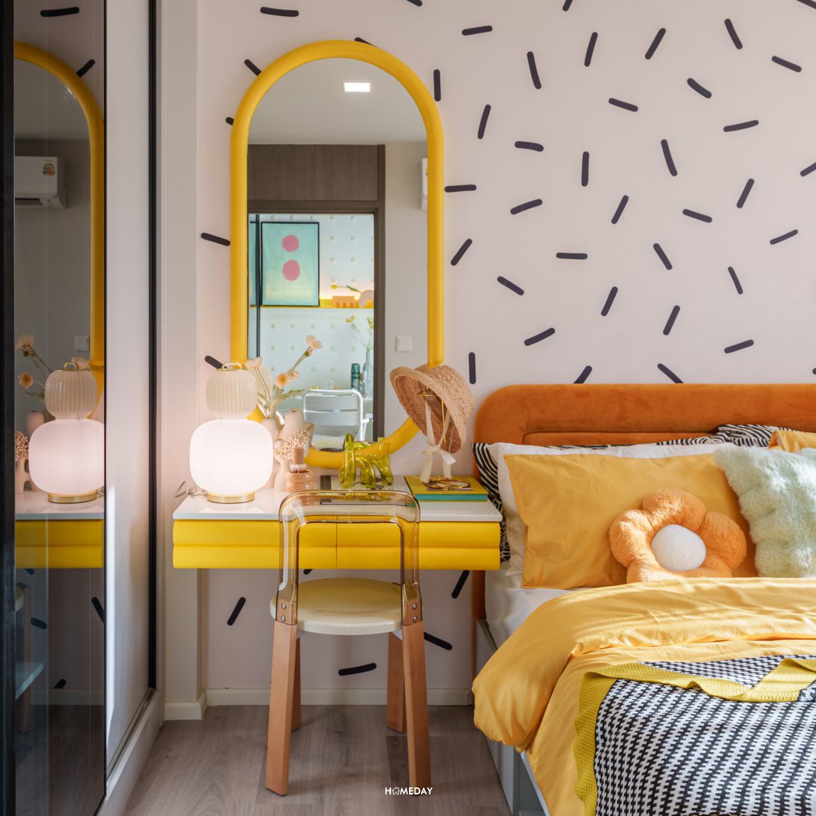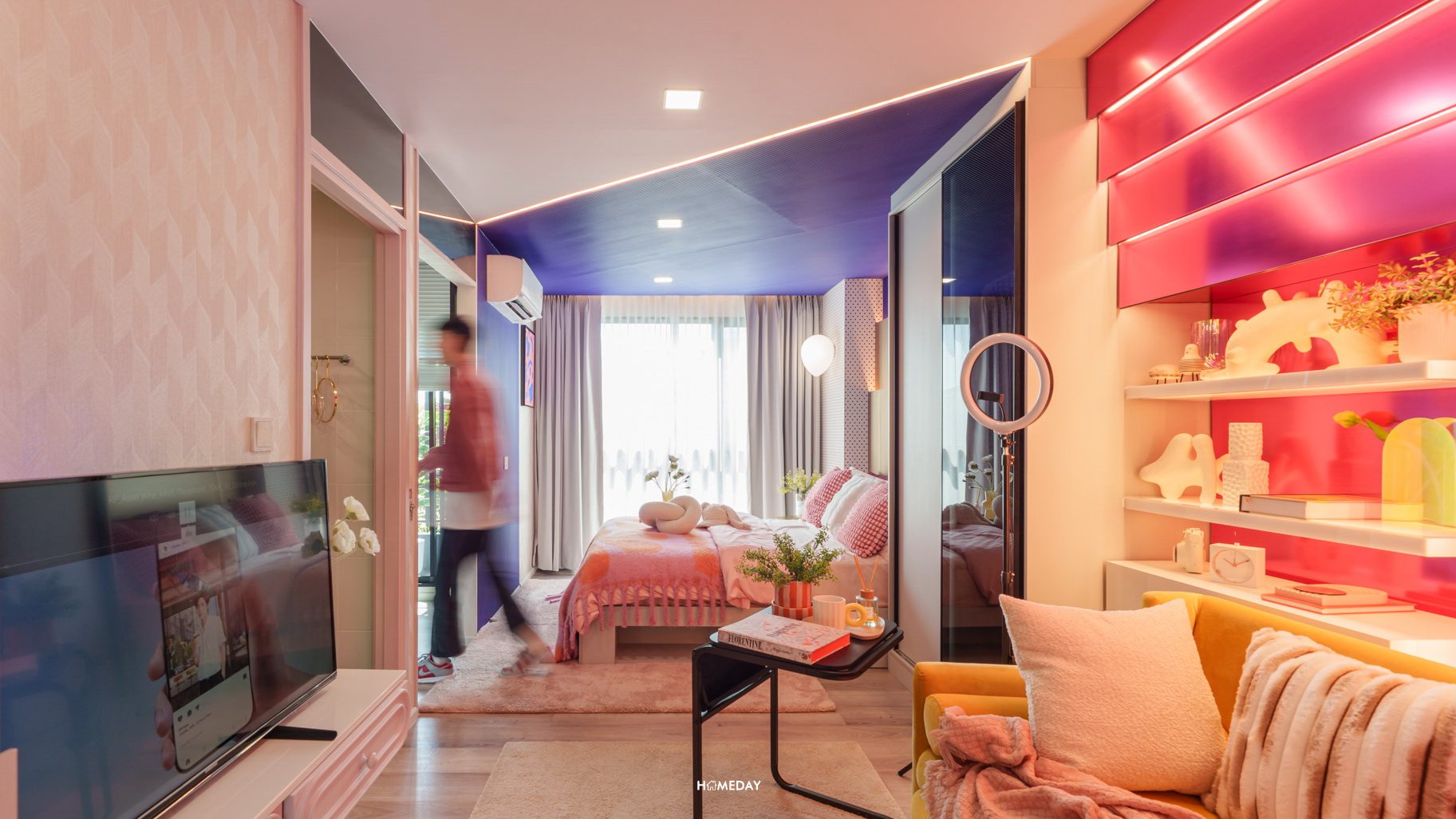 ในโซนห้องนอน สามารถวางเตียงขนาด 5-6 ฟุตได้สบาย ๆ ยังเหลือพื้นที่รอบเตียงให้เดินได้สะดวก ส่วน หัวเตียงฝั่งหนึ่งก็สามารถวางโต๊ะหัวเตียง หรือของใช้ส่วนตัวเพิ่มเติมได้ ส่วนผนังฝั่งปลายเตียง ก็เหมาะกับการติดตั้งทีวีแบบแขวนผนัง เพื่อประหยัดพื้นที่ได้ด้วย