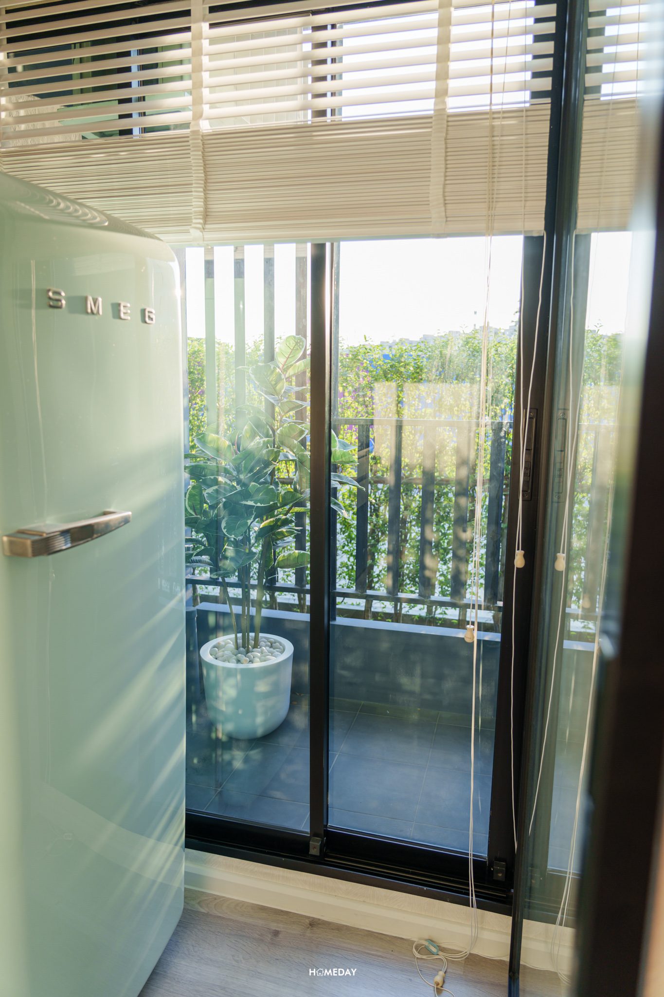 ด้านในสุดของห้องจะเป็นระเบียง ซึ่งเชื่อมต่อกับครัวโดยตรง ประตูเป็นบานเลื่อนแบบ 3 ตอน เปิดได้กว้าง ช่วยระบายกลิ่นและควันจากการทำอาหารได้ดี พื้นที่ระเบียงรองรับการวางเครื่องซักผ้าได้พอดี ส่วนราวตากผ้า แนะนำให้ใช้แบบแขวนผนังเพื่อไม่ให้เกะกะพื้นที่ หรือหากใช้เครื่องอบผ้าก็จะยิ่งสะดวกยิ่งขึ้น และ Condensing Unit ถูกแขวนไว้ด้านบนเรียบร้อย ช่วยให้ระเบียงดูเป็นระเบียบ และใช้งานพื้นที่ส่วนล่างได้อย่างเต็มที่