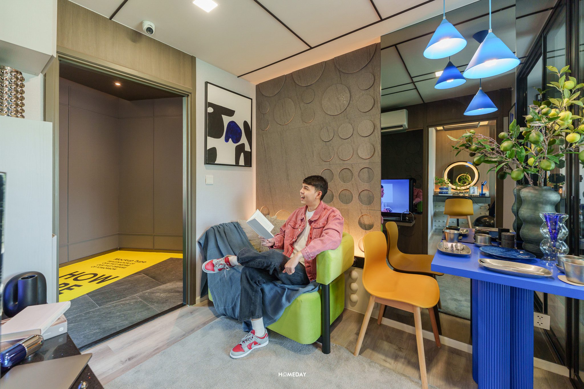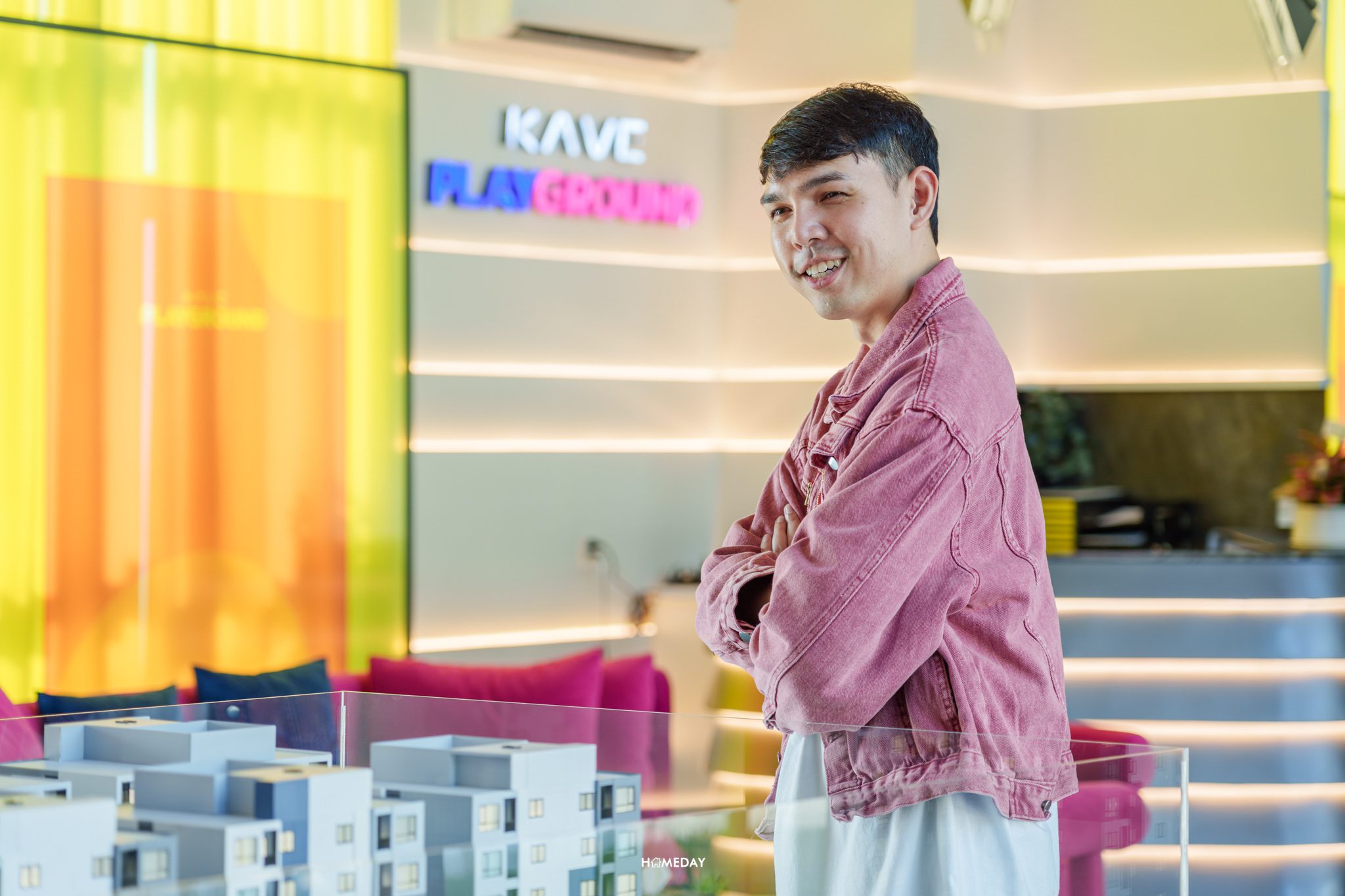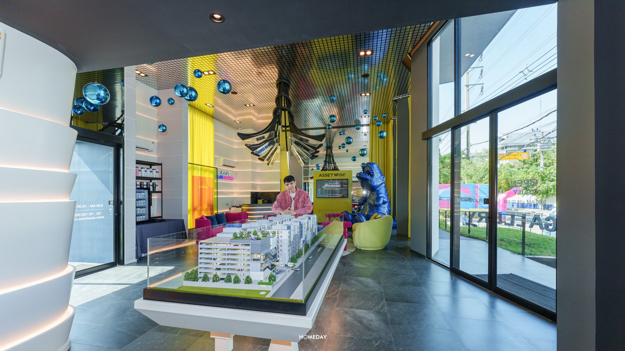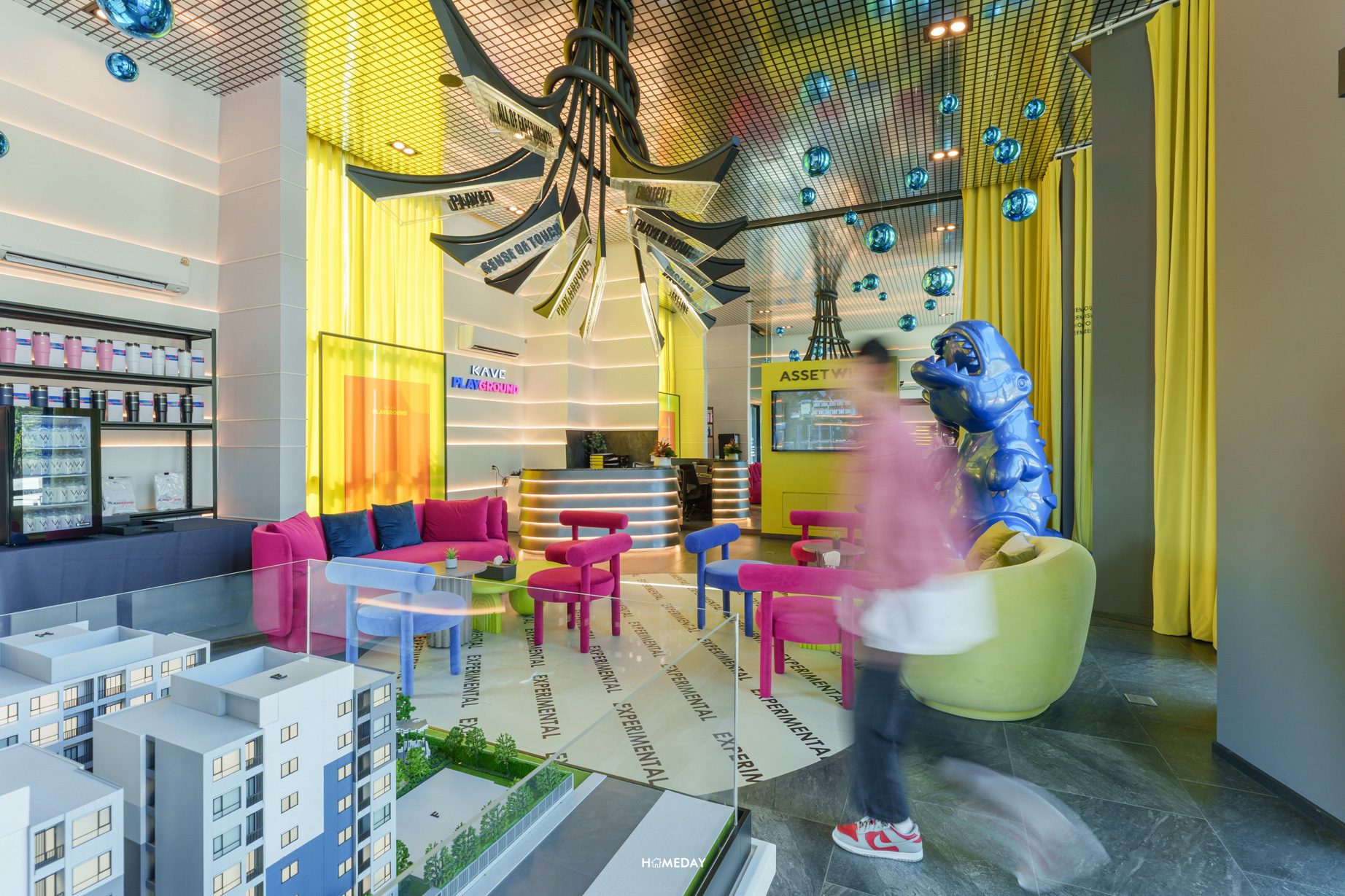 ก้าวแรกที่เข้ามาในสำนักงานขาย บรรยากาศที่รับรู้ได้ทันทีไม่ใช่ความอบอุ่นแบบบ้าน แต่มันคือ ความสนุกแบบเต็มสปีด ที่สดใส สมชื่อ Playground ทุกดีเทลตั้งแต่โทนสี การจัดแสง ไปจนถึงการเลือกใช้เฟอร์นิเจอร์ ล้วนสะท้อนความตั้งใจของโครงการที่อยากสร้างพื้นที่ให้คนรุ่นใหม่ “รู้สึกสนุกกับการอยู่อาศัย” โซนต้อนรับตกแต่งในธีมเดียวกับ The Beast’s Library พื้นที่อ่านหนังสือในโครงการจริง ที่มี มาสคอตก๊อตซิล่าสีน้ำเงิน ยืนโดดเด่นอยู่กลางห้อง เติมบรรยากาศความขี้เล่นในแบบที่หาไม่ได้จากคอนโดทั่วไป และนี่คือเสน่ห์ที่ Kave Playground ที่อยากจะสื่อความเป็นคอนโดสำหรับคนรุ่นใหม่ ที่ไม่ได้แค่ “น่าอยู่” แต่ยัง “น่าเล่น” ด้วย