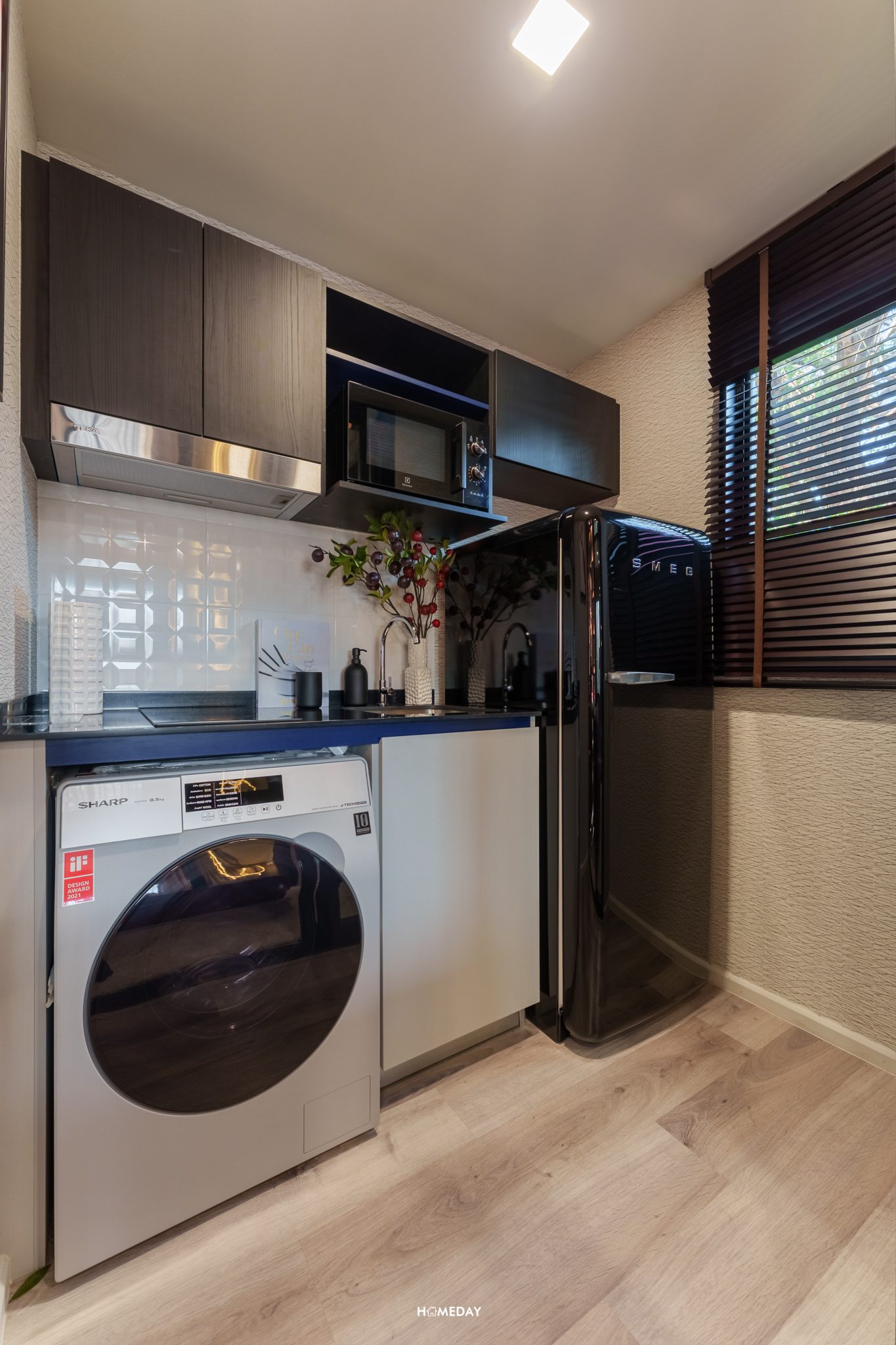 ในส่วนของครัว ทางโครงการจัดมาให้แบบ Fully Furnished เช่นเดียวกับห้องอื่น ๆ ภายในยูนิต โดยเคาน์เตอร์ครัวถูก Built-in มาให้เรียบร้อย พร้อมเว้นพื้นที่ด้านข้างไว้สำหรับวางตู้เย็นลงตัว ใต้เคาน์เตอร์มีตู้เก็บของ และลิ้นชักเก็บช้อนส้อมใช้งานได้จริง พร้อมช่องวางไมโครเวฟที่ช่วยประหยัดพื้นที่บนเคาน์เตอร์ได้ดี จุดที่น่าสนใจคือมีลิ้นชักพิเศษที่ออกแบบเป็นชั้นโล่ง สามารถดึงออกมาใช้เป็นพื้นที่เตรียมอาหารเสริม เพิ่มความยืดหยุ่นในการใช้งานได้มากขึ้น