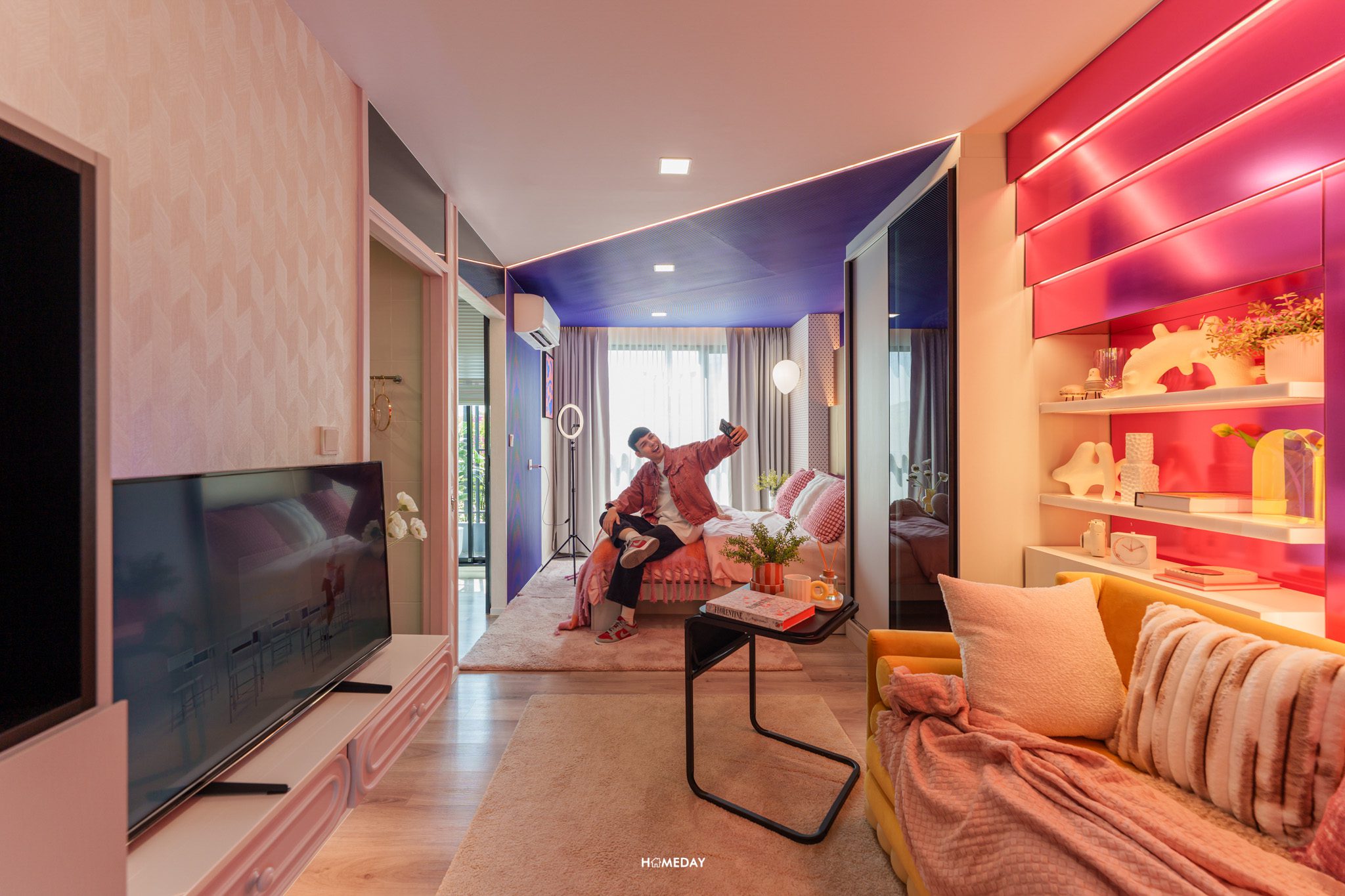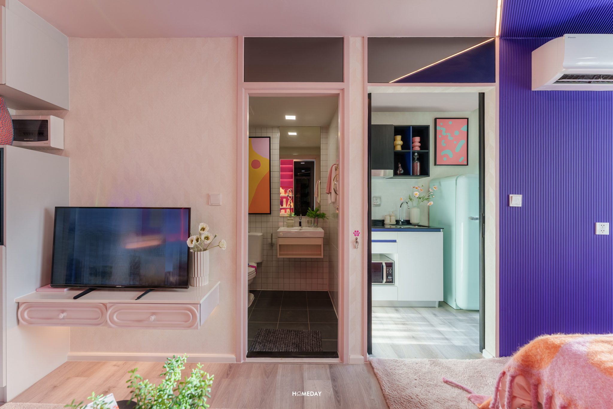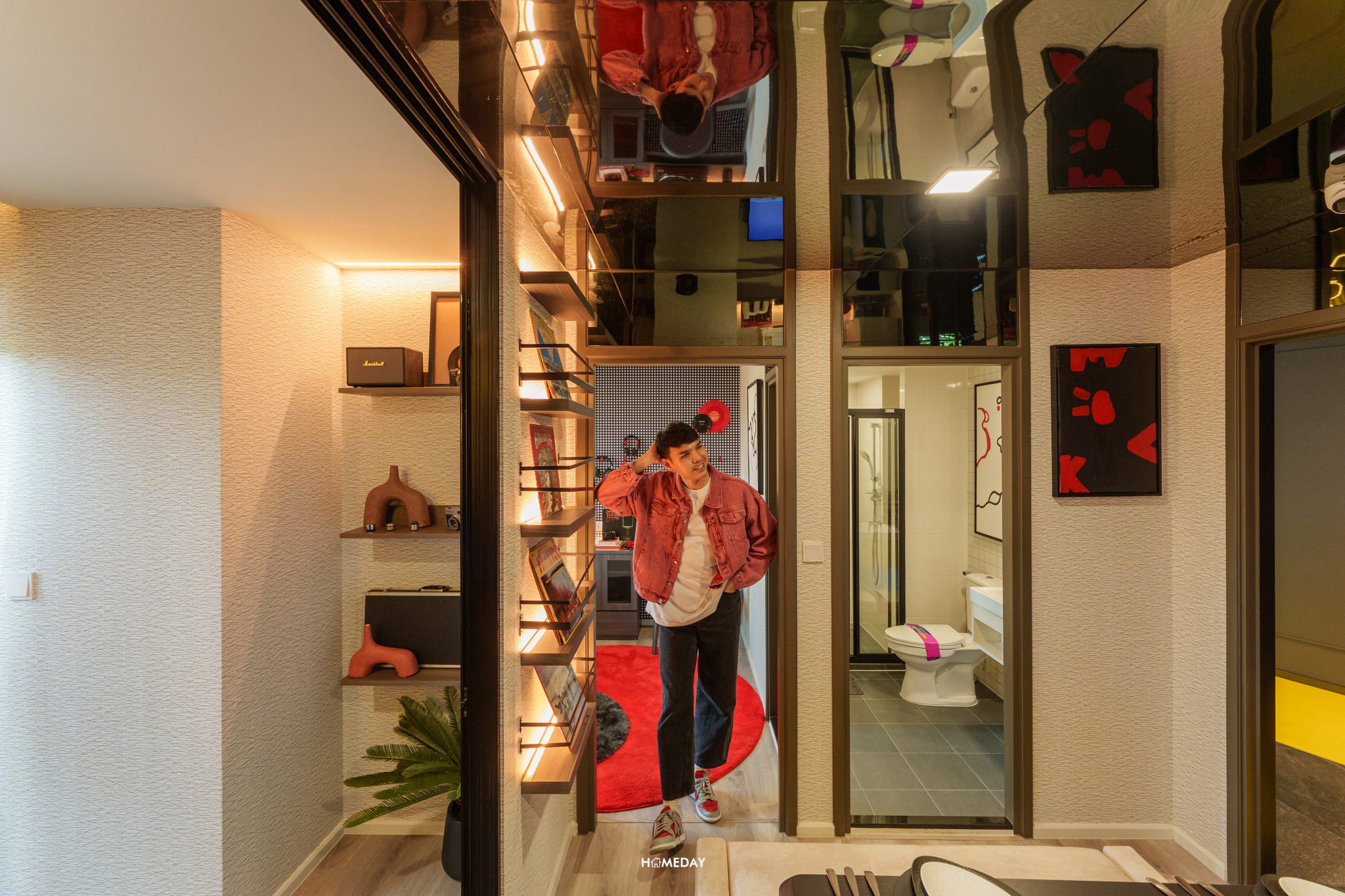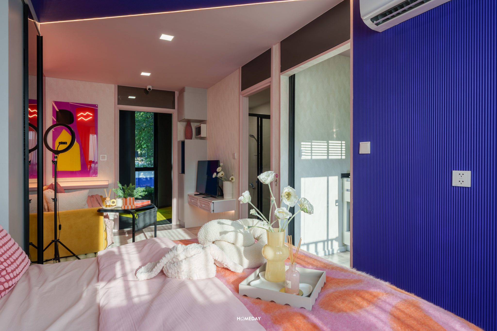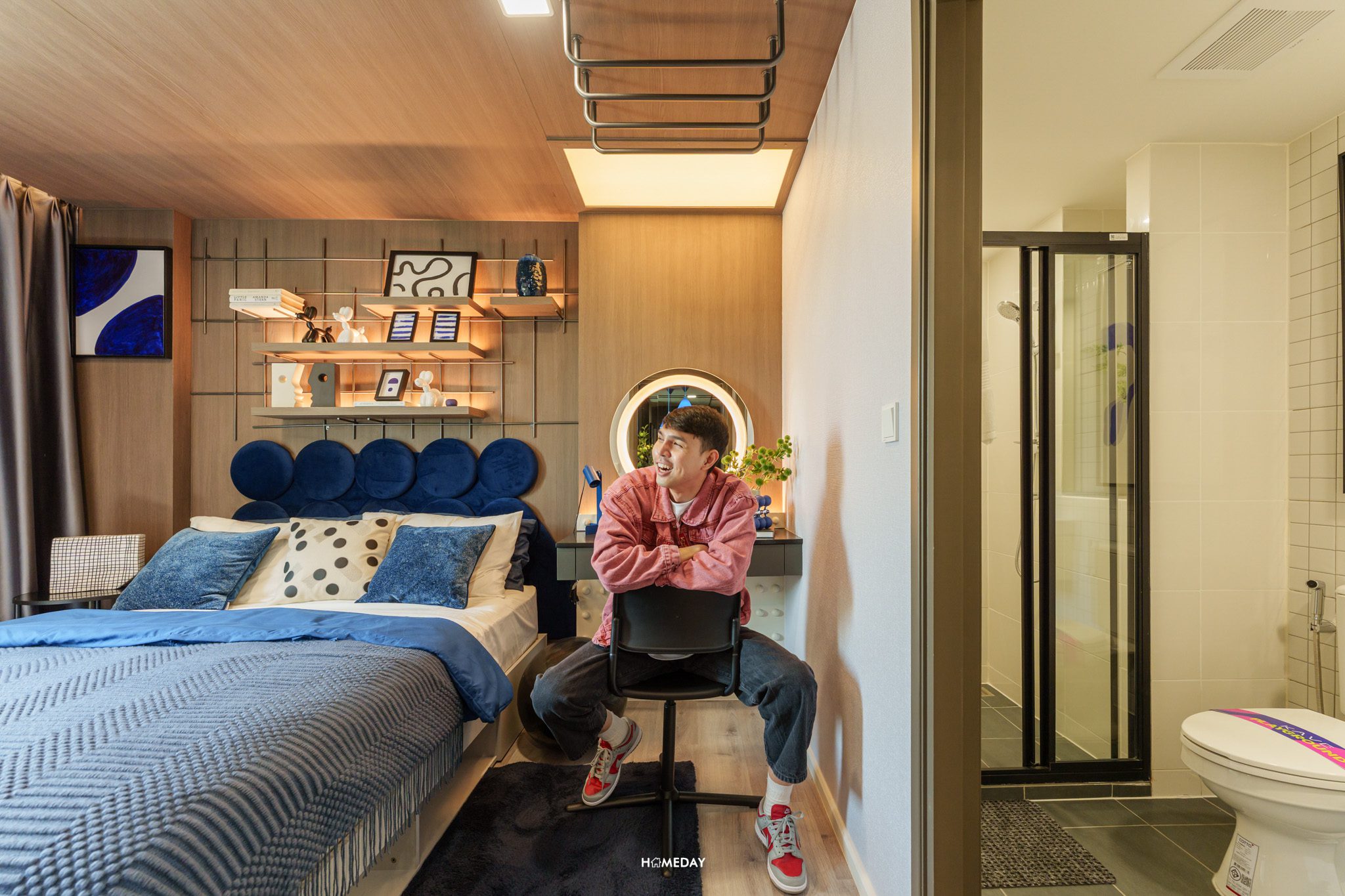 สำหรับห้อง Studio นี้ แม้จะเป็นห้องไทป์เล็กสุด แต่กลับจัดฟังก์ชันมาได้กว้างและยืดหยุ่นกว่าที่คิด เพราะไม่มีผนังกั้น ทำให้สามารถปรับพื้นที่ใช้สอยได้หลากหลายตามไลฟ์สไตล์ เช่น จะวางที่นอนเสริมให้น้องหมาน้องแมว หรือตั้งมุมทำงานเล็ก ๆ ก็ลงตัว