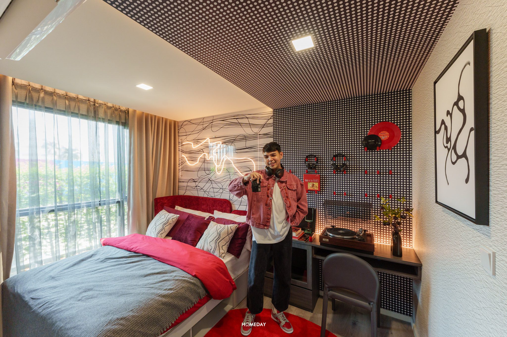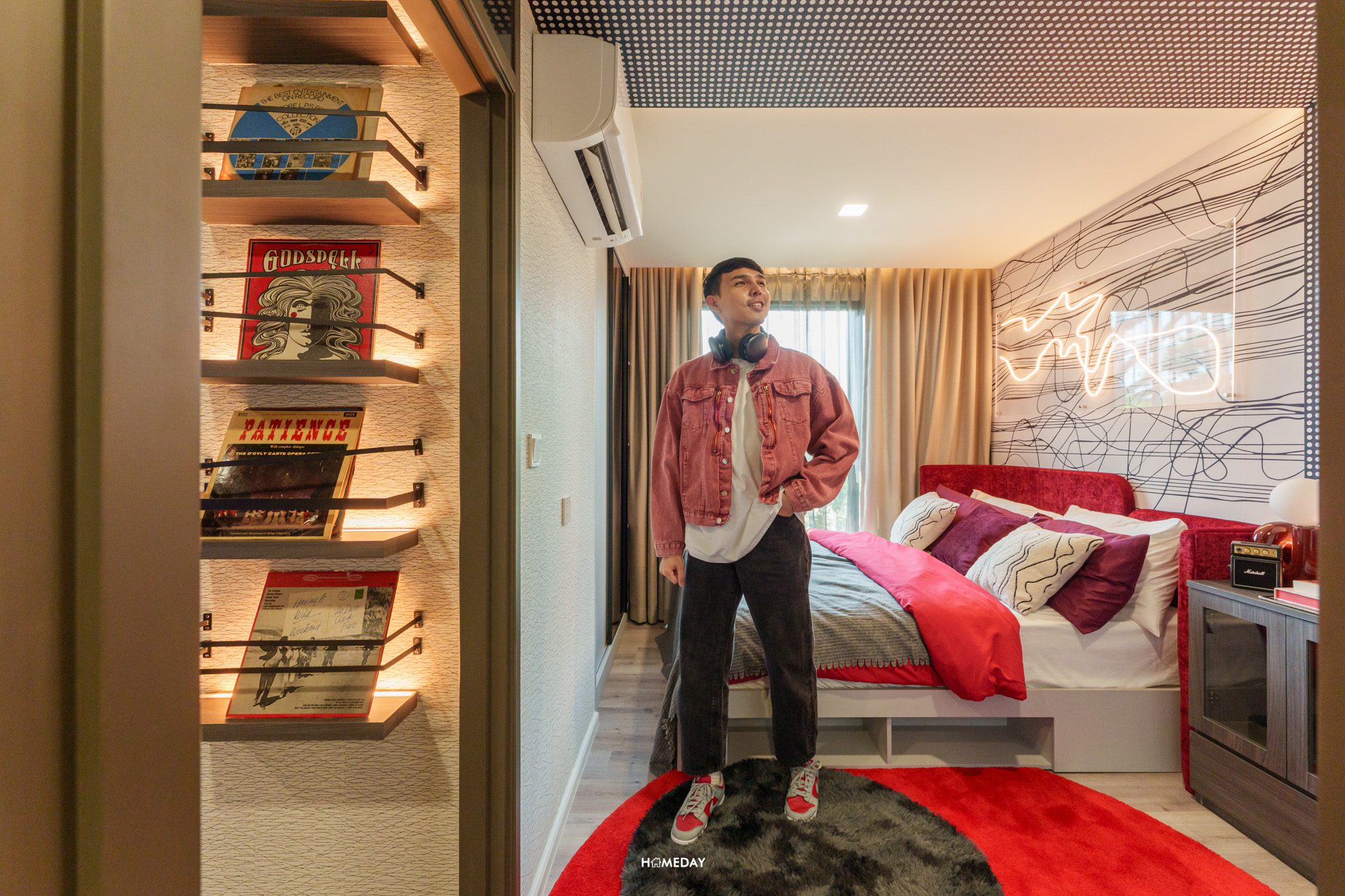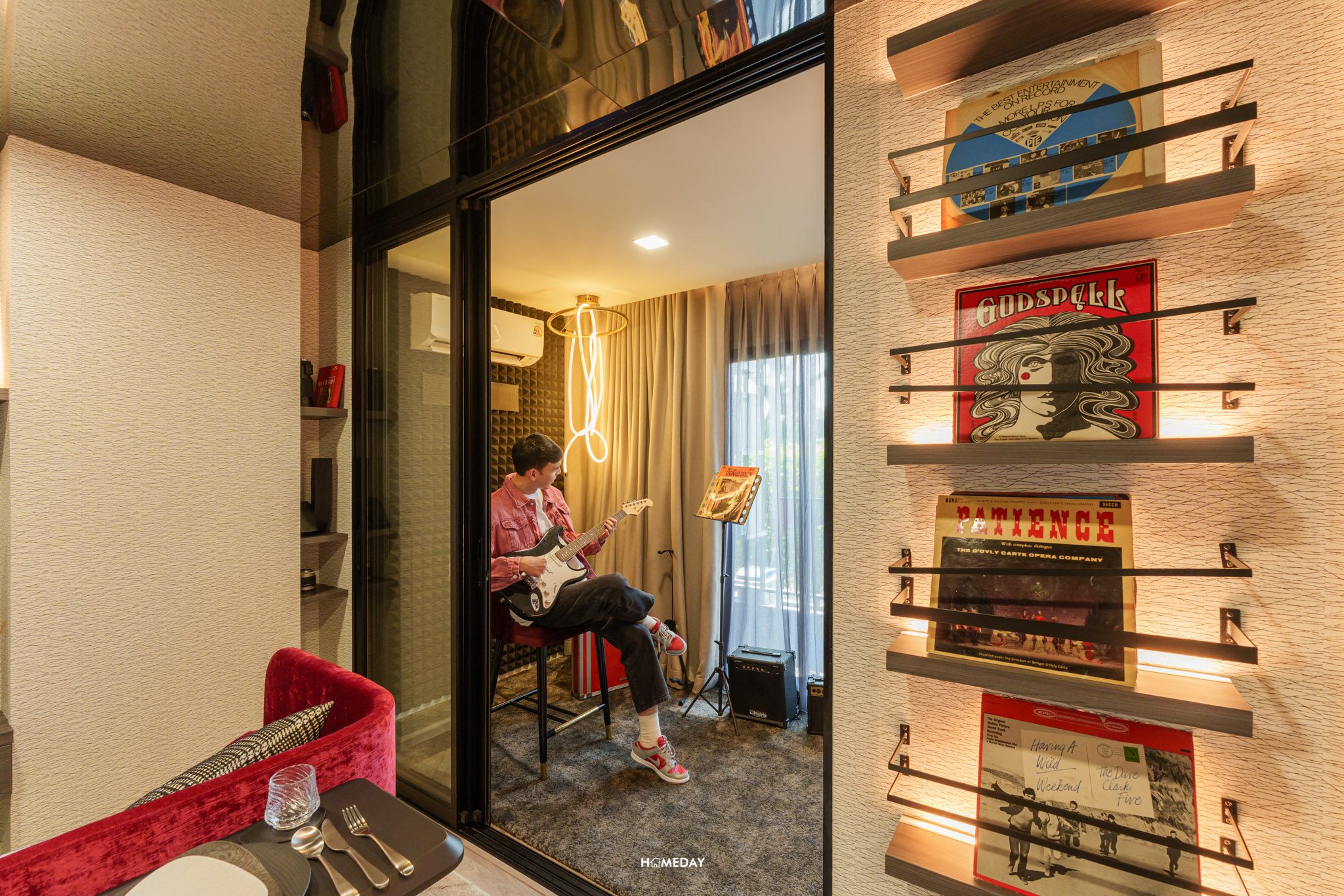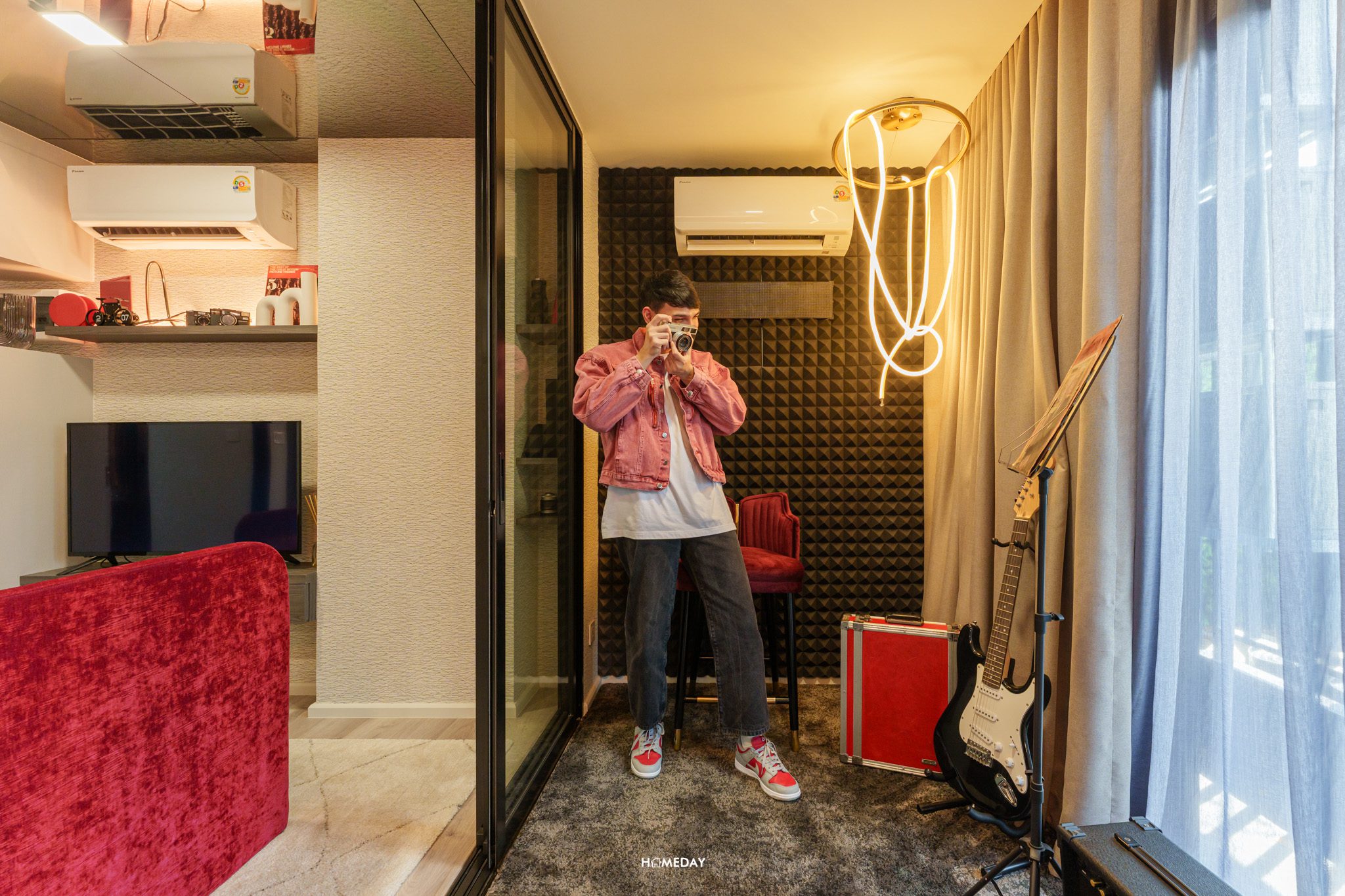 จากห้องครัว มาต่อกันที่ห้องอเนกประสงค์ ซึ่งในห้องตัวอย่างนี้ตกแต่งไว้เป็นมุมไลฟ์สดและซ้อมดนตรี ให้ฟีลสนุก ๆ แบบคนรุ่นใหม่ แต่ถ้าใครไม่ได้ใช้แบบนั้น ก็สามารถปรับเป็นห้องนอนเล็กได้เลยครับ วางเตียงขนาด 3 ฟุตลงไปได้พอดี จะใช้เป็นห้องแต่งตัว หรือห้องเก็บของก็ดีไม่แพ้กัน