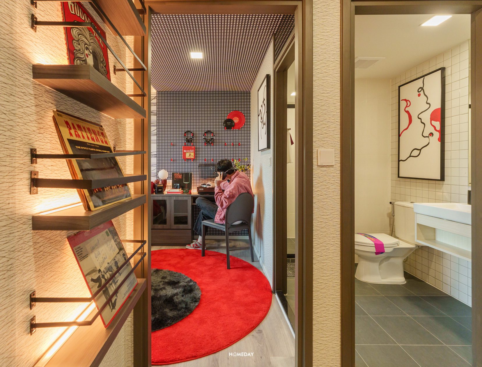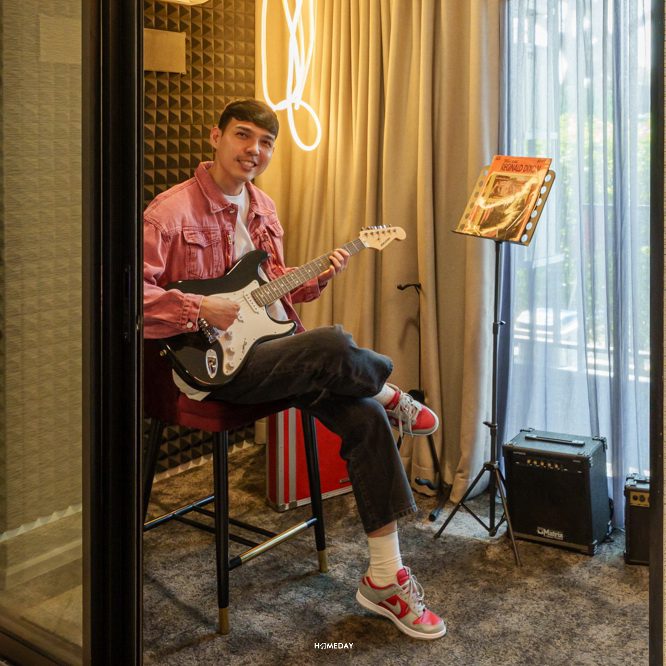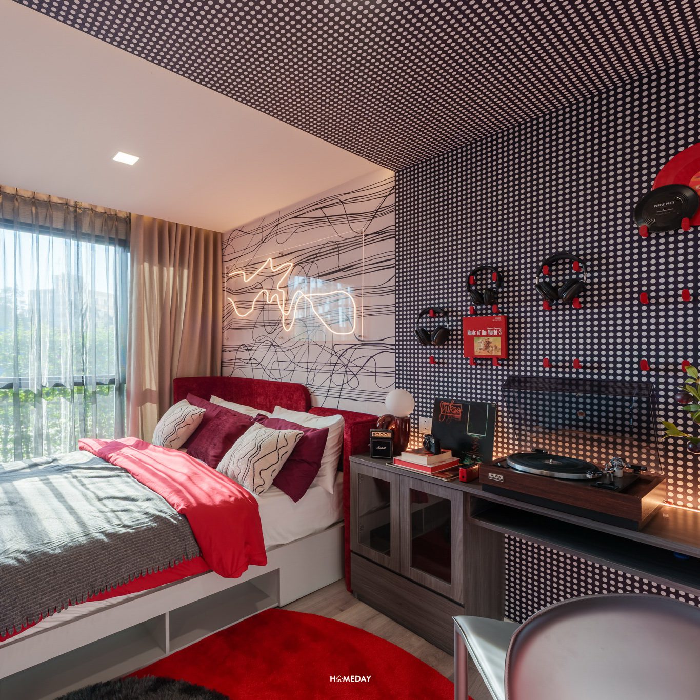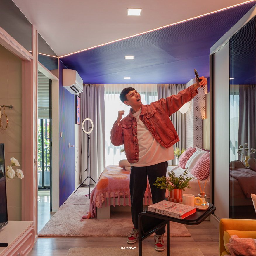 จากห้องครัว มาต่อกันที่ห้องอเนกประสงค์ ซึ่งในห้องตัวอย่างนี้ตกแต่งไว้เป็นมุมไลฟ์สดและซ้อมดนตรี ให้ฟีลสนุก ๆ แบบคนรุ่นใหม่ แต่ถ้าใครไม่ได้ใช้แบบนั้น ก็สามารถปรับเป็นห้องนอนเล็กได้เลยครับ วางเตียงขนาด 3 ฟุตลงไปได้พอดี จะใช้เป็นห้องแต่งตัว หรือห้องเก็บของก็ดีไม่แพ้กัน