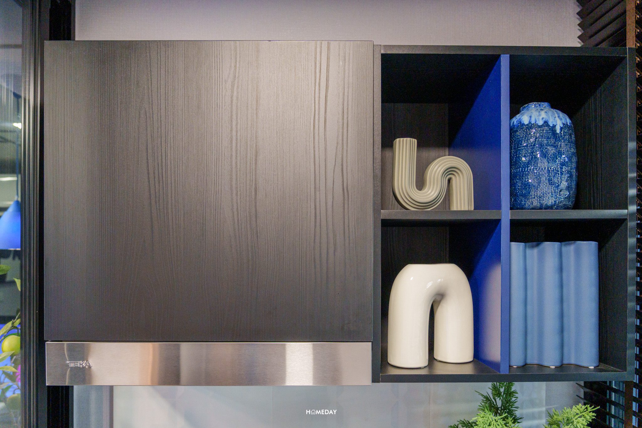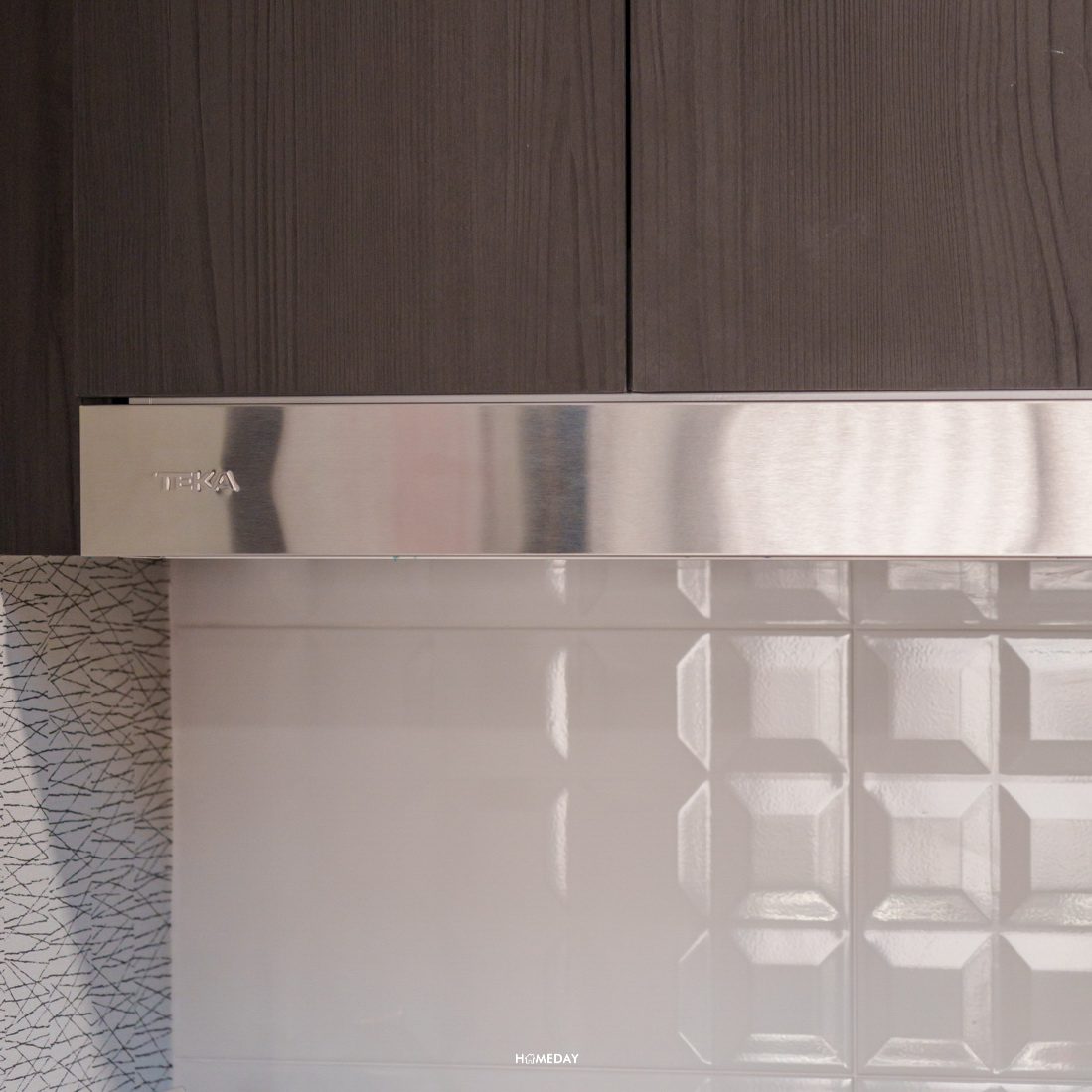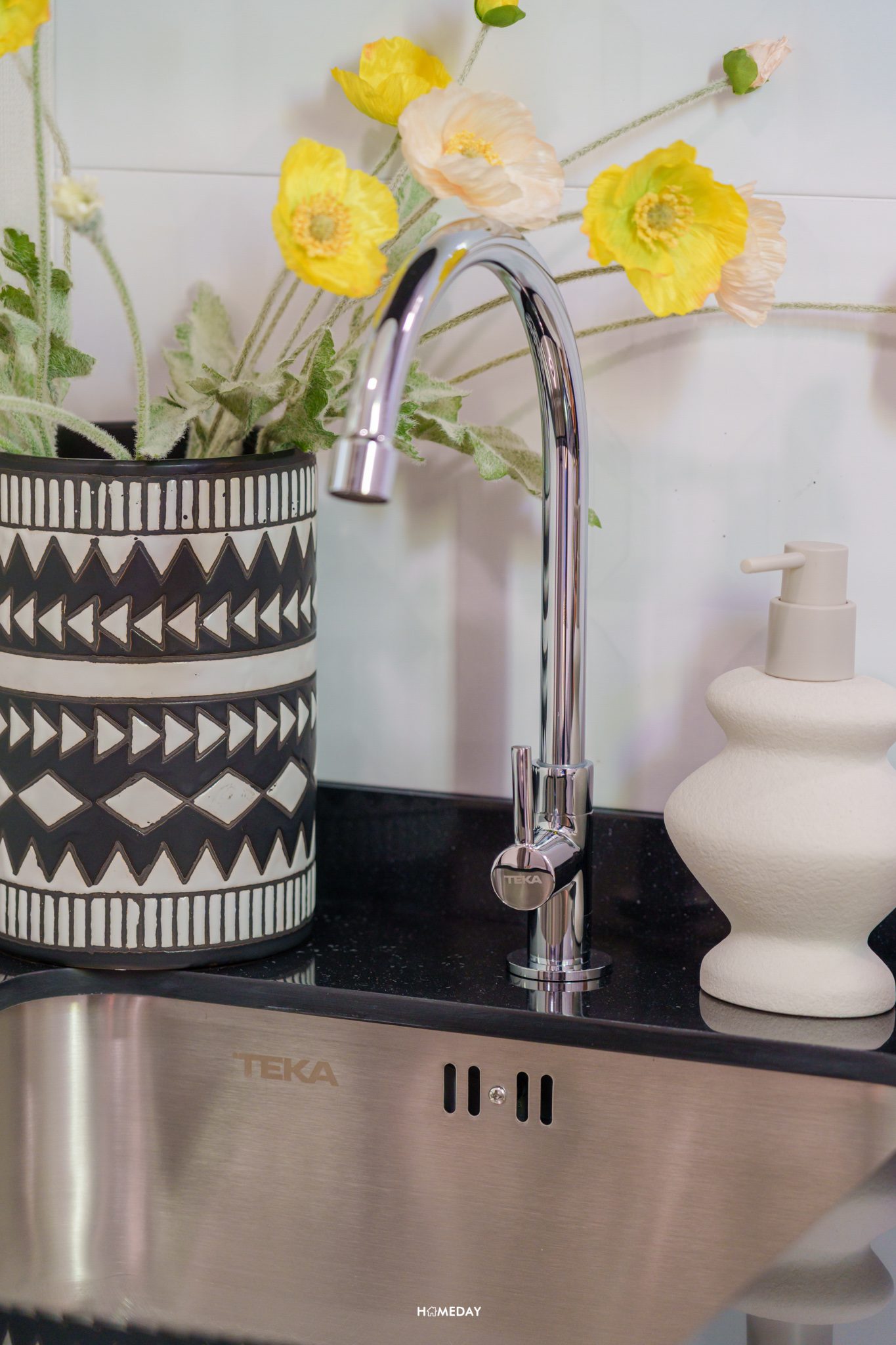 ส่วนบนของเคาน์เตอร์ให้มาครบทั้ง อ่างล้างจาน, เตาไฟฟ้า 2 หัว และเครื่องดูดควันแบรนด์ TEKA ซึ่งเป็นระบบหมุนเวียนในห้อง เหมาะกับเมนูเบา ๆ เช่นการอุ่นอาหาร หรือทำกับข้าวง่าย ๆ ที่ไม่มีกลิ่นแรงมาก ผนังหลังเคาน์เตอร์ติดตั้ง กระเบื้อง Backsplash มาให้ด้วย ทำให้เช็ดทำความสะอาดได้ง่าย และยังมี ตู้ลอยด้านบนแบบ Built-in สำหรับเก็บของเพิ่มเติม ช่วยให้ครัวดูเรียบร้อย และใช้งานได้จริงในชีวิตประจำวัน