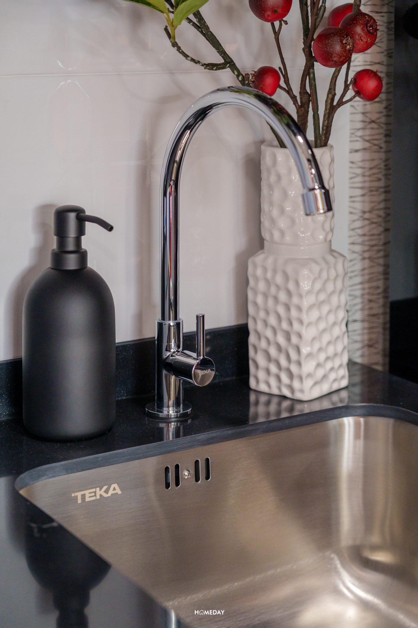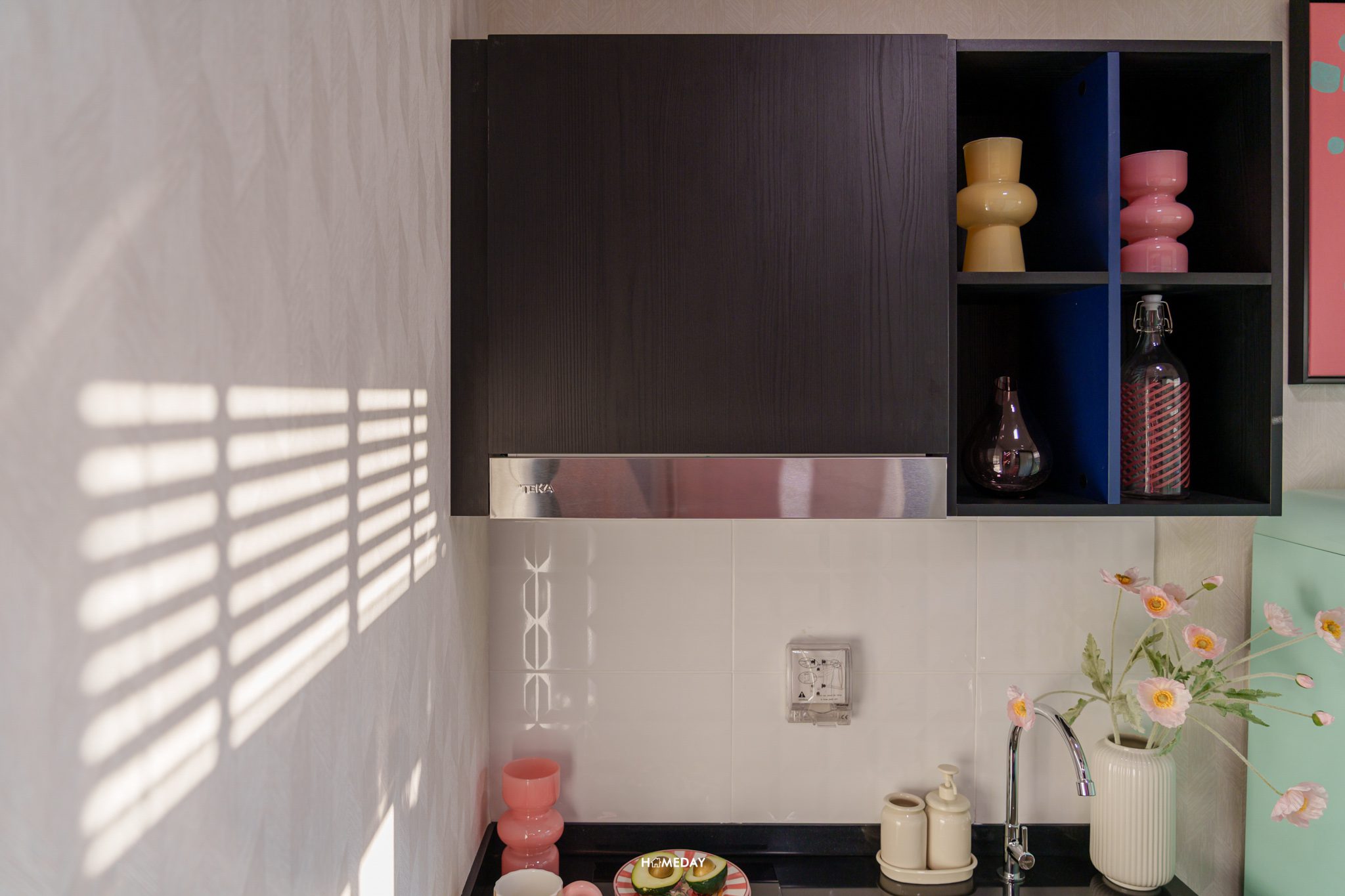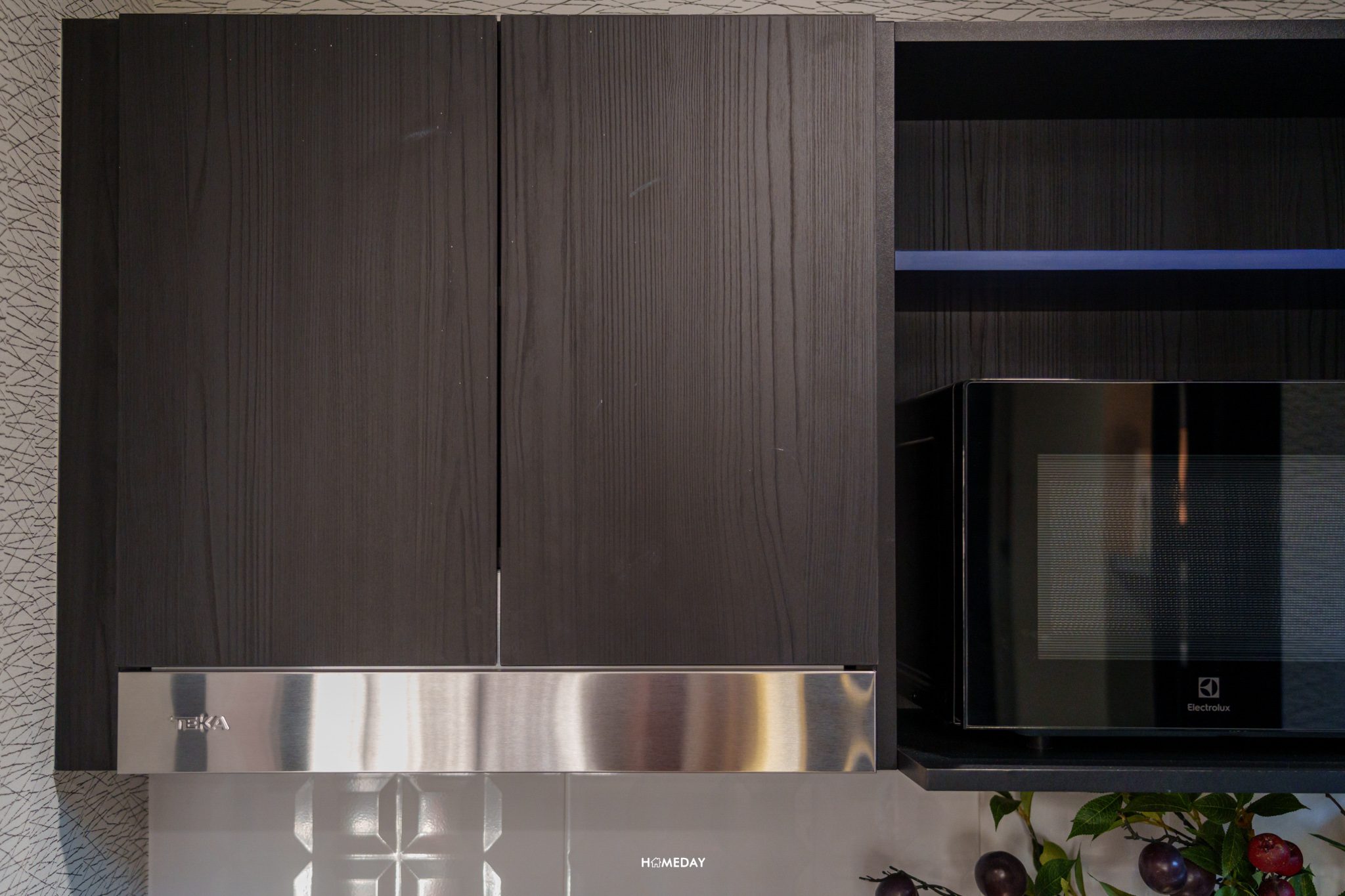 ส่วนบนของเคาน์เตอร์ให้มาครบทั้ง อ่างล้างจาน, เตาไฟฟ้า 2 หัว และเครื่องดูดควันแบรนด์ TEKA ซึ่งเป็นระบบหมุนเวียนในห้อง เหมาะกับเมนูเบา ๆ เช่นการอุ่นอาหาร หรือทำกับข้าวง่าย ๆ ที่ไม่มีกลิ่นแรงมาก ผนังหลังเคาน์เตอร์ติดตั้ง กระเบื้อง Backsplash มาให้ด้วย ทำให้เช็ดทำความสะอาดได้ง่าย และยังมี ตู้ลอยด้านบนแบบ Built-in สำหรับเก็บของเพิ่มเติม ช่วยให้ครัวดูเรียบร้อย และใช้งานได้จริงในชีวิตประจำวัน