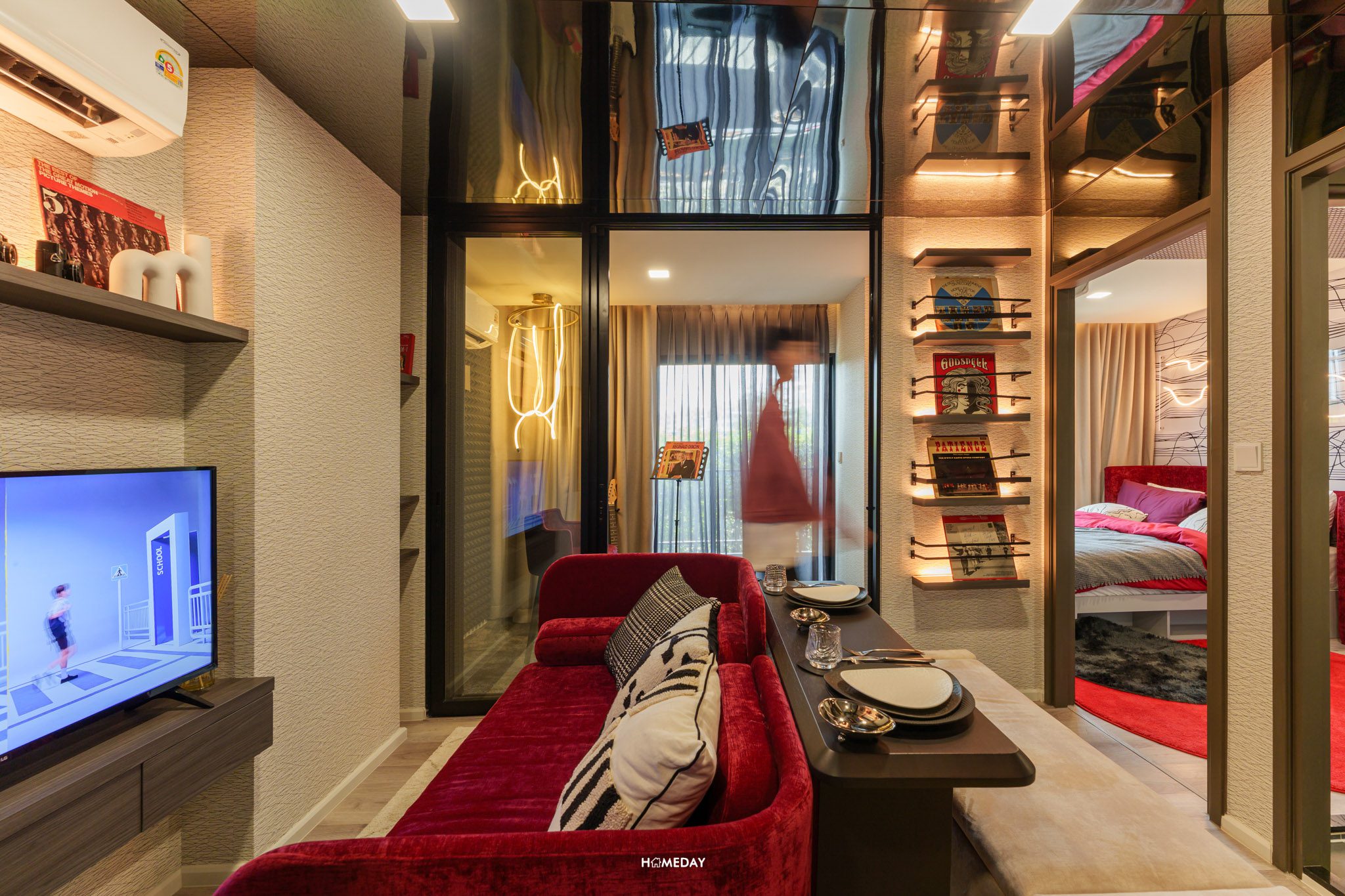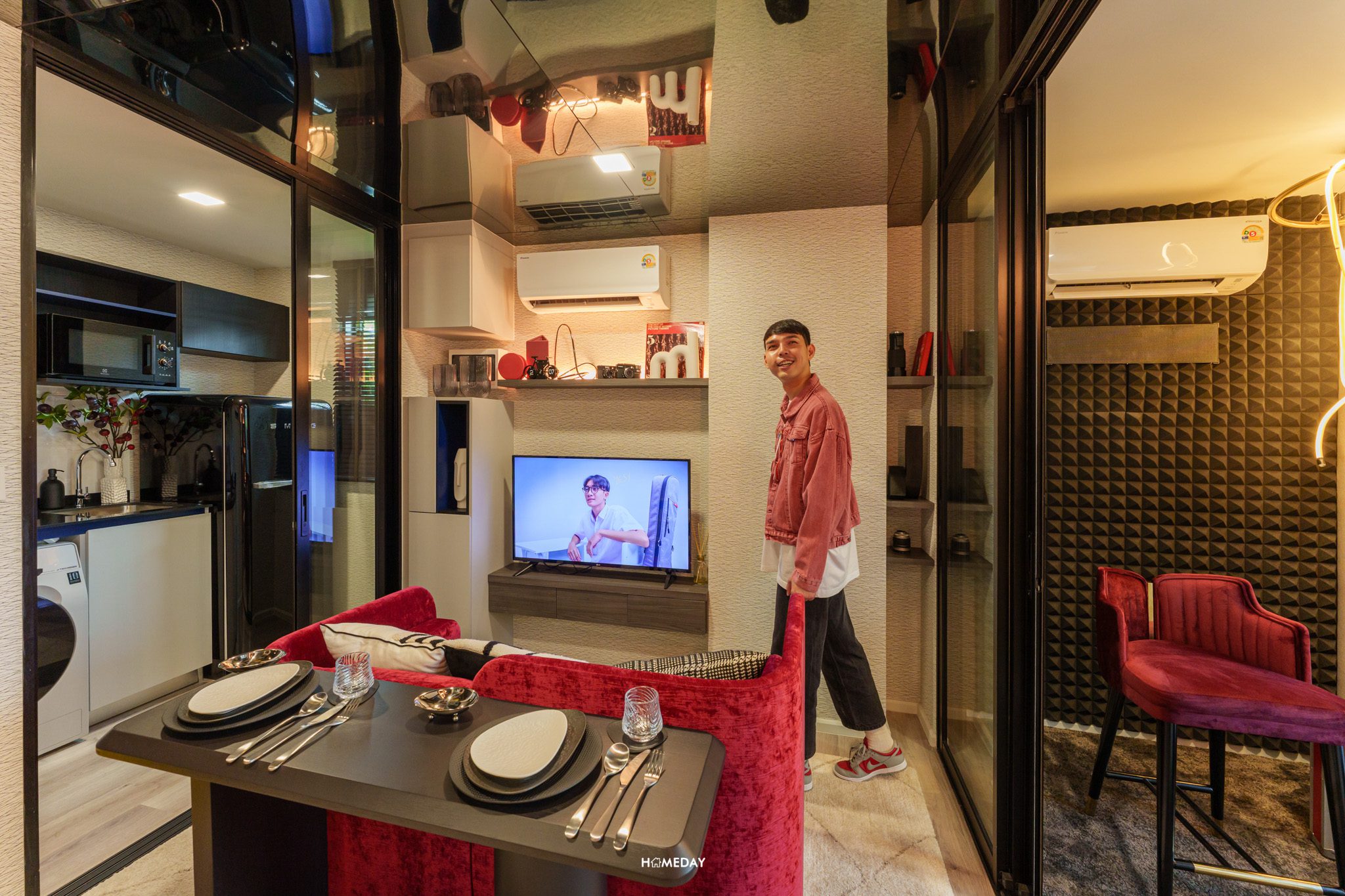เมื่อเปิดประตูเข้ามาในห้อง โซนแรกที่จะเจอก็คือ พื้นที่ห้องนั่งเล่น ซึ่งจัดวางมาได้พอดีสำหรับการใช้ชีวิตในทุกวัน ห้องตัวอย่างตกแต่งไว้ด้วยโซฟาขนาด 2 ที่นั่ง พร้อมพื้นที่ด้านข้างที่ยังเหลือพอสำหรับวางโต๊ะรับประทานอาหารเล็ก ๆ ต่อเนื่องจากโซฟาได้แบบไม่รู้สึกแคบ หรือแน่นจนเกินไป มีระยะห่างระหว่างโซฟากับจุดวางทีวีก็อยู่ในระดับที่พอดี ดูทีวีหรือซีรีส์ได้สบายตา โดยทางโครงการจะมีชั้นวางทีวี และตู้อเนกประสงค์ ให้ในแพ็ก Fully Furnished ด้วยนะครับ (แต่เฟอร์นิเจอร์ที่เห็นในห้องตัวอย่างอาจแตกต่างจากแบบมาตรฐานเล็กน้อย) ใครที่ใช้เวลาอยู่ในห้องนั่งเล่นเป็นหลัก ไม่ว่าจะทำงาน ดูซีรีส์ หรือเล่นเกม ห้องนี้จัดมาค่อนข้างลงตัวเลยครับ จากโซนนี้เราจะพาไปต่อที่ ห้องครัวฝั่งซ้ายมือ กันครับ