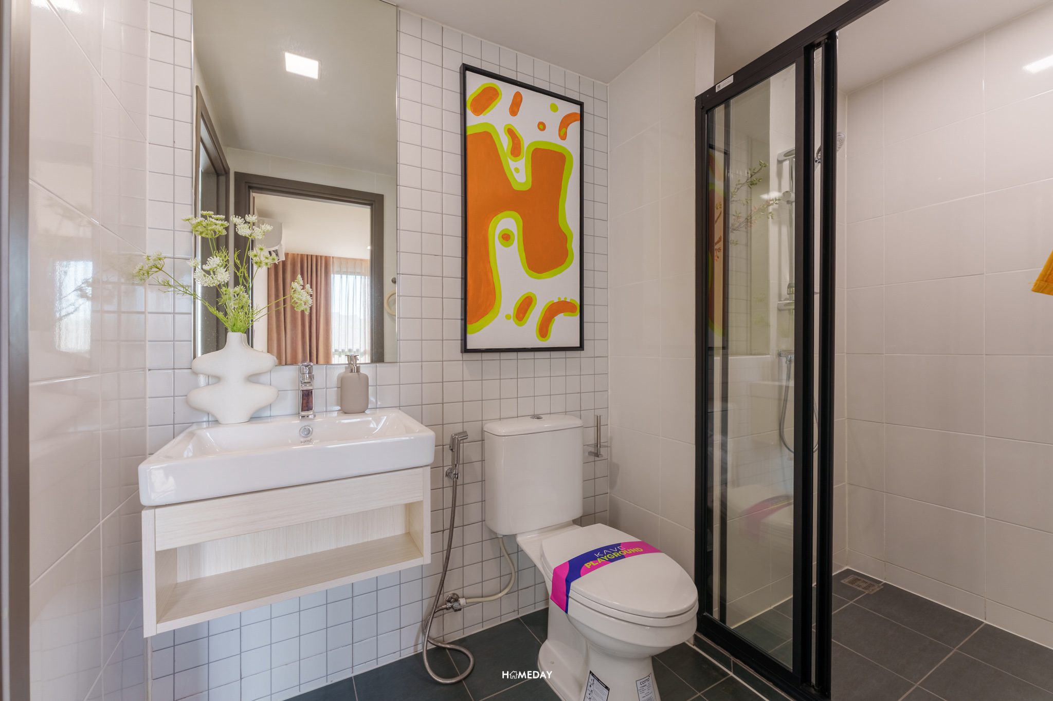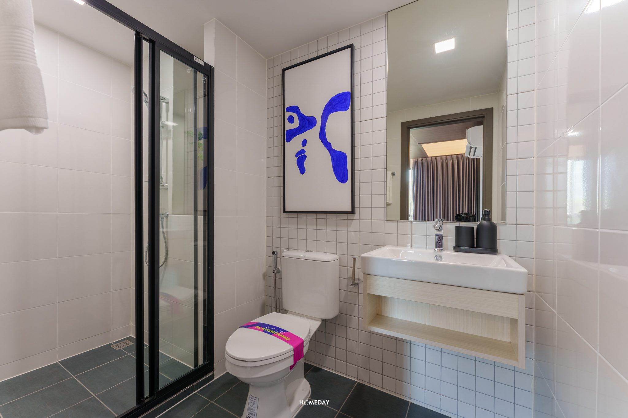 ห้องน้ำของห้องนี้สามารถเข้าได้ 2 ทาง ทั้งจากห้องครัวและห้องนอน ถือว่าออกแบบมาได้ดีมาก เพราะช่วยเพิ่มความสะดวกเวลาเพื่อนแวะมาหา โดยไม่ต้องเดินผ่านห้องนอนเข้าไปให้เสียความเป็นส่วนตัว ภายในห้องน้ำถูกแบ่งฟังก์ชันใช้งานไว้เป็นสัดส่วน ผนังและพื้นปูกระเบื้องทั้งหมด ทำความสะอาดง่ายและดูเรียบร้อย อ่างล้างหน้าและสุขภัณฑ์ใช้ของ COTTO หรือเทียบเท่า ขนาดพอดีใช้งานได้คล่องตัว โซนอาบน้ำมีฉากกั้นอาบน้ำแบบบานเลื่อน 3 ตอน ที่เปิดได้กว้าง เข้า-ออกสะดวก พร้อมฝักบัวติดตั้งมาให้ รวมถึงมีชั้นวางของแบบฝังในผนัง และเดินระบบไฟรองรับการติดตั้งเครื่องทำน้ำอุ่นมาให้เรียบร้อย เรียกว่าใช้งานได้ทันที ไม่ต้องปรับเพิ่มครับ