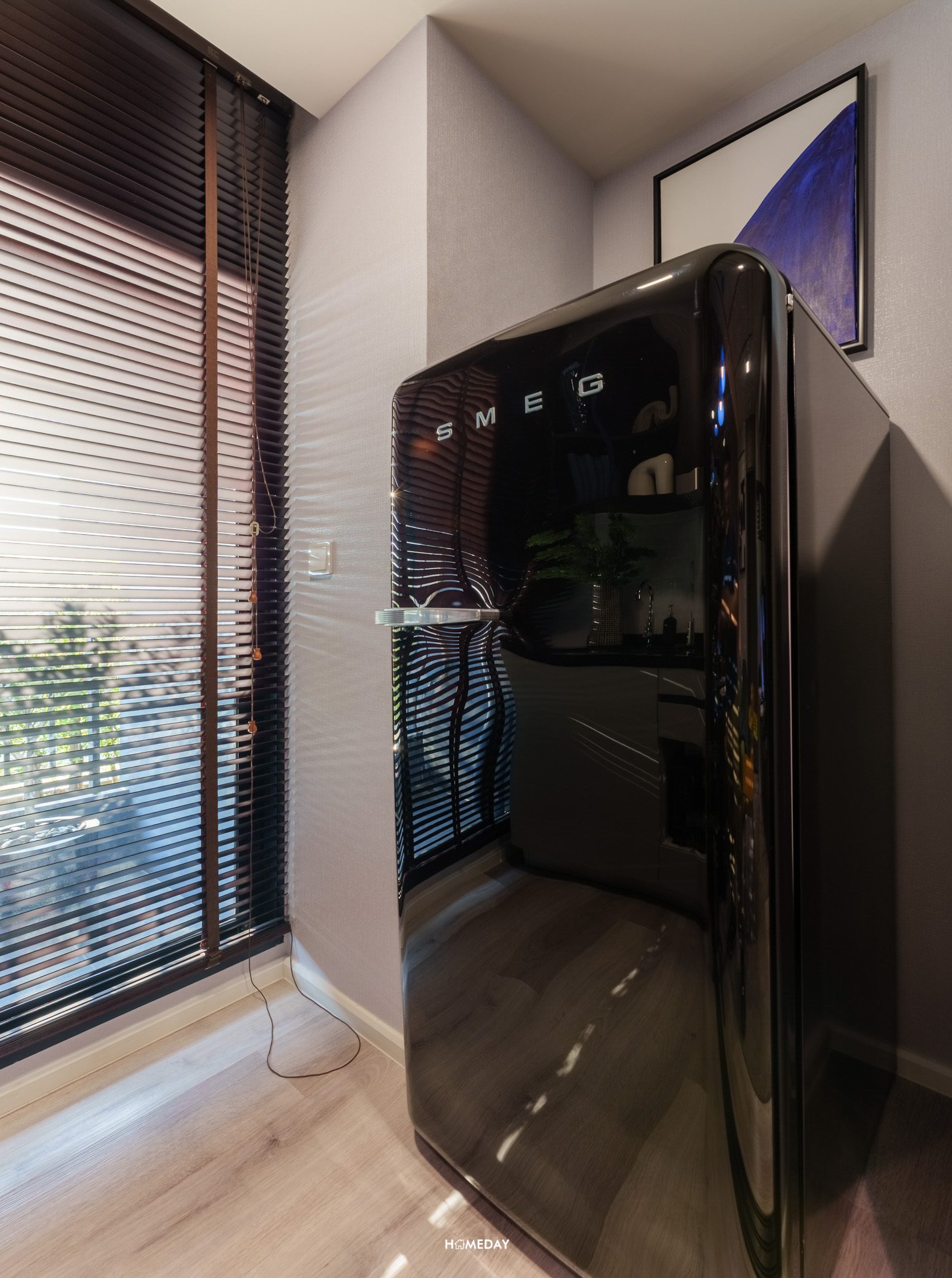 ภายในห้องครัวจะมี เคาน์เตอร์ Built-in มาให้แบบเดียวกับในห้องตัวอย่าง พร้อม ลิ้นชักแบบเลื่อนออกได้ ที่ช่วยเพิ่มพื้นที่ใช้งานเวลาเตรียมอาหาร หรือวางของเพิ่มเติมได้จริงจัง ฝั่งตรงข้ามเคาน์เตอร์ เว้นพื้นที่ไว้สำหรับวางตู้เย็น ซึ่งจัดตำแหน่งไว้เข้ามุมพอดี ทำให้ไม่เกะกะทางเดินใช้งานสะดวกครับ