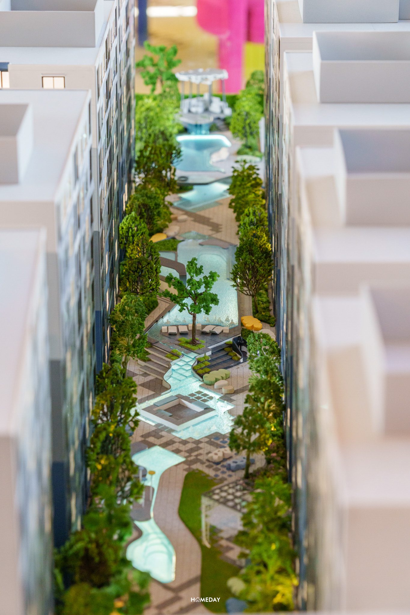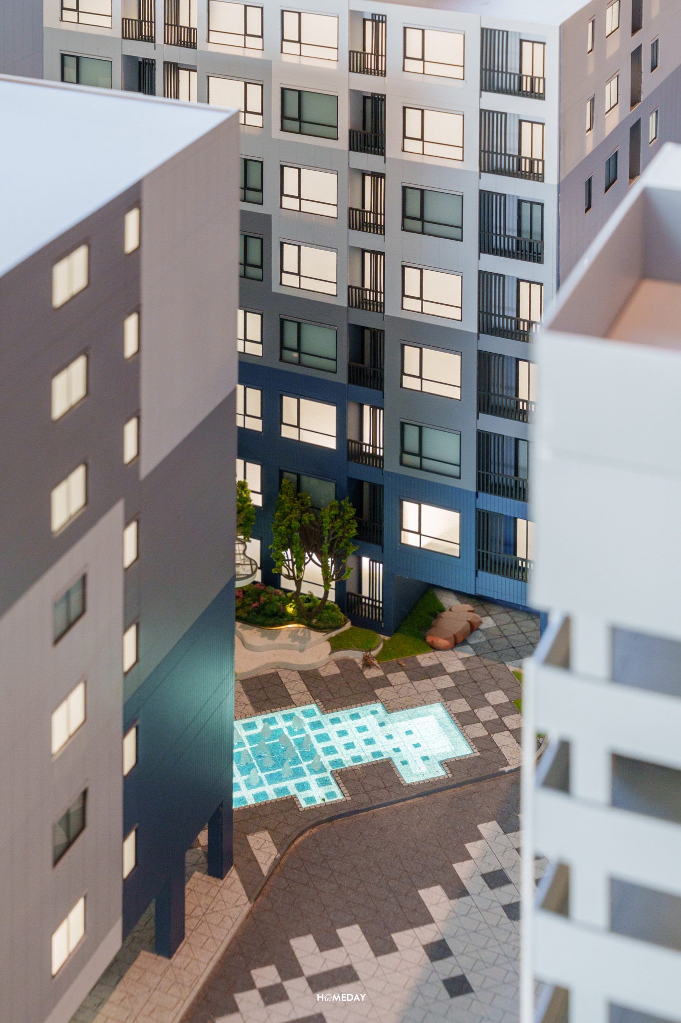 ส่วนอาคารพักอาศัยทั้ง 11 อาคาร จะถูกวางเรียงตามแนวลึกของที่ดิน โอบล้อม Court กลางที่เป็นพื้นที่สีเขียว และสระว่ายน้ำระบบเกลือที่ให้มาถึง 2 สระ แบบ Freeform พร้อมพื้นที่นั่งพักผ่อนที่กระจายอยู่ตามมุมต่าง ๆ รอบสระ ทำให้หลายยูนิตได้วิวภายในโครงการที่ร่มรื่น บรรยากาศดูผ่อนคลาย และยังได้ความเป็นส่วนตัวสูง ถ้าถามว่าอาคารไหนน่าอยู่ที่สุด? คำตอบขึ้นอยู่กับไลฟ์สไตล์ครับ เพราะแต่ละอาคารมีคาแรกเตอร์ต่างกัน เช่น