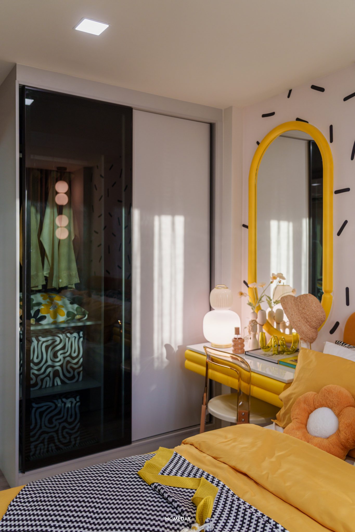 ฝั่งที่ติดกับห้องน้ำจะเป็นตำแหน่งของตู้เสื้อผ้า ทำให้หลังอาบน้ำสามารถเดินออกมาแต่งตัวได้สะดวก ตู้ที่ให้มาเป็นแบบ สูงจรดฝ้า ใช้เก็บของได้เต็มพื้นที่ โดยหน้าบานฝั่งหนึ่งออกแบบเป็นกระจกสีชา ช่วยสะท้อนแสงและเพิ่มความโปร่งให้กับห้อง ภายในยังแบ่งช่องเก็บของไว้ให้เป็นระเบียบ เหมือนกับห้องตัวอย่างที่เราได้เห็นเลยครับ
