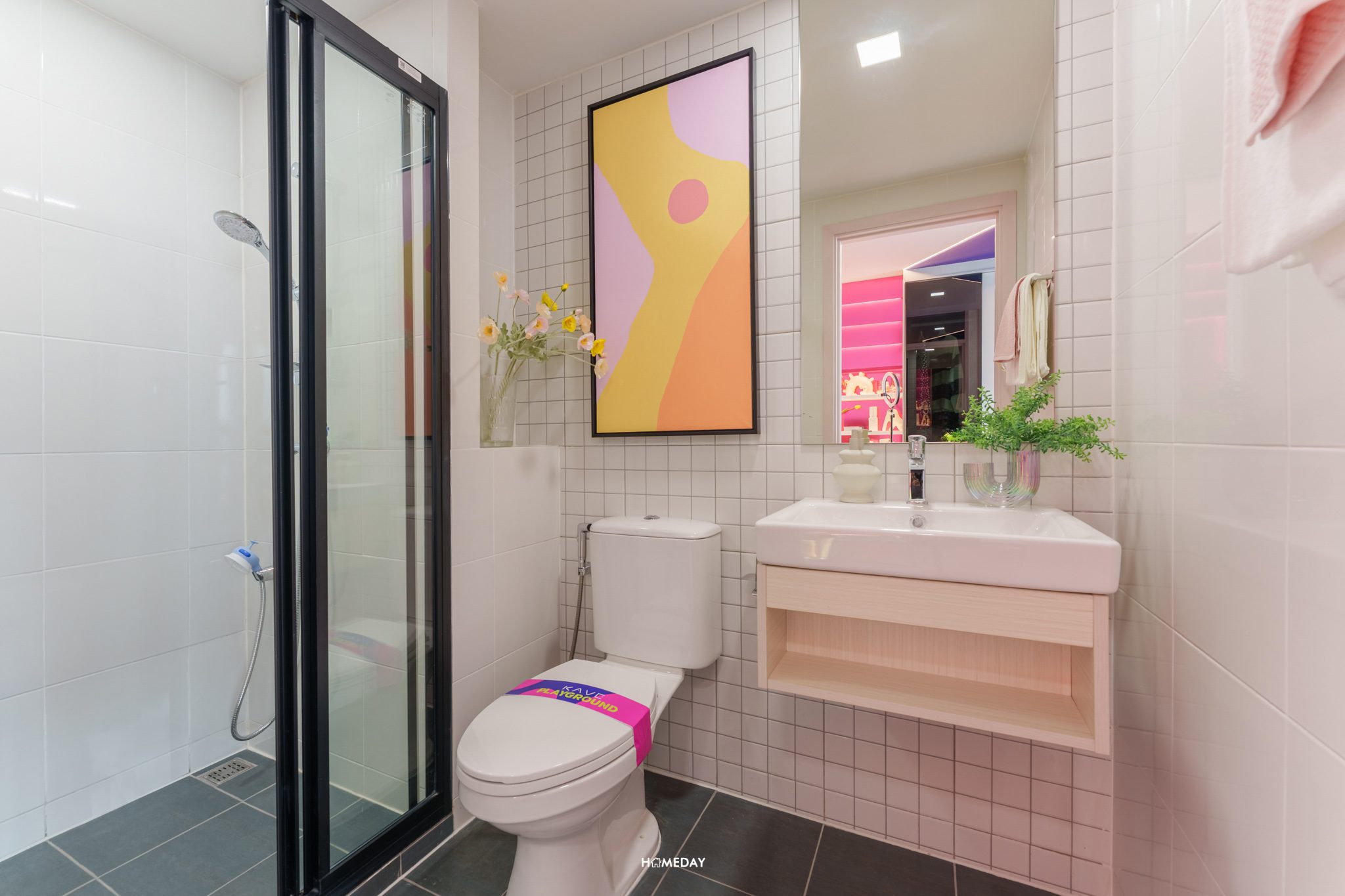 ห้องน้ำของห้องนี้จะอยู่ภายในห้องนอน เดินเข้า-ออกสะดวก โดยเฉพาะเวลากลางคืนไม่ต้องผ่านโซนอื่น ภายในห้องน้ำ แยกส่วนเปียกและแห้งไว้เรียบร้อย พร้อมชุดสุขภัณฑ์ครบเหมือนในห้องตัวอย่าง มีฉากกั้นอาบน้ำติดตั้งมาให้ พร้อมใช้งานได้เลย