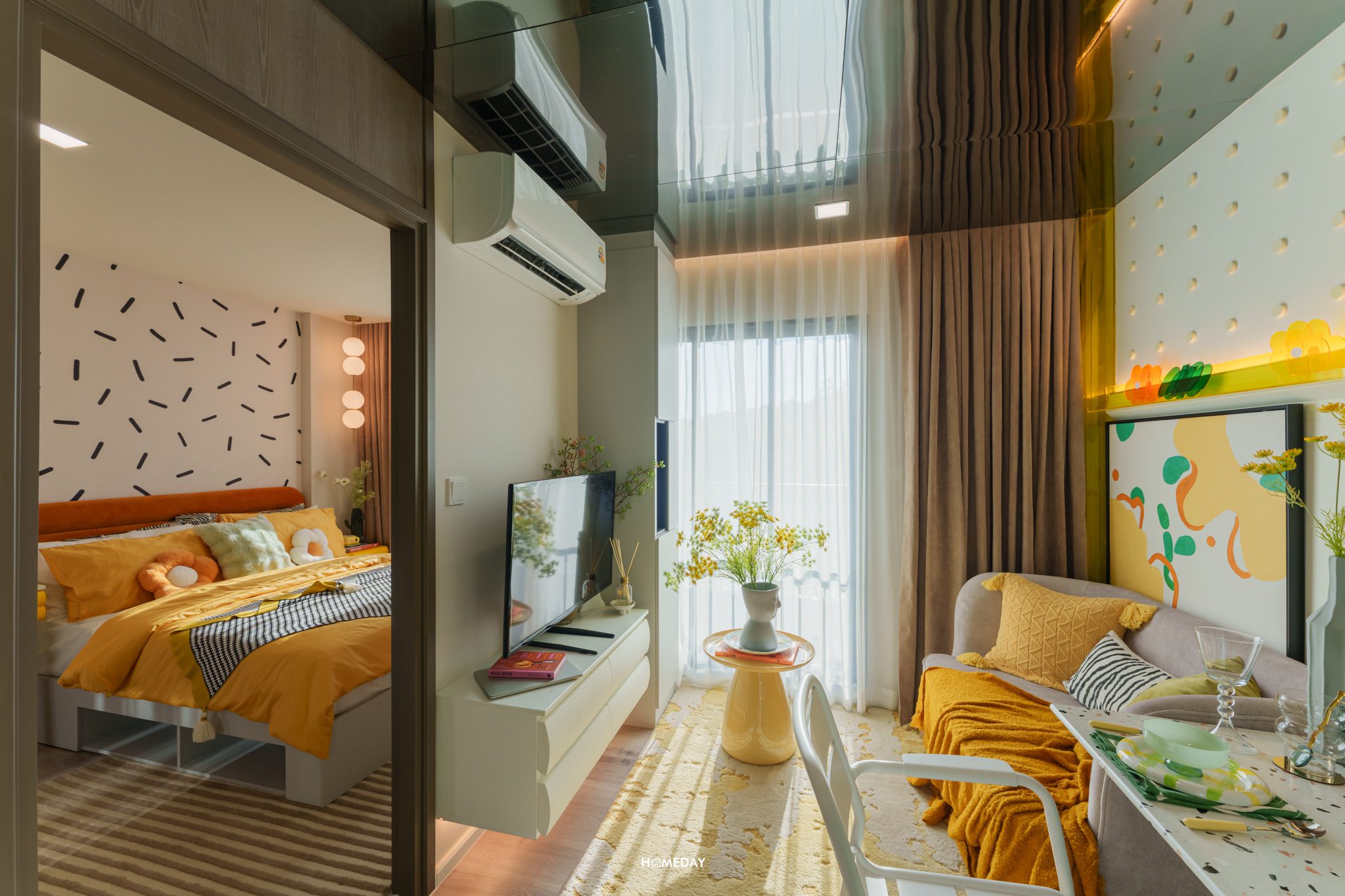 เมื่อเข้ามาภายในห้อง จะเจอกับพื้นที่เปิดโล่งที่ รวมห้องนั่งเล่นและห้องนอนเข้าไว้ในโซนเดียวกัน ให้ความรู้สึกโปร่งสบาย ด้วยหน้าต่างบานใหญ่ที่เปิดรับแสงธรรมชาติเข้ามาเต็ม ๆ ในโซนนั่งเล่นมีพื้นที่ใช้งานพอดี วางโซฟา 2 ที่นั่งได้ลงตัว พร้อมเฟอร์นิเจอร์ที่โครงการให้มาครบตามมาตรฐาน ด้วยราคาที่จับต้องได้ และฟังก์ชันที่จัดมาแบบไม่ขาดไม่เกิน ห้องนี้จึงเหมาะสำหรับคนที่อยากเริ่มต้นมีคอนโดเป็นของตัวเองได้ง่าย ๆ ครับ