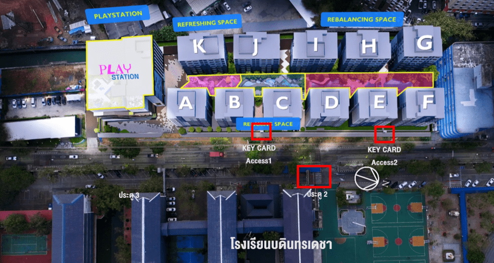 • อาคาร B, C, D, E, F : อยู่ใกล้ประตูเล็ก เดินข้ามทางม้าลายก็ถึงโรงเรียนเลย เหมาะกับน้อง ๆ นักเรียน และผู้ปกครอง