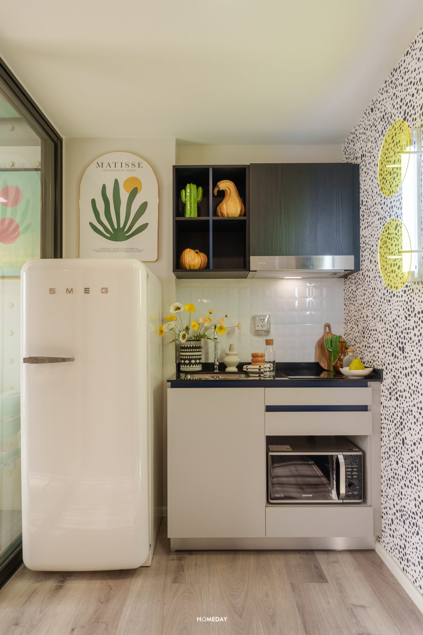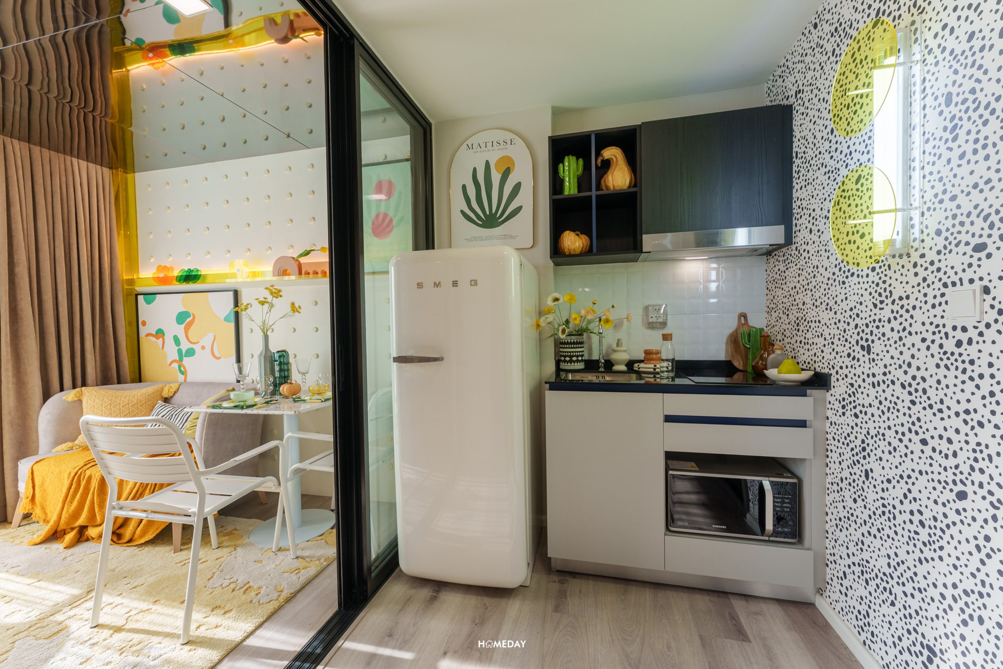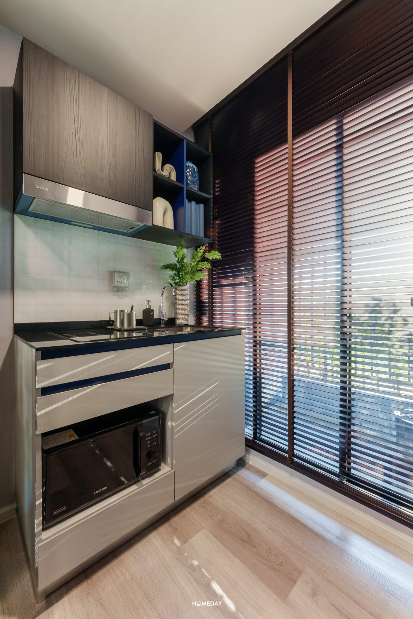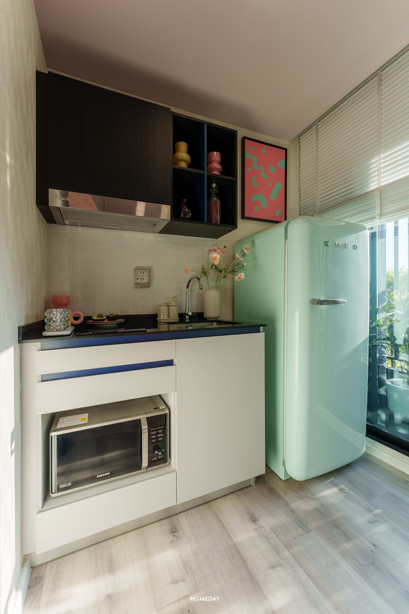 สองส่วนสุดท้ายของห้องนี้ คือ โซนครัวและระเบียง ที่ยังคงให้ฟังก์ชันมาครบไม่แพ้ห้องไทป์อื่น ๆ ในห้องครัวจะได้ชุดเคาน์เตอร์ Built-in พร้อมซิงก์ล้างจาน เตาไฟฟ้า และเครื่องดูดควัน (Hob & Hood) รวมถึงมีช่องสำหรับวางตู้เย็นมาให้เรียบร้อย ระยะใช้งานกำลังดีทำอาหารเบา ๆ ได้สบาย และที่สำคัญคือ เป็นครัวปิด สามารถเลื่อนประตูกระจกปิดเพื่อกันกลิ่นรบกวนโซนพักผ่อนด้านในได้อย่างมีประสิทธิภาพ