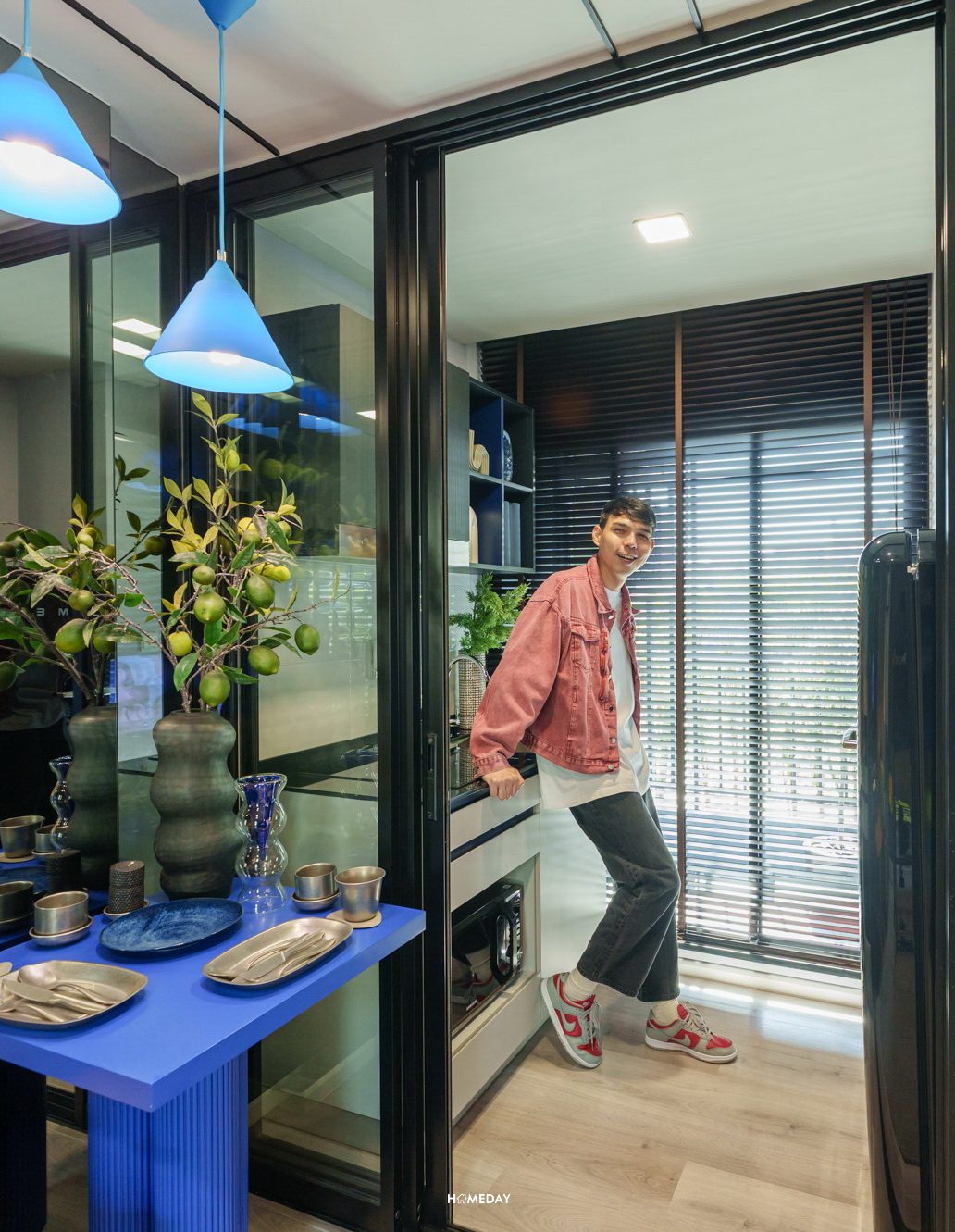 ระหว่างห้องนั่งเล่นกับห้องครัวจะมี ประตูกระจกบานเลื่อน 3 ตอน กั้นพื้นที่ให้เป็นสัดส่วน ตัวประตูสูงจรดฝ้า และช่วยป้องกันกลิ่นอาหารไม่ให้รบกวนโซนพักผ่อนครับ