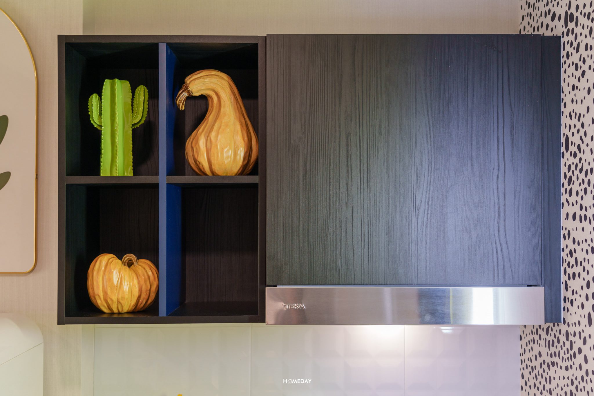 นอกจากนี้ยังมีตู้ลอยด้านบนแบบ Built-in มาให้ด้วย สำหรับใช้เก็บของในครัว ช่วยให้พื้นที่ดูเรียบร้อยและใช้งานได้จริงมากขึ้นครับ