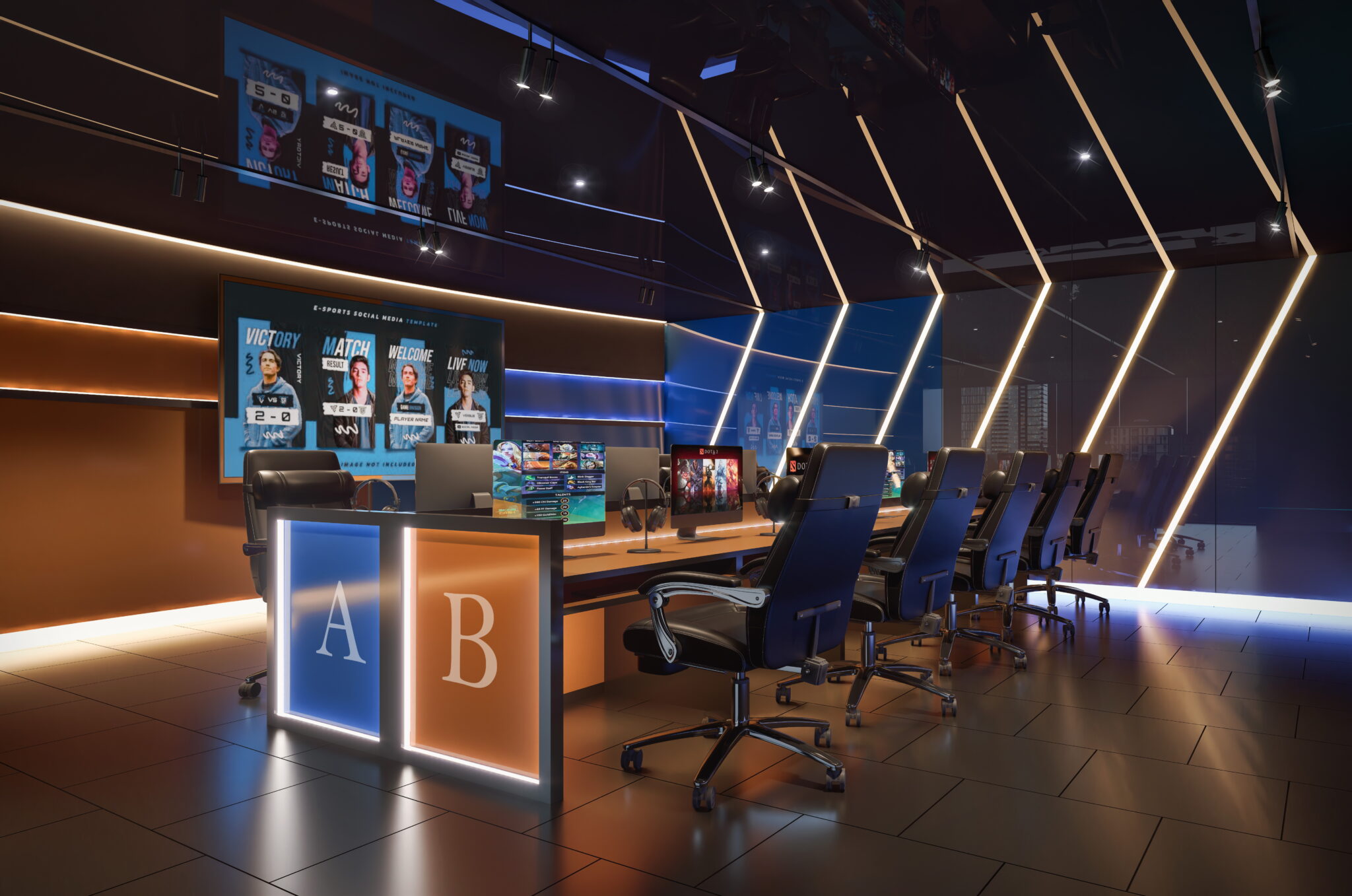 ภาพจำลองบรรยากาศของ Online Battle Room หรือ E-Sport Room ห้องเล่นเกมที่ตกแต่งเหมือนร้านเกมจริง ๆ มีคอมฯ พร้อมให้นั่งเล่นกับเพื่อนแบบจัดเต็ม แถมดีไซน์ยังเท่ด้วยไฟเส้นทันสมัย ใครสายเกมเมอร์มานั่งรวมแก๊งกันตรงนี้ได้เลยครับ สนุกแน่นอน!
