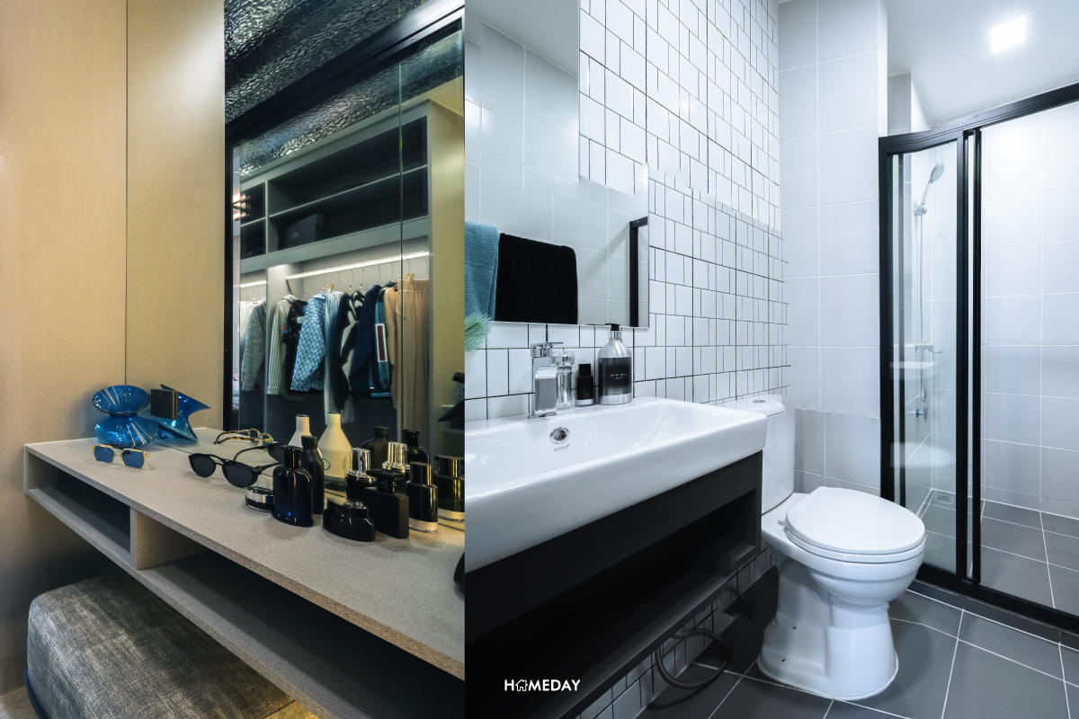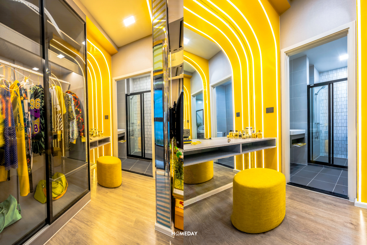 ถึงแม้ว่าจะเป็นห้องที่เล็กที่สุดในบรรดาห้องตัวอย่างทั้งหมดที่เราพามาชมบรรยากาศกันในวันนี้ แต่ห้องนี้ก็มี Walk-in Closet ด้วยนะครับ ฟังก์ชันจะคล้ายกับห้อง 26.40 ตร.ม. แต่ย่อส่วนลงมาหน่อย โดยส่วนของตู้เสื้อผ้าจะได้เป็น 2 บานประตูแบบกระจกสไลด์แทน ซ้ายมือเป็นระเบียงของห้องเหมือนเดิม ส่วนขวามือก็ได้โต๊ะเครื่องแป้งแบบเดียวกันเลยครับ