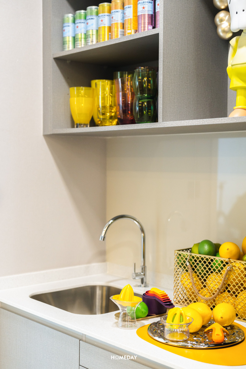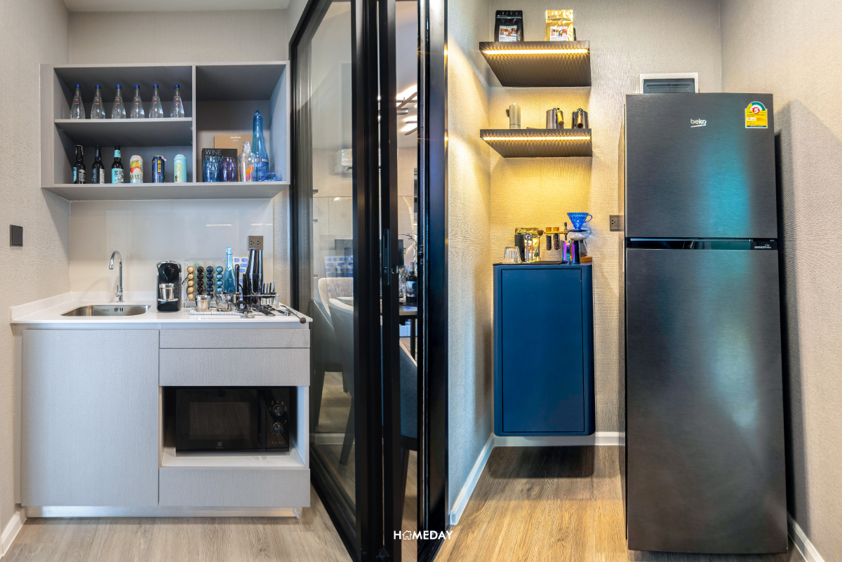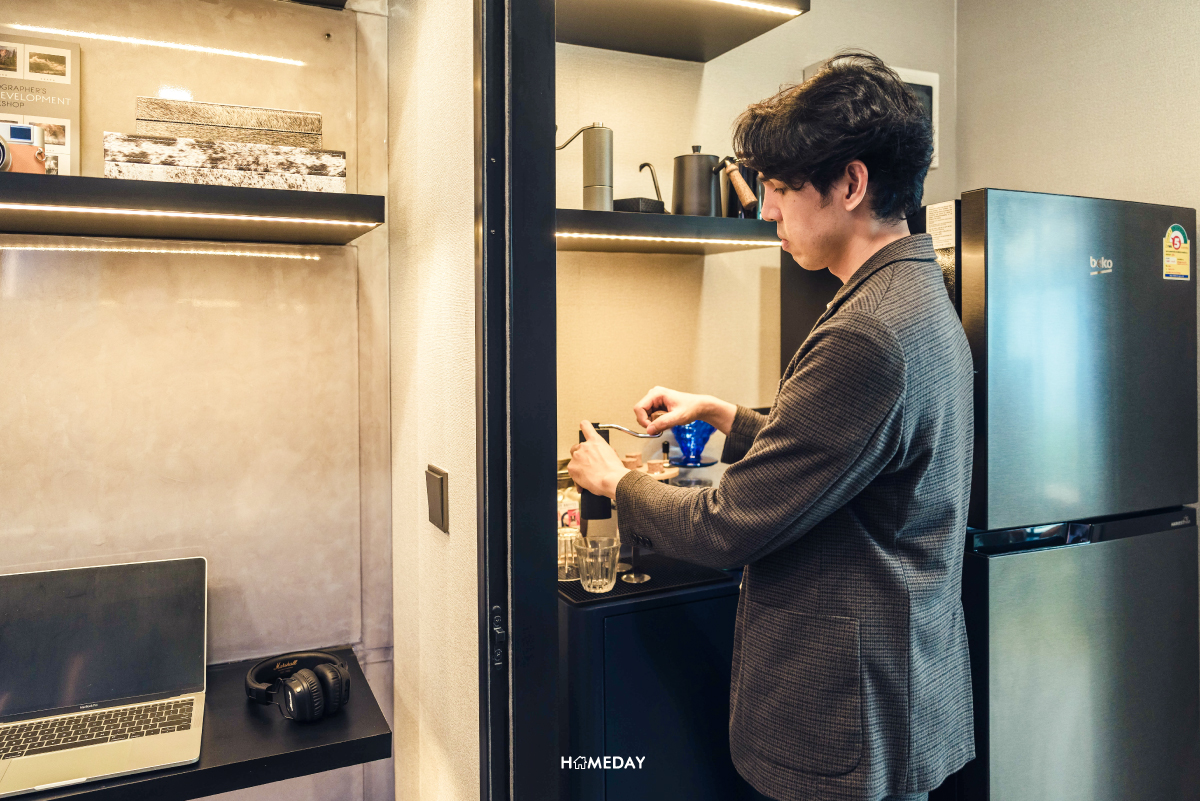 ทำเป็นมุมชงกาแฟ วางขนม กำลังเหมาะเลยครับ หรือใครอยู่คนเดียว จะเพิ่มเก้าอี้สตูลบาร์พร้อมโต๊ะพับได้ติดผนัง ไว้เป็นมุมนั่งทานข้าวก็สามารถทำได้ครับ