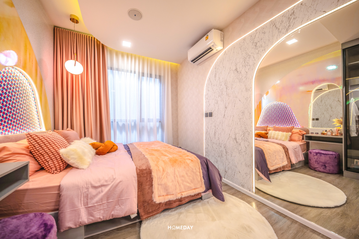 มาดูห้องนอนกันบ้างครับ สำหรับห้องนี้ ที่เน้นพื้นที่นั่งเล่นมากเป็นพิเศษ ทำให้ในส่วนของห้องนอนจะไม่ได้มีโซน Walk-in Closet นะครับ แต่ก็ยังได้ความสะดวกสบายอยู่ สำหรับห้องนี้เราจะได้ฐานเตียง ที่มาพร้อมช่องเก็บของด้านใต้ ช่วยเพิ่มพื้นที่จัดเก็บ ได้ท็อปโต๊ะเครื่องแป้งบิลต์อิน ไม่กินพื้นที่