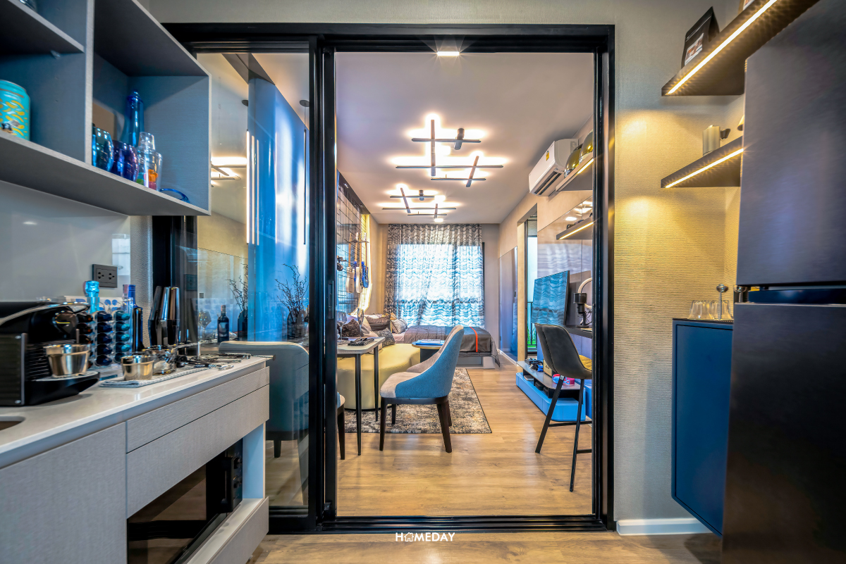 มาปิดท้ายที่ห้องขนาด 23.70 ตร.ม. กันครับ ห้องนี้ลักษณะแปลน คล้ายกันกับห้อง 26.40 ตร.ม. ครับ แต่ย่อไซซ์ลงมาเล็กน้อย และแน่นอนว่าฟังก์ชันยังใส่มาให้แบบจัดเต็มอยู่เหมือนเดิมครับ โดยเมื่อเราเข้ามาภายในห้อง ก็จะมาอยู่ในพื้นที่ครัวปิดก่อนเลย ซ้ายมือได้เป็นเคาน์เตอร์ครัว, ชั้นวางของ และ Backsplash เหมือนกับห้องอื่น ๆ ครับ ด้านข้างเว้นช่องไว้ให้วางตู้เย็นได้พอดิบพอดี ส่วนทางด้านขวามีพื้นที่เหลือให้บิลต์ชั้นวางของเพิ่มเติมได้ครับ