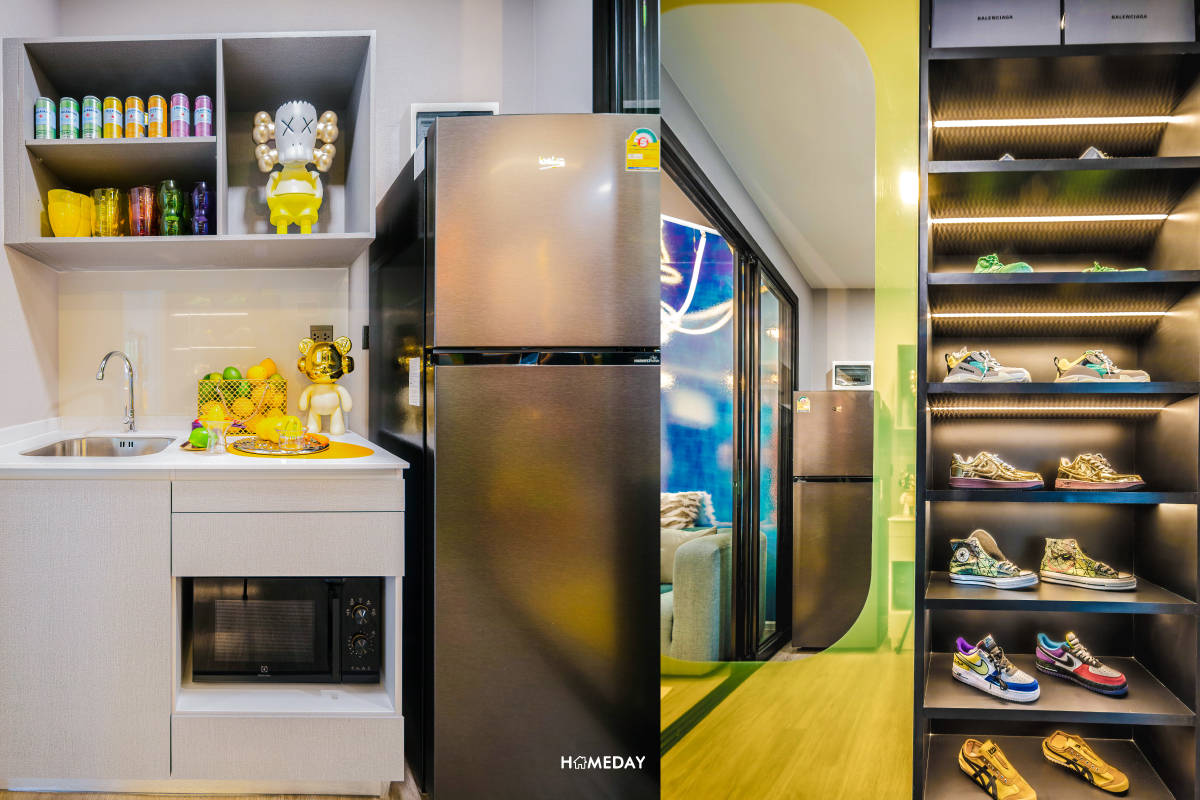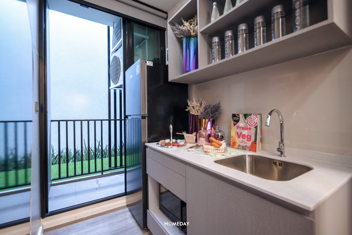 ปิดท้ายห้องนี้ด้วยพื้นที่ครัวติดระเบียง ภายในจะได้เคาน์เตอร์ครัวพร้อมอ่างล้างหน้า ได้ฟังก์ชันบานตู้ ลิ้นชัก และช่องวางไมโครเวฟเหมือนในห้องตัวอย่างทุกประการครับ ส่วนผนังก็กรุกระเบื้อง Backsplash ไว้ให้ เวลาทำอาหารแล้วคราบสกปรกกระเด็นโดนก็เช็ดทำความสะอาดสบาย ส่วนชั้นวางของเหนือเคาน์เตอร์ครัว ก็ได้ตามนี้เลยเช่นกัน ใช้เก็บอุปกรณ์ทำอาหาร ภาชนะ ชุดเครื่องครัวได้ ห้องนี้เหมาะมากกับคนที่ชอบทำอาหารทานเองเป็นประจำครับ เพราะไม่ต้องกังวลเรื่องกลิ่นมาก เปิดระเบียงระบายอากาศได้แบบชิลล์ ๆ