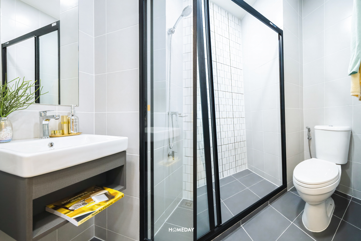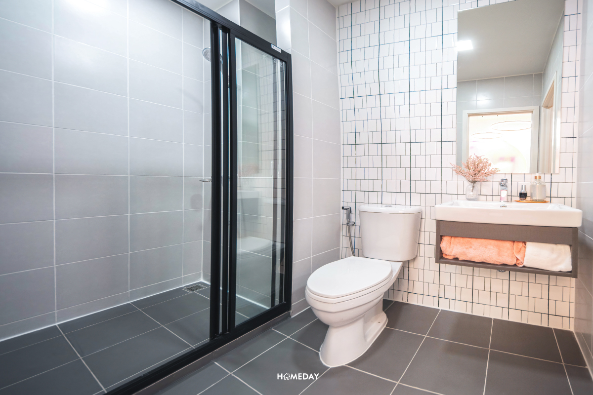 ห้องน้ำของห้องไทป์นี้ ถือว่ากว้างเลยครับ โซนเปียกจะอยู่ซ้ายมือด้านใน มี Hand Shower พร้อม Drop Wall สำหรับวางของเอาไว้ให้ กั้นด้วยกระจกบานเลื่อน ใช้งานได้อย่างเป็นสัดส่วน ทางด้านของโซนแห้งก็มีโถสุขภัณฑ์พร้อมสายชำระ และอ่างล้างหน้าอยู่ติดกัน ท็อปอ่างมีพื้นที่วางของด้านบนเล็กน้อย ส่วนด้านใต้บิลต์เป็นช่องเอาไว้ให้ ใช้เก็บของได้เหมือนกันครับ