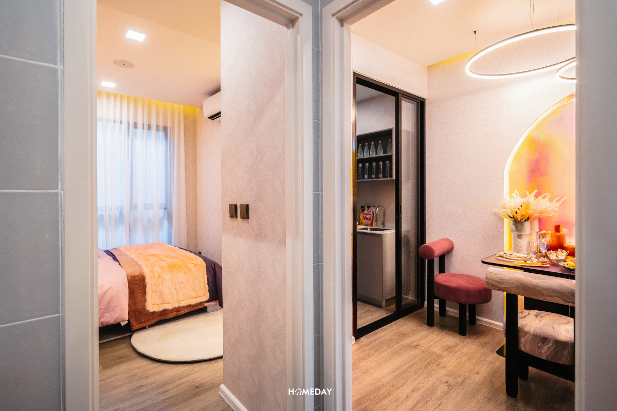 มาต่อที่อีกห้องกันเลยครับ ห้องนี้มีขนาดเล็กกว่าห้องแรกเล็กน้อย แต่แปลนค่อนข้างต่างกันครับ สำหรับห้องก่อนหน้านี้ ตัวแปลนจะมีความเป็นสัดส่วน แยกแต่ละพื้นที่ออกจากกัน แต่สำหรับห้องนี้ เราจะได้ความโฟลว์ของพื้นที่มากขึ้น ซึ่งช่วยรับแสงได้ดี ดูปลอดโปร่งเลยล่ะครับ โดยพื้นที่แรกที่เราเข้ามายืนภายในห้อง จะเป็นส่วนของห้องครัวปิด ที่กั้นด้วยประตูกระจกบานสไลด์ ไม้ให้กลิ่นไปรบกวนพื้นที่พักผ่อนด้านในครับ มองตรงไปห้องจริงจะเป็นพื้นที่โล่ง ๆ ตอนลึก ที่มีฐานเตียงวางไว้ให้ด้านในสุดอยู่ติดกับหน้าต่าง ขวามือจะมีทางเชื่อมไปยังพื้นที่อีกส่วนหนึ่ง ซึ่งเดี๋ยวเราจะพาไปดูกันครับ