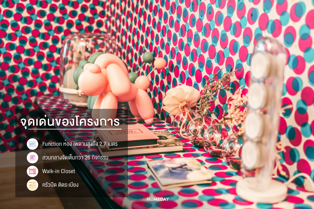 จุดเด่นโครงการ • Function ห้อง เพดานสูงถึง 2.7 เมตร โปร่ง โล่ง ดีต่อกาย สบายต่อใจ
