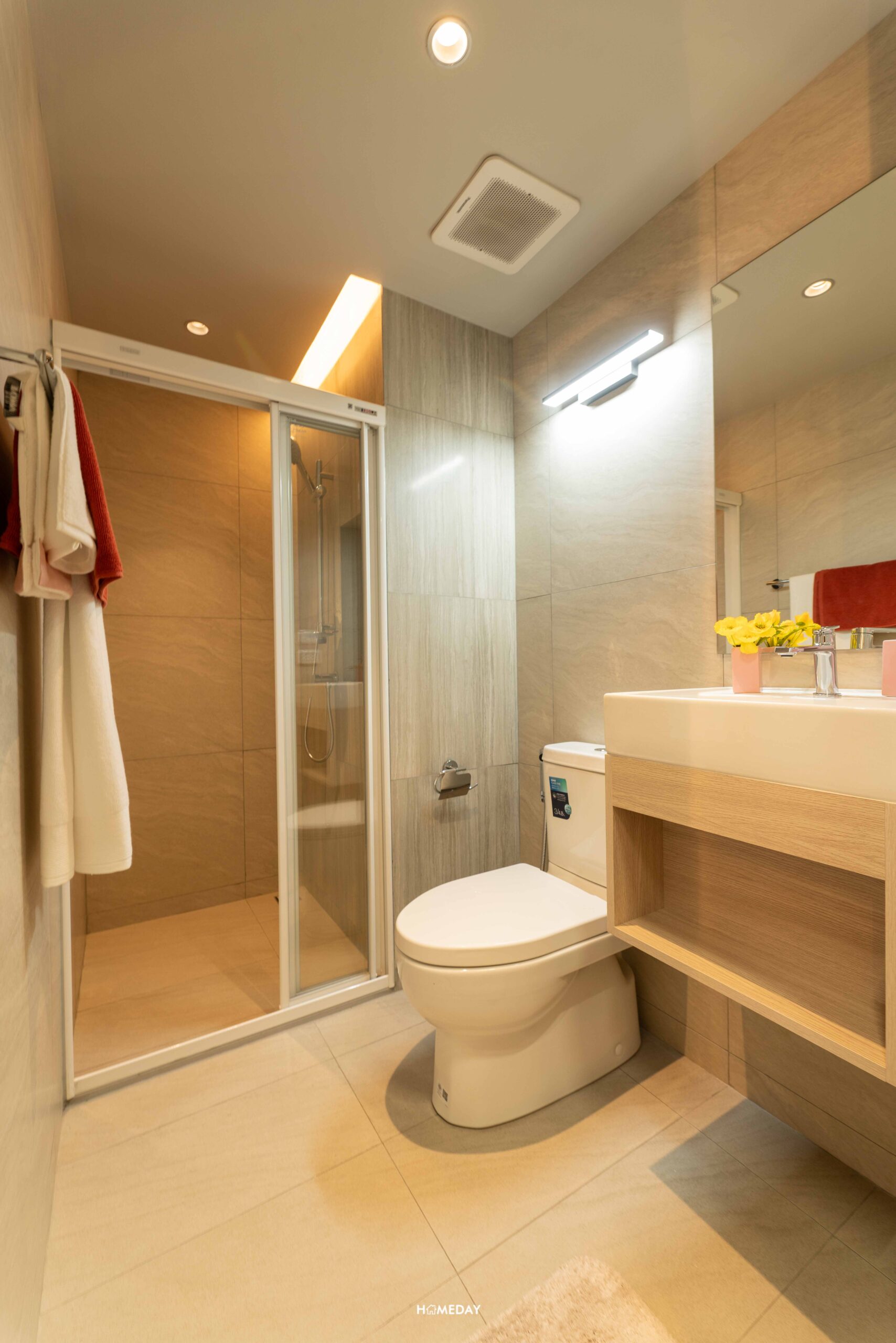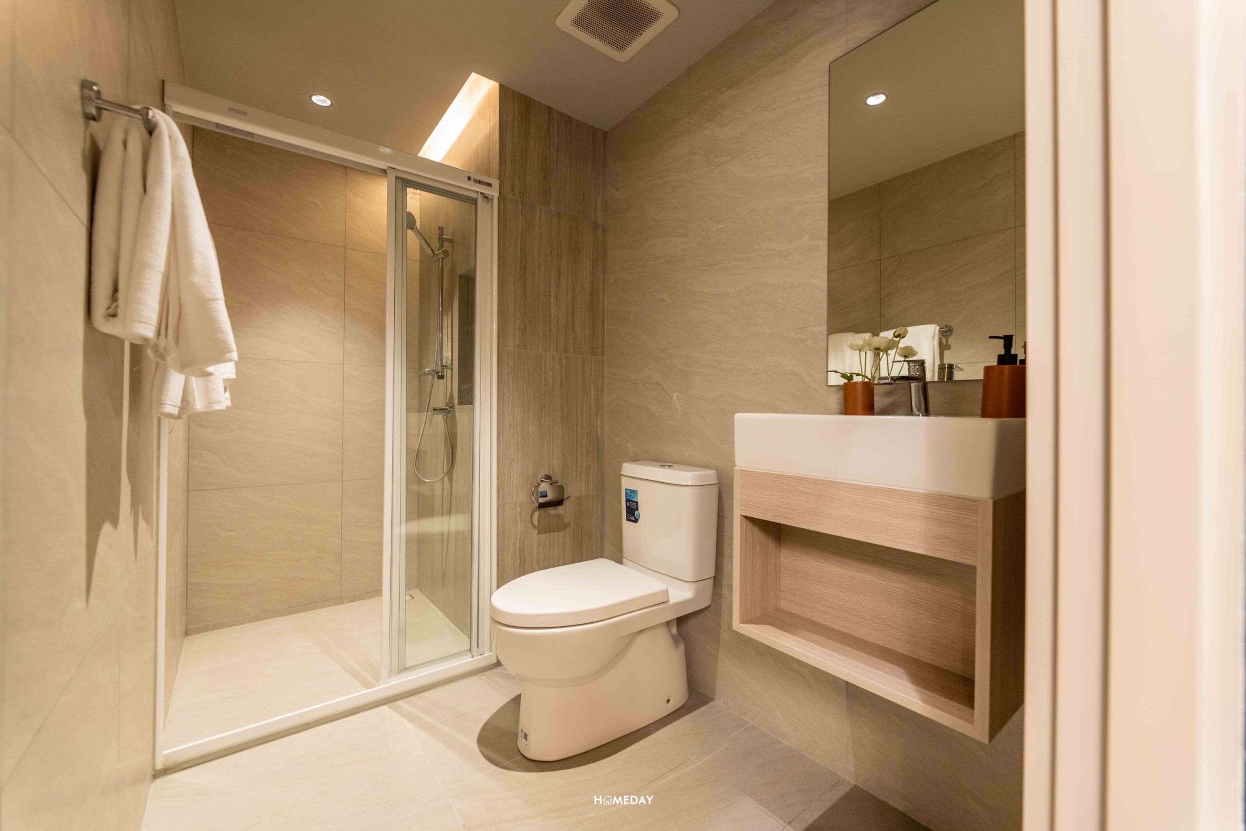 สำหรับห้องน้ำเป็นห้องตอนลึก ซึ่งทางโครงการมีการกั้นแบ่งแยกส่วนแห้ง-ส่วนเปียกด้วยกระจกฉากกั้นอาบน้ำแบบ 3 ตอนมาให้ และชุดสุขภัณฑ์มาตรฐานเป็นแบบ Two-piece ระบบ Dual Flush พร้อมสายฉีดชำระและที่แขวนกระดาษชำระสเตนเลสครบเซต ได้อ่างล้างหน้า-ล้างมือพร้อมที่เก็บของใต้อ่าง และกระจกเงามาให้ ส่วนภายใน Shower Box มีฝักบัวปรับระดับและ Drop Wall ไว้วางพวกขวดครีมอาบน้ำ แชมพู และครีมนวดมาให้ พร้อมพัดลมระบายอากาศแบบฝังฝ้า และวางงานระบบไฟไว้รองรับเครื่องทำน้ำอุ่นมาให้เรียบร้อย