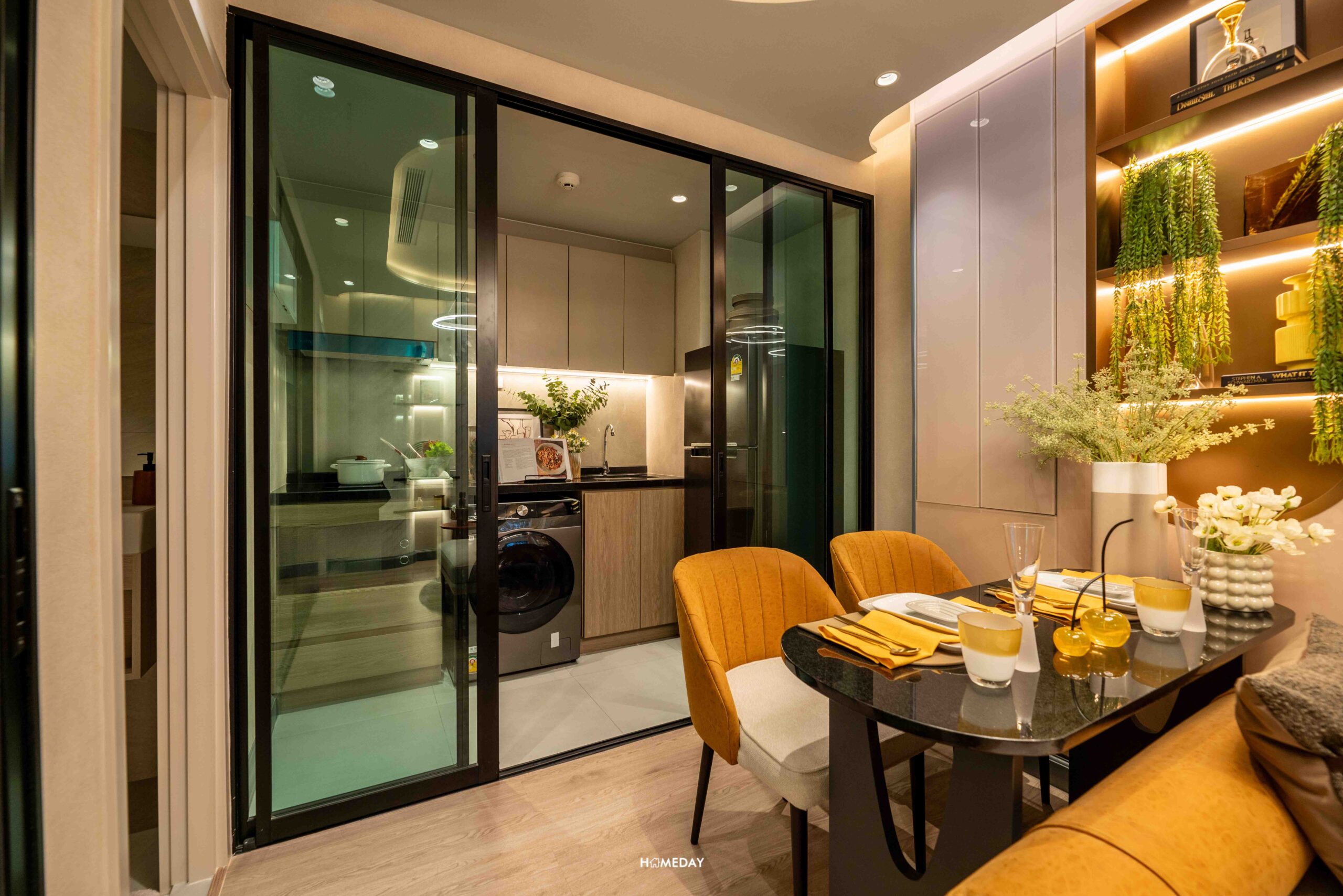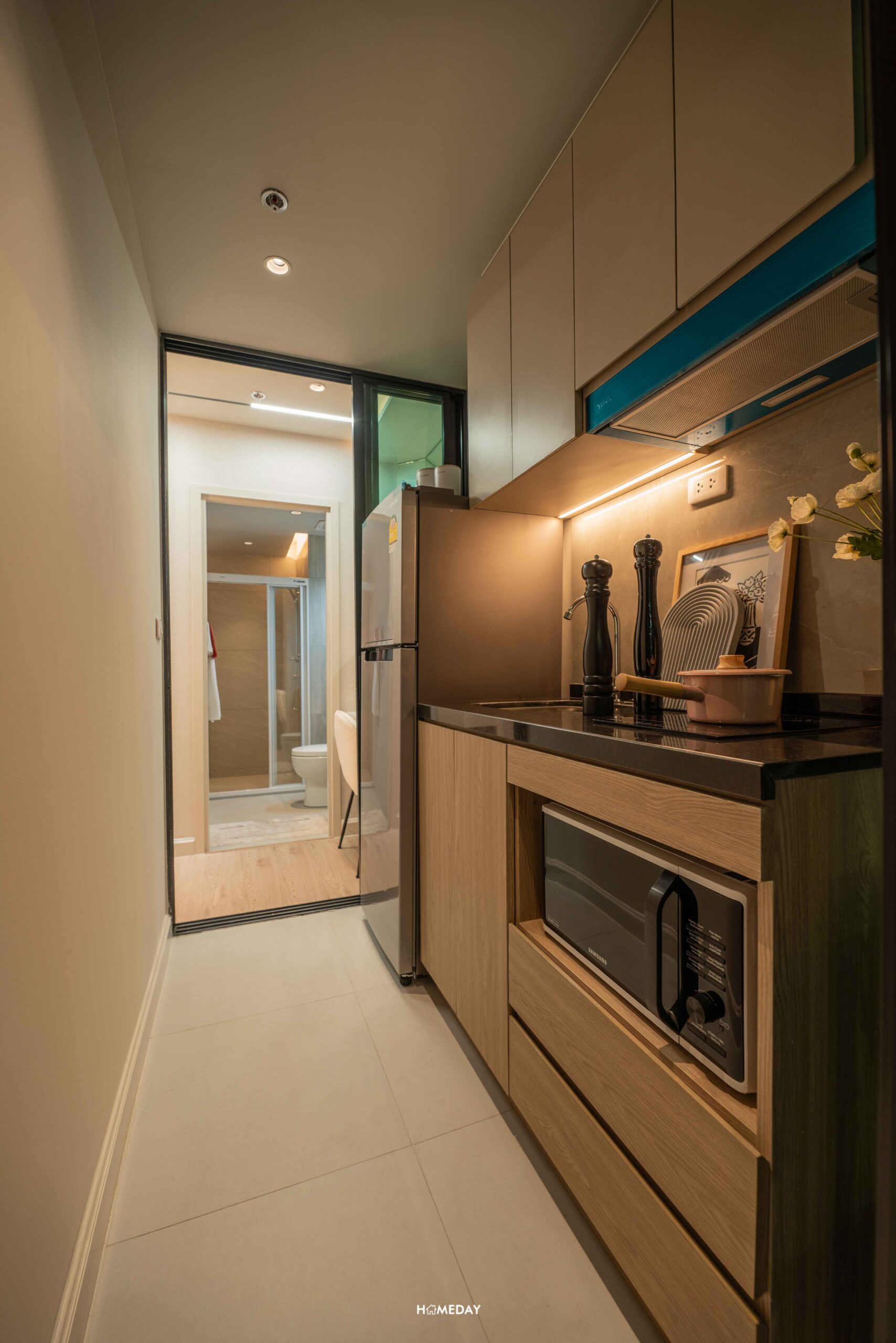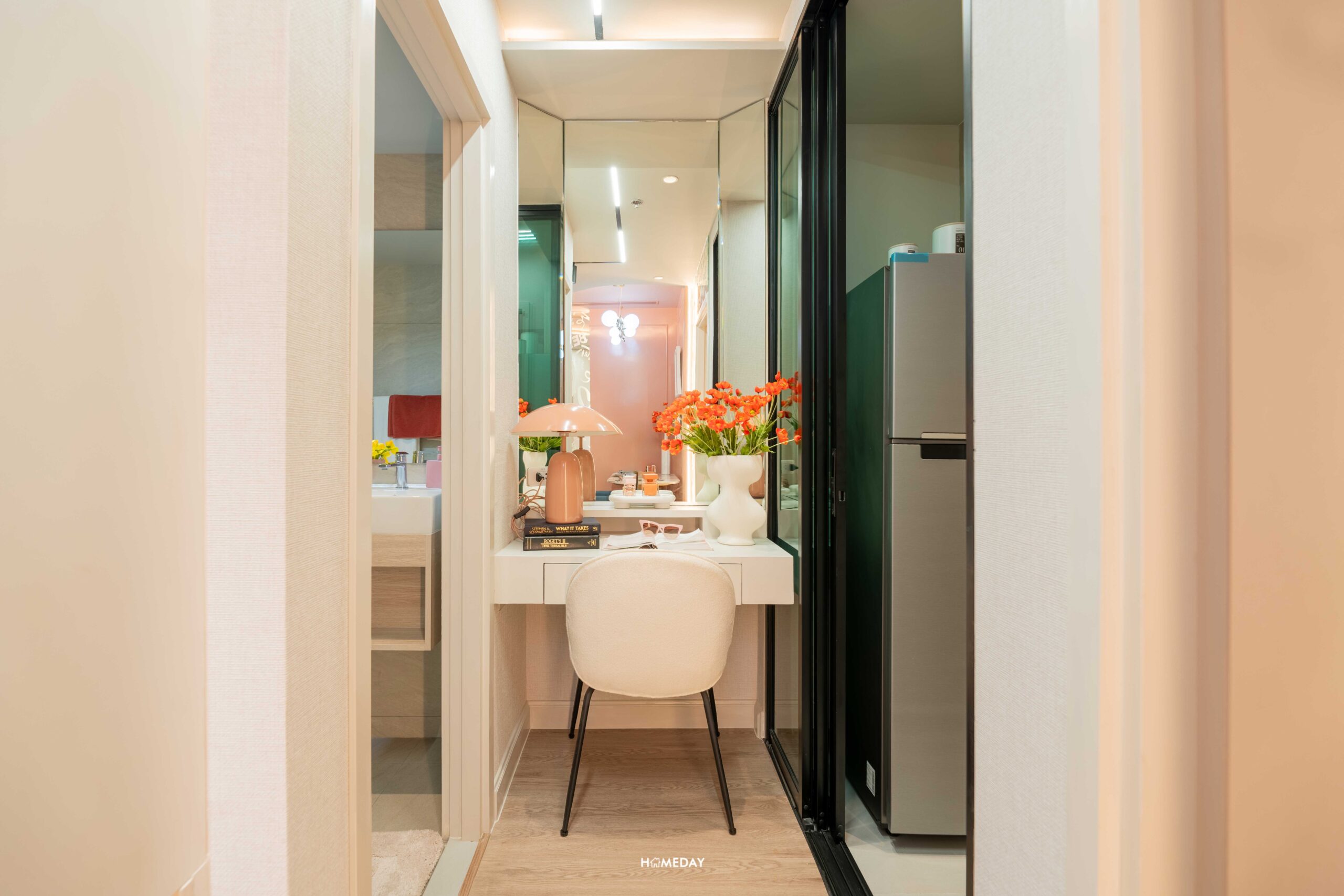 ออกมาจากห้องนอน มากันตรงพื้นที่ระหว่างห้องน้ำและห้องครัว ห้องตัวอย่างออกแบบมาให้ดูเป็นไอเดีย บิลต์อินโต๊ะเครื่องแป้ง พร้อมกระจกเงาบานใหญ่ได้ หรือจะทำเป็นโซนทำงาน WFH บิลต์อินตู้เสื้อผ้าแบบ Walk-in Closet ที่เชื่อมต่อกับห้องน้ำได้อย่างสะดวก ก็สามารถทำได้เช่นกันครับ