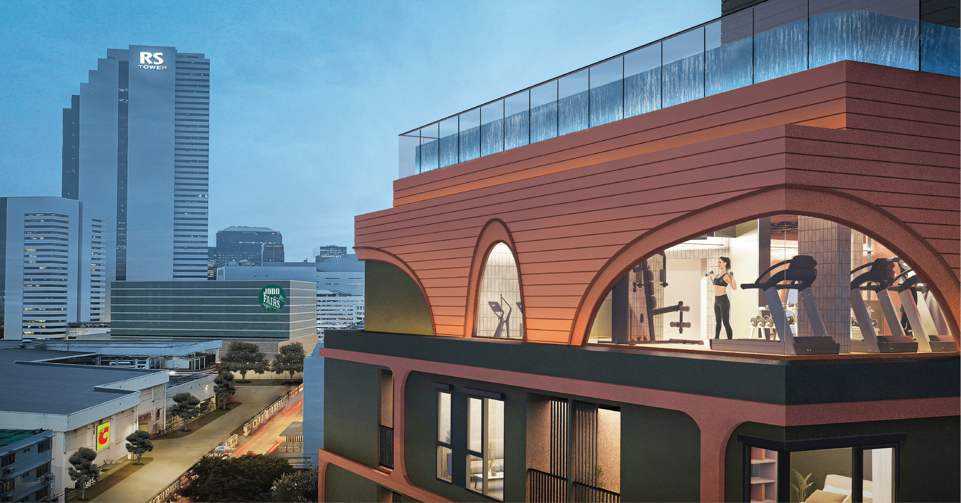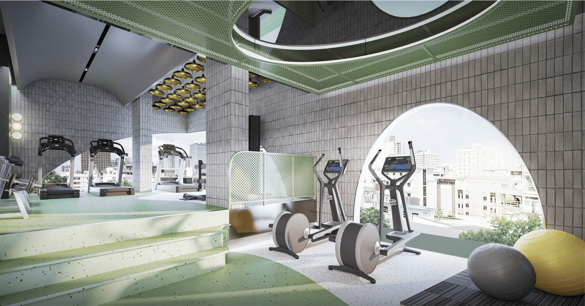 ชั้น 7 ส่วนกลางจะเป็น Active Fitness Room ขนาดใหญ่ได้วิวเมือง การออกแบบภายในยังคงเน้นเส้นโค้ง มีเล่นระดับเป็นสเต็ปขั้นบันได พร้อมเครื่องออกกำลังกายที่ครบครันทุกส่วน ไม่ว่าจะเป็น Weight Training, Cardio และ Yoga Ball ด้วยครับ