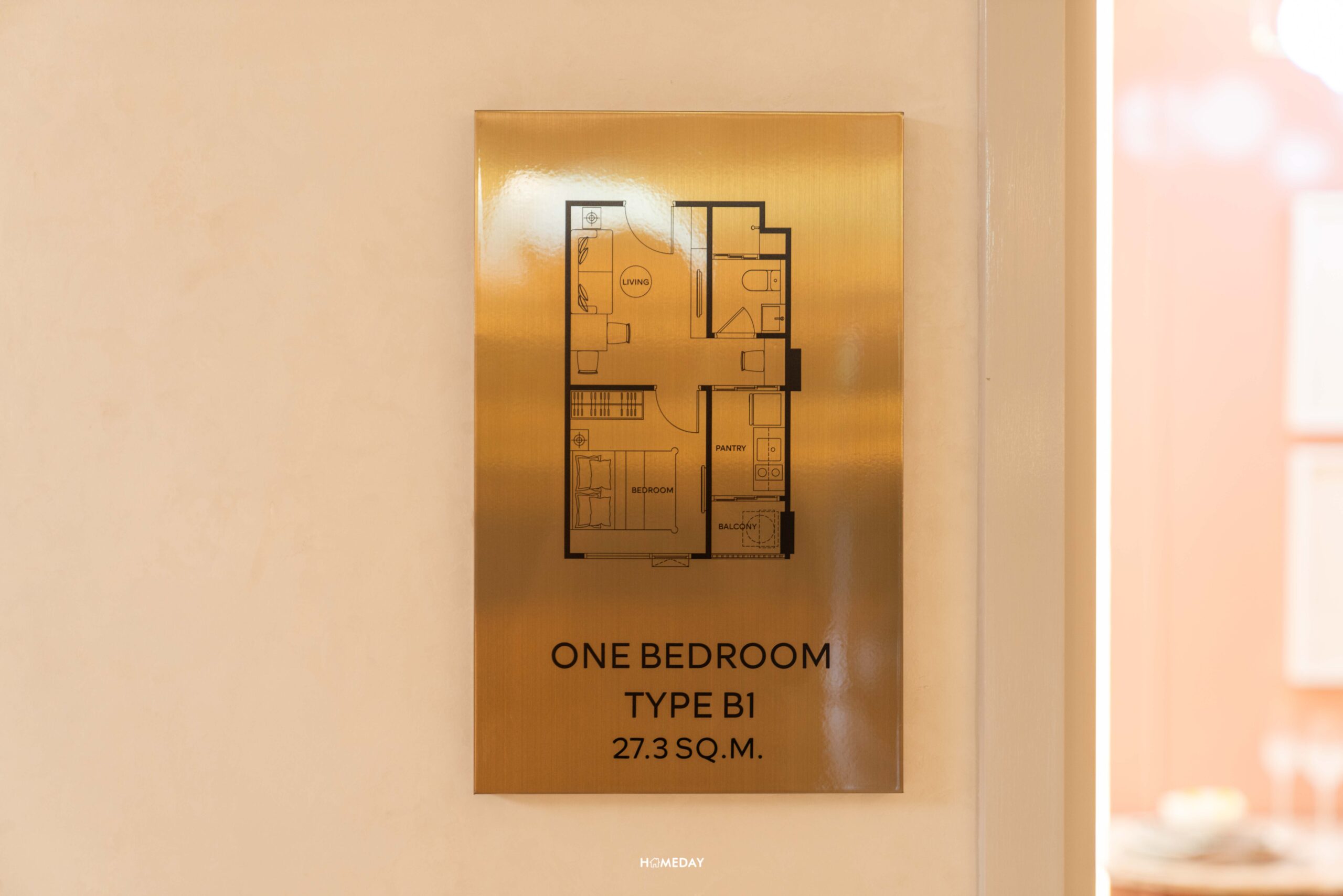 มาต่อที่อีกห้องกันเลยครับ ห้องนี้เป็น One Bedroom Type B1 ขนาดไซซ์ใหญ่กว่าขนาดเริ่มต้นมาเล็กน้อย แต่มีขนาดย่อมกว่าแบบ One Bedroom Plus ไซซ์แบบแรกที่รีวิวไปครับ โดยมีพื้นที่ใช้สอย 27.30 ตารางเมตร สำหรับห้องนี้ตามแปลนจะเป็นห้องตอนลึก แบ่งฟังก์ชันเป็นสัดส่วน โดยส่วนแรกจะเป็น Living & Dining Zone ด้านในสุดตรงไปจะเป็นห้องนอน ซ้ายมือจะเป็นห้องน้ำ และจุดเด่นของห้องนี้ได้ห้องครัวปิดที่ติดระเบียงอีกด้วยครับ เหมาะสำหรับคนที่ชอบทำอาหาร ช่วยเรื่องระบายอากาศและกลิ่นได้ดี โดยไม่ต้องกลัวกลิ่นเข้าไปรบกวนในโซนนั่งเล่นพักผ่อนเลยครับ