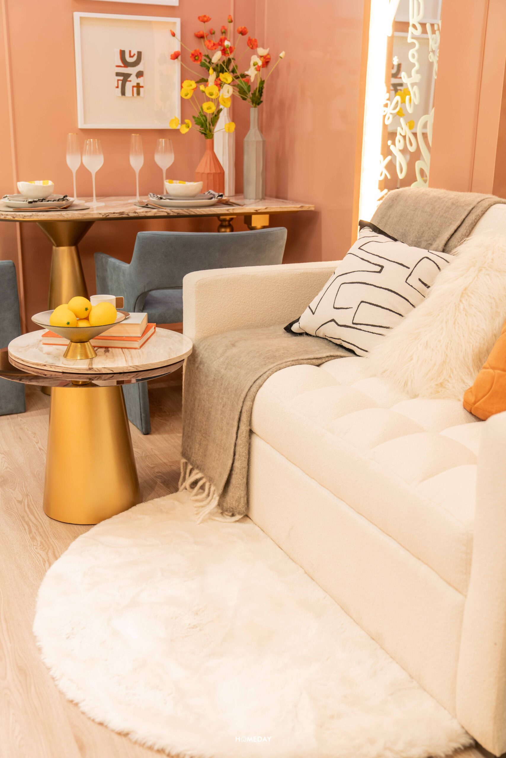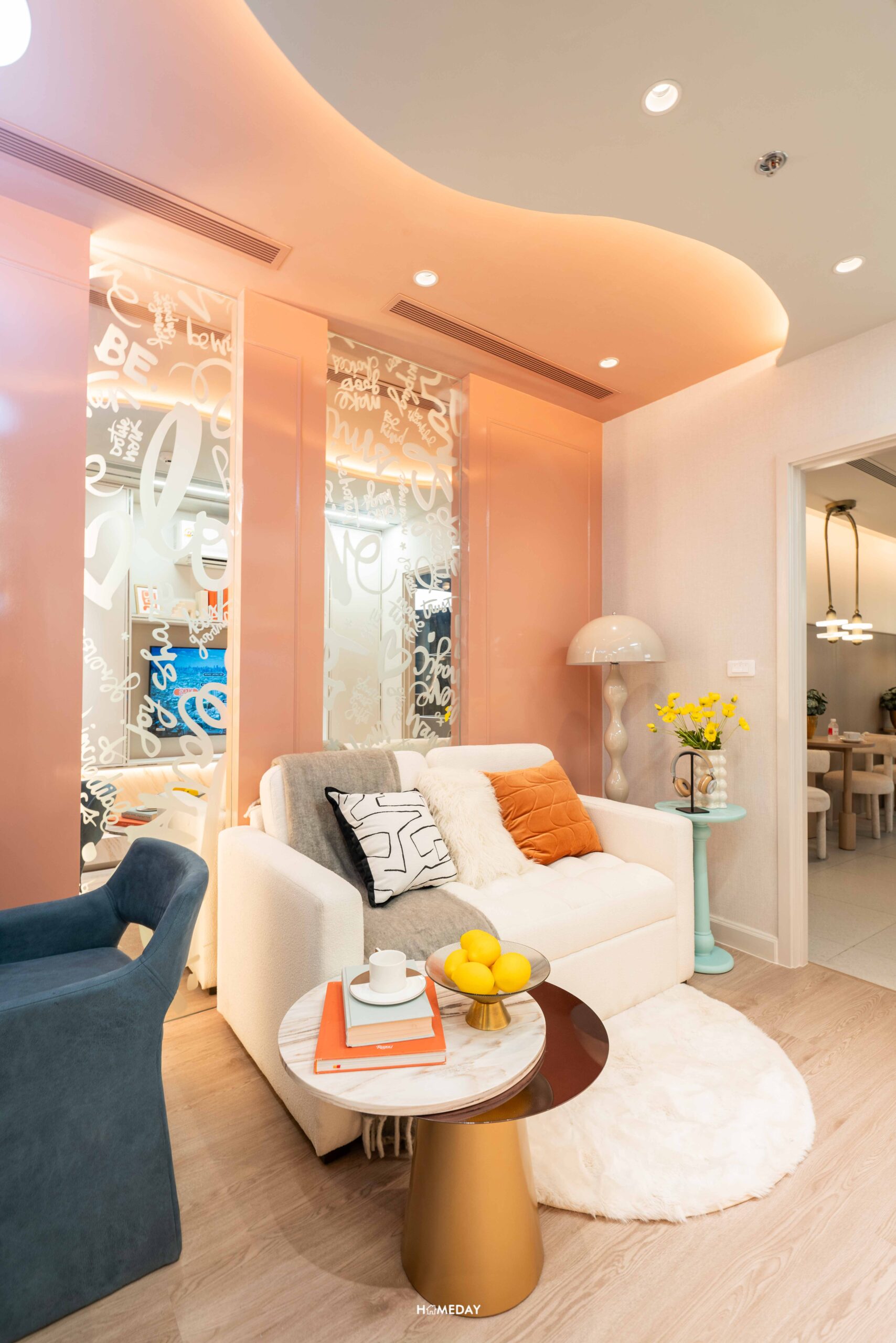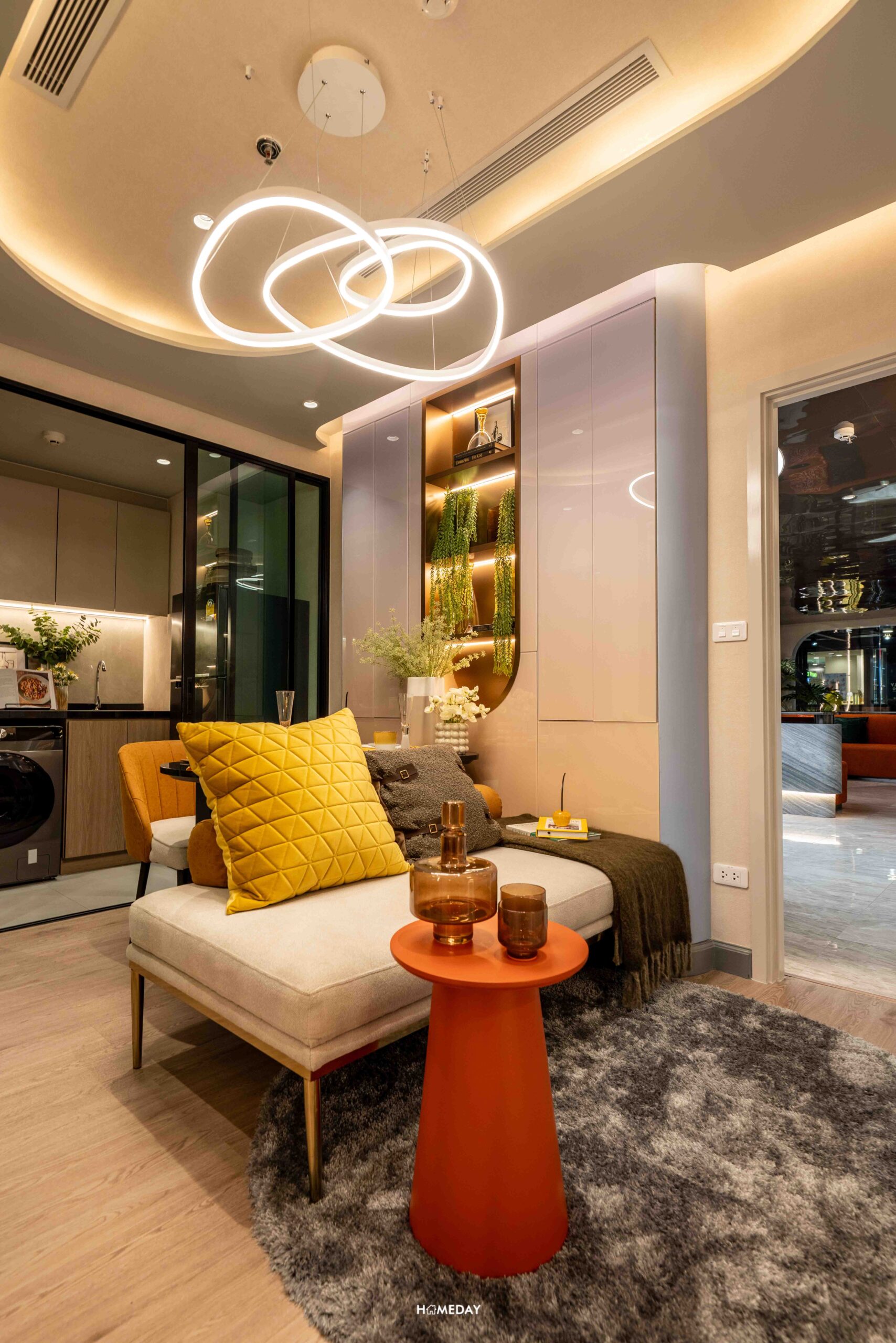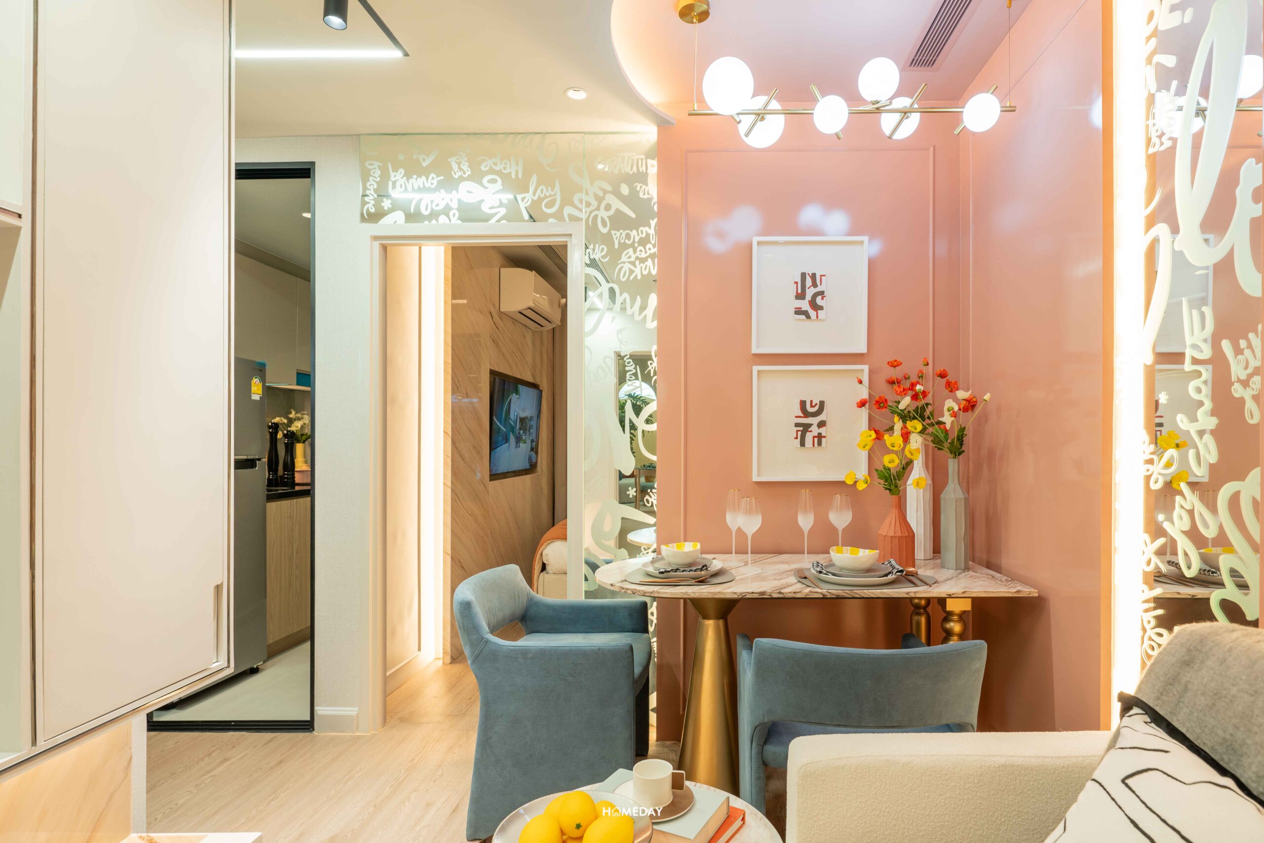 บริเวณพื้นที่นั่งเล่นที่วางโซฟาขนาด 2 ที่นั่ง, โต๊ะกลางขนาดพอเหมาะ และโต๊ะข้างโซฟาไว้วางของตกแต่ง หรือไว้วางโคมไฟตั้งพื้น ติดกันก็จะเป็นโต๊ะทานอาหารแบบเข้ามุม 2 นั่ง สามารถออกตกแต่งได้ตามสไตล์ของแต่ละคนได้ครับ