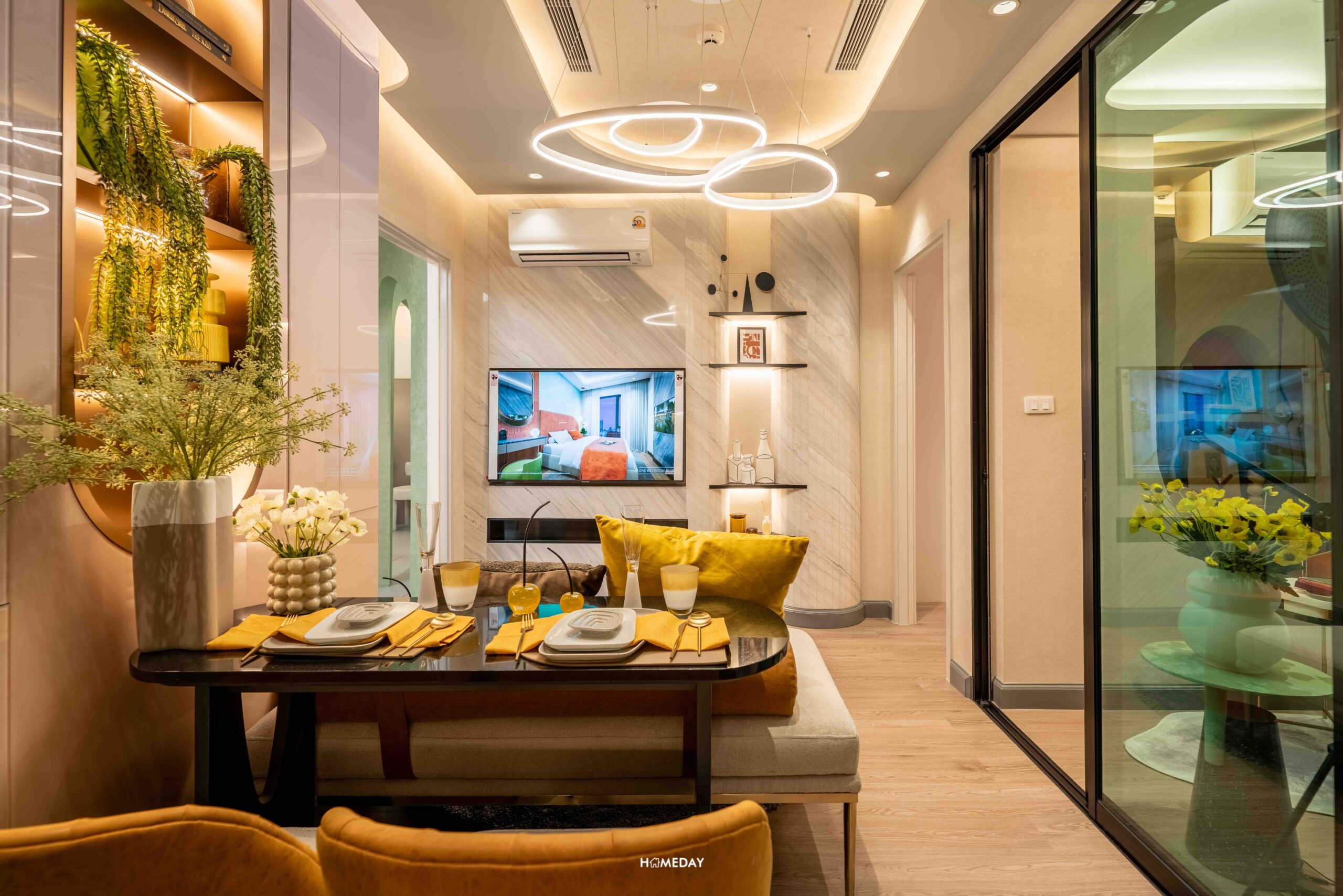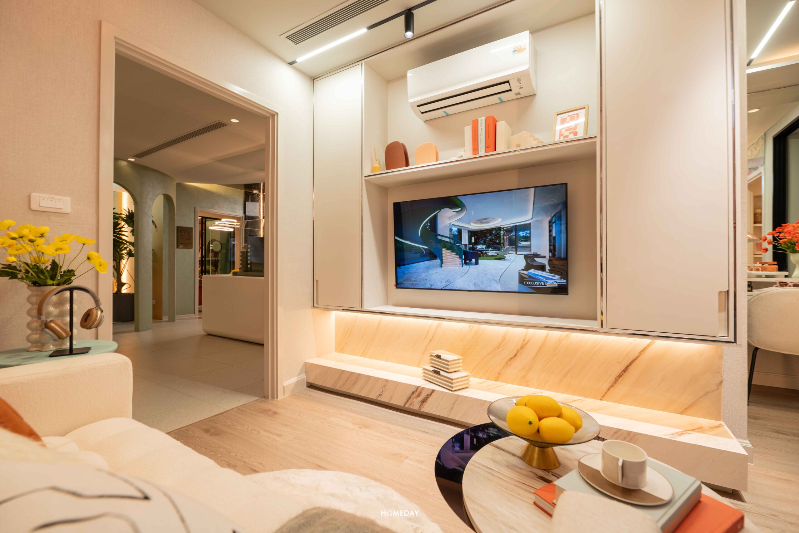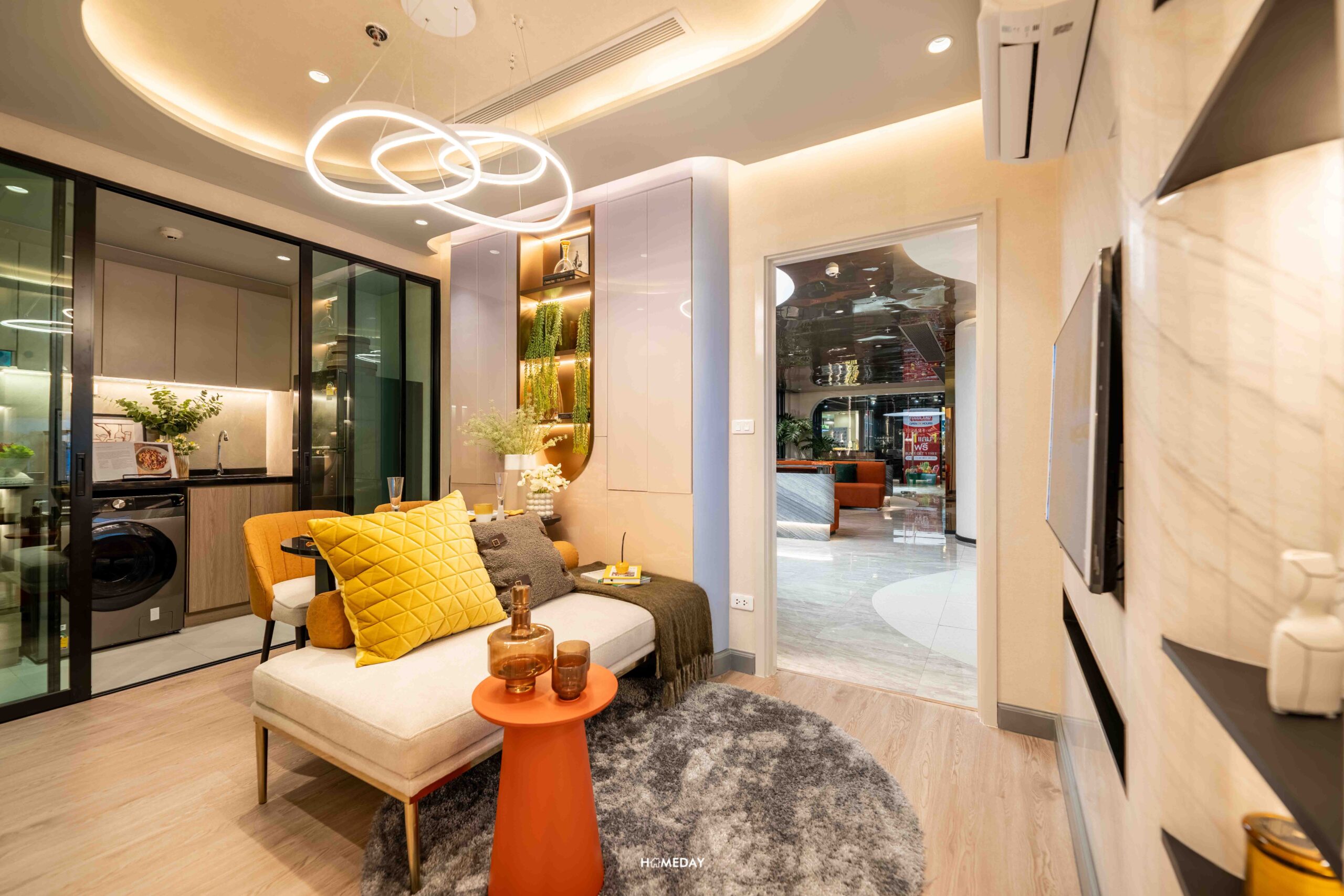 เข้ามาด้านในจะเจอกับ Living Zone พื้นที่นั่งเล่นหรือรับแขก สามารถวางโซฟาขนาด 2 ที่นั่งกำลังดี หรือจะเป็นโซฟาตัวยาวก็ได้ครับ หรือจะเสริมโต๊ะทานอาหารเข้ามุมขนาด 2 ที่นั่ง ก็ยังมีพื้นที่เหลือให้เลื่อนเก้าอี้เข้า-ออกได้อย่างคล่องตัว บริเวณผนังฝั่งตรงข้าม สามารถติดตั้งทีวีแบบแขวน บิลต์อินเพิ่มเติมชั้นโชว์ของสะสม หรือตู้เก็บของก็ทำได้ครับ นำไอเดียห้องตัวอย่างไปประยุกต์ทำได้เลยครับ มีระยะห่างระหว่างทีวีกับพื้นที่นั่งรับชมเป็นระยะที่พอดีเลยครับ สามารถวางโต๊ะกลางเพิ่มเติมได้เดินผ่านเข้า-ออกไม่เกะกะเลย