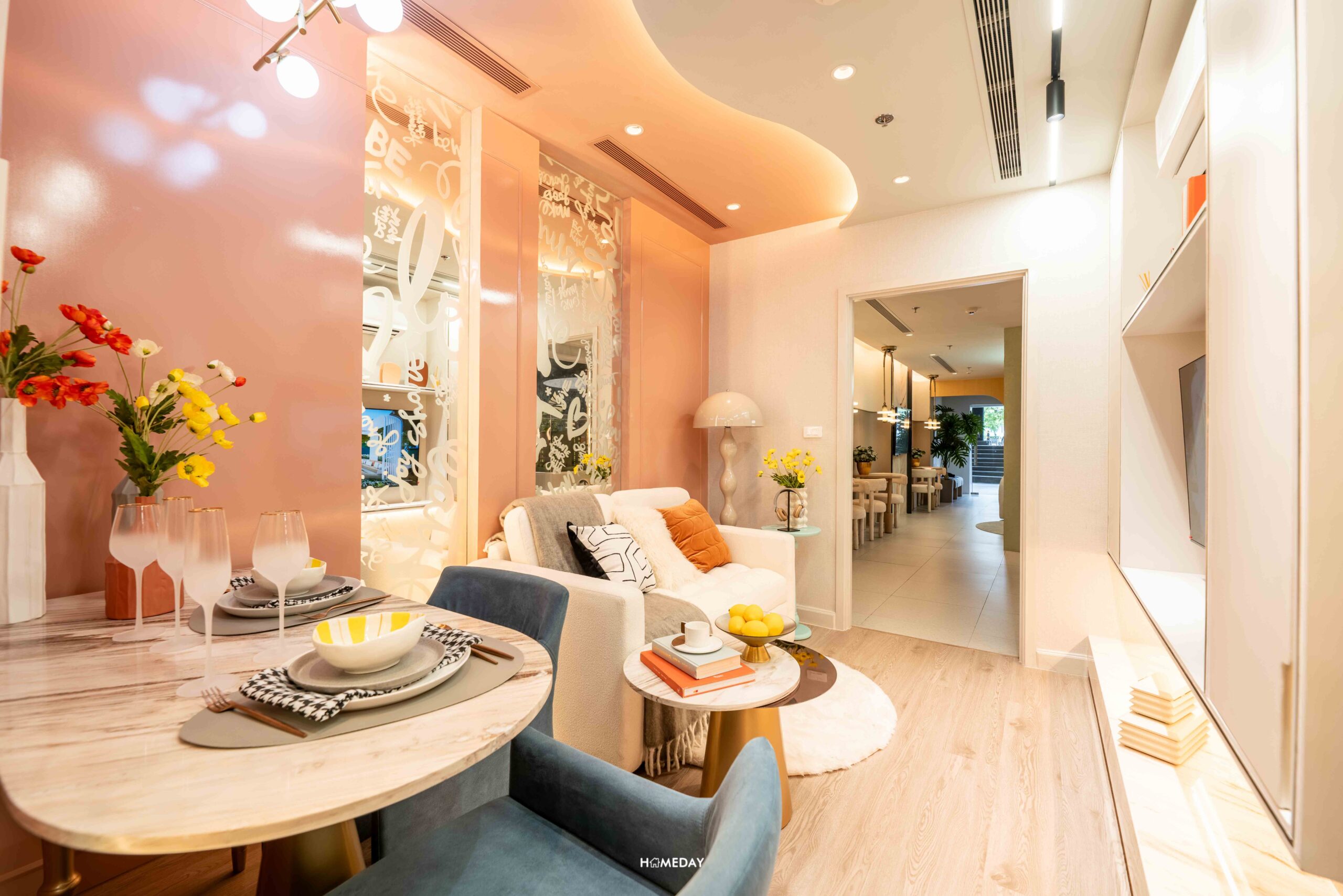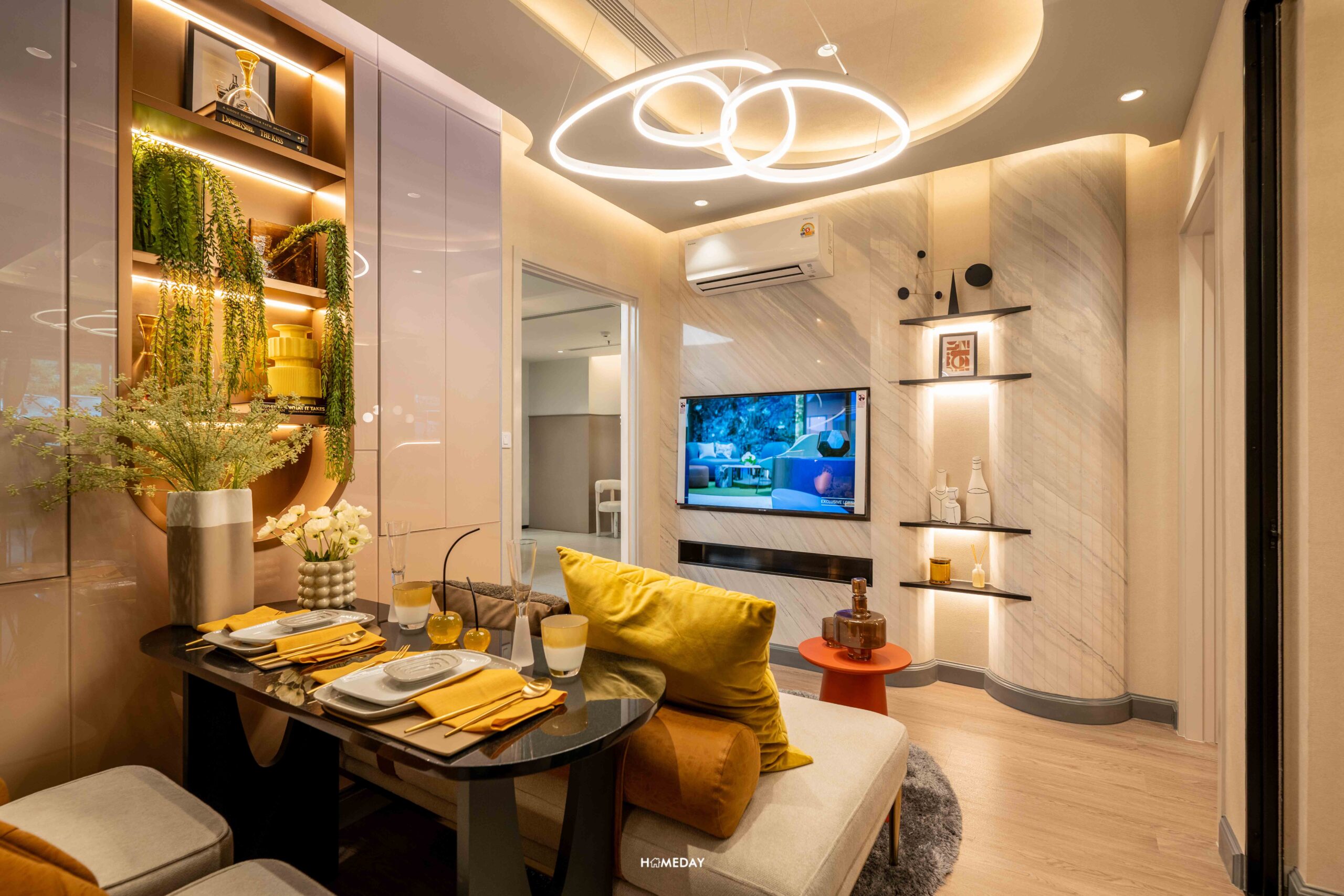 ตัวห้องเปิดเข้ามาจะเจอกับแปลนห้องหน้ากว้าง ฟังก์ชันเป็นสัดส่วนแบ่งเป็นส่วนแรก Living Area ที่สามารถวางโซฟาขนาด 2 ที่นั่ง พร้อมโต๊ะกลางห้องได้อย่างลงตัว ได้ระยะดูทีวีมาอย่างพอดี สามารถติดตั้งทีวีขนาด 40 นิ้วได้เลย บิลต์อินชั้นโชว์ได้ 2 ฝั่งได้ มีระยะใช้งานได้รอบ ๆ เหลือพื้นที่ให้ได้เลื่อนเก้าอี้หรือปรับฟังก์การใช้งานได้สบาย ๆ เชื่อมต่อเปิดโล่งกับโซน Dining Area ที่วางโต๊ะทานอาหารได้ 2 ที่นั่ง สามารถปรับโซฟาเป็นที่นั่งเพิ่มเติมอีก 2 ที่นั่ง รองรับแขกหรือเพื่อนฝูงได้ขนาดกำลังดีเลย ฝั่งผนังตรงโต๊ะทานอาหารและที่นั่งเล่นสามารถบิลต์อิน Drop Wall ไว้เป็นชั้นโชว์ของสะสม หรือจะทำเป็นตู้เก็บของเป็นบานปิด ก็ทำได้เช่นกัน